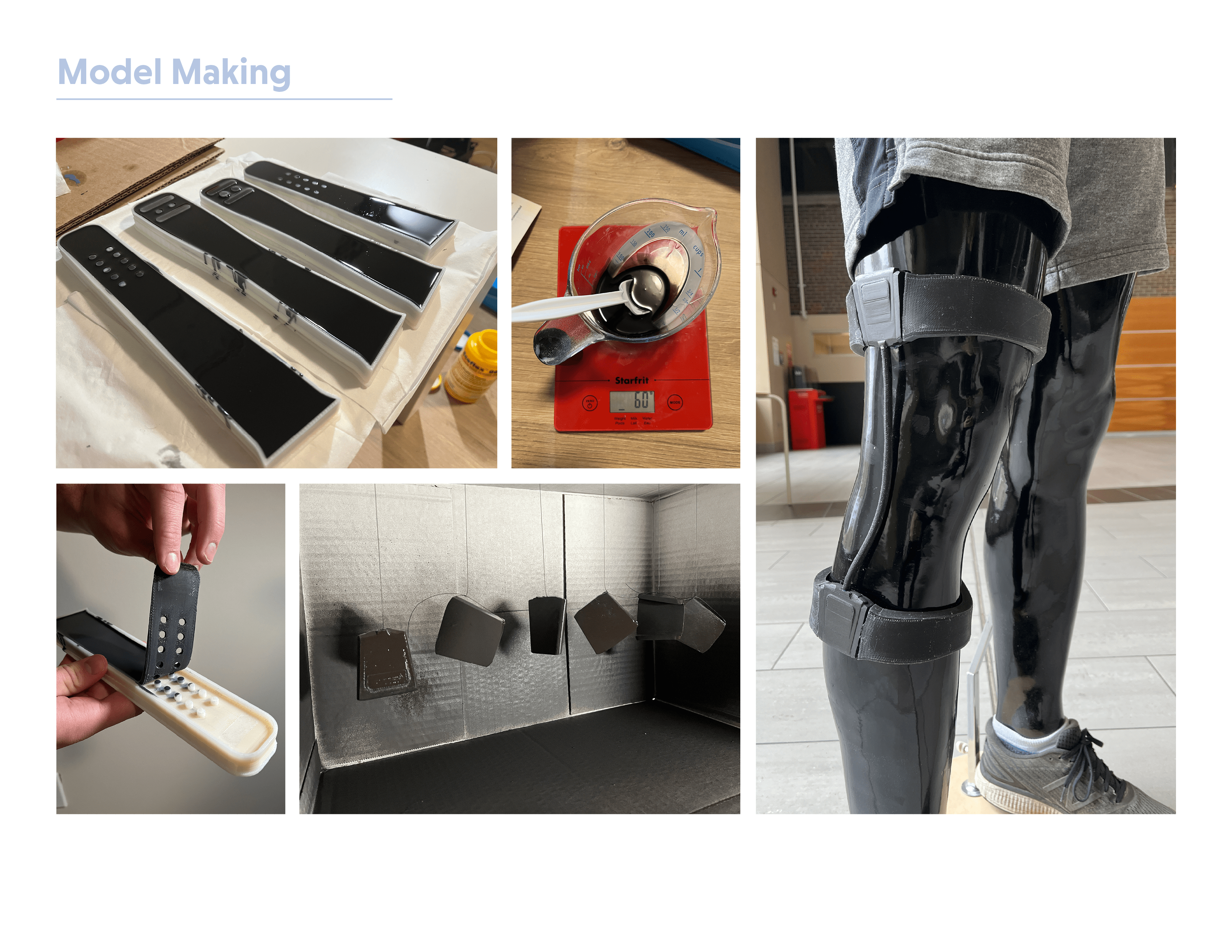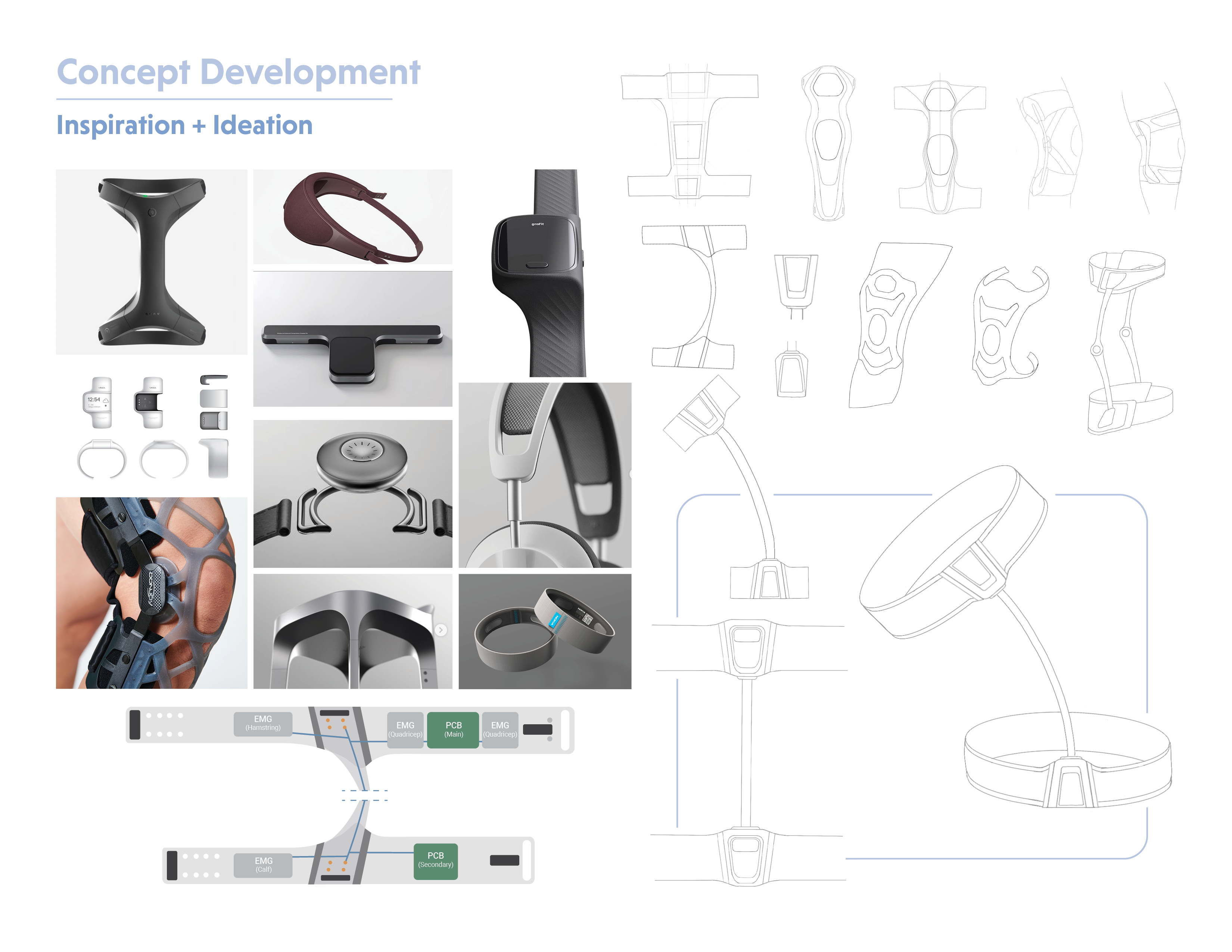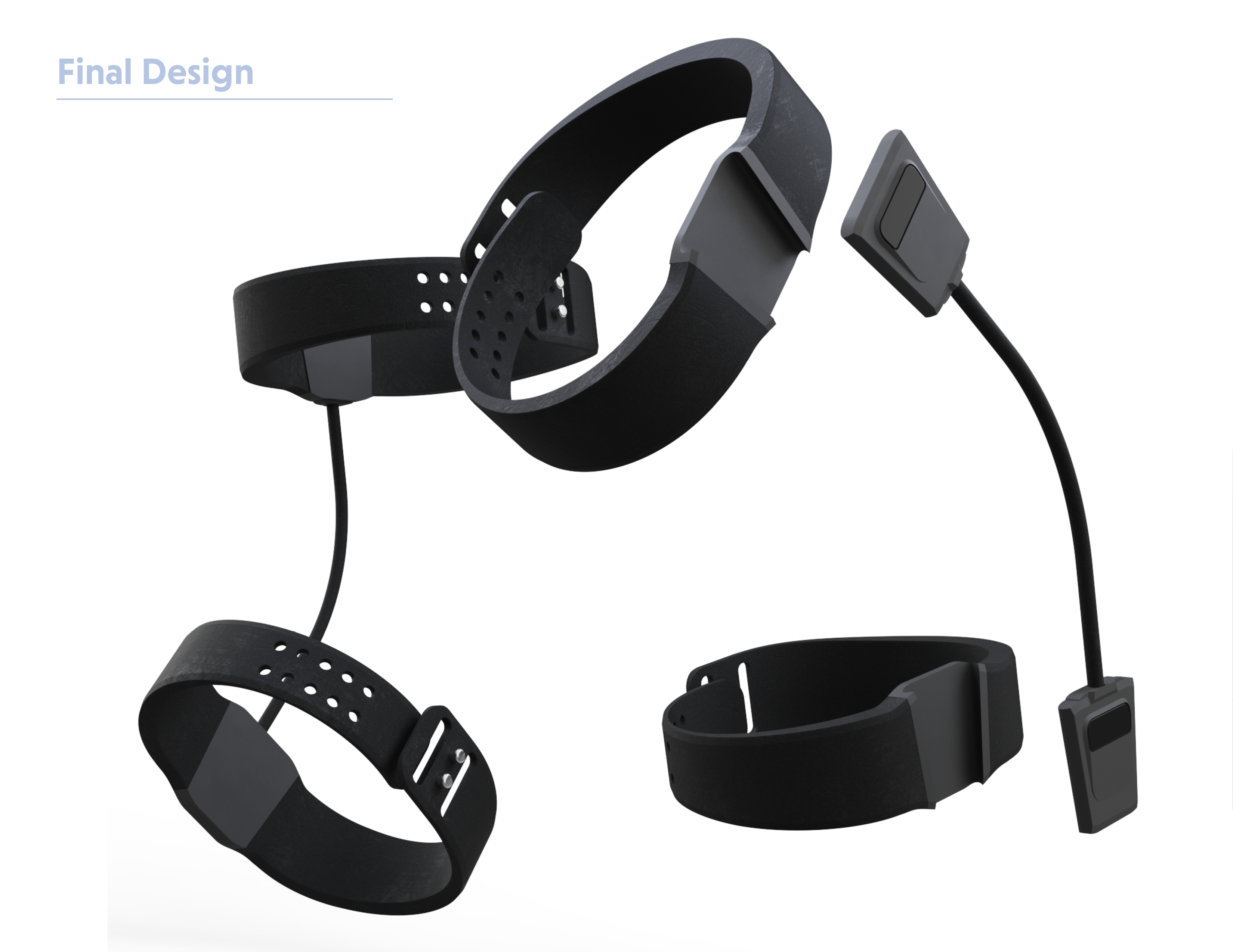 The system features adjustable silicone bands designed to accommodate a wide range of quadricep and calf sizes, ensuring a secure and comfortable fit for diverse users. The upper bands weigh approximately 65 grams, while the lower calf bands are around 55 grams, keeping the device lightweight and unobtrusive during workouts. The current concept is presented in a sleek black finish, allowing for a discreet appearance that does not draw attention during strength training. This thoughtful design ensures that users can focus on their performance without distraction, seamlessly integrating the wearable into their routine.