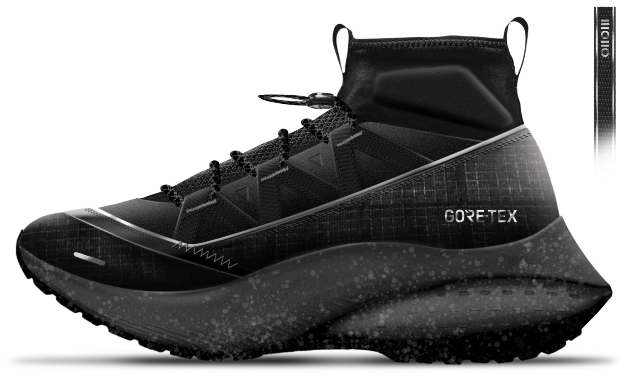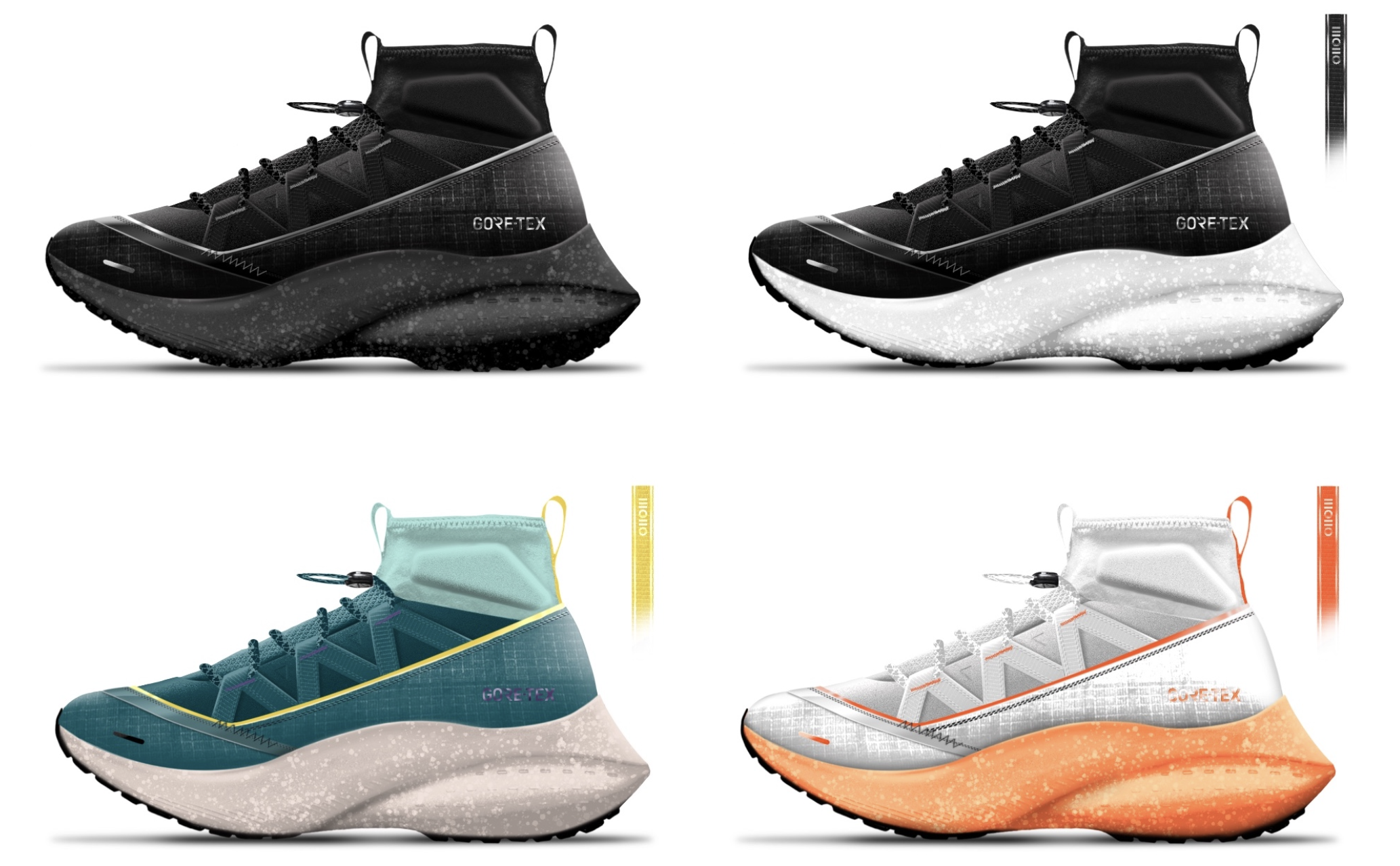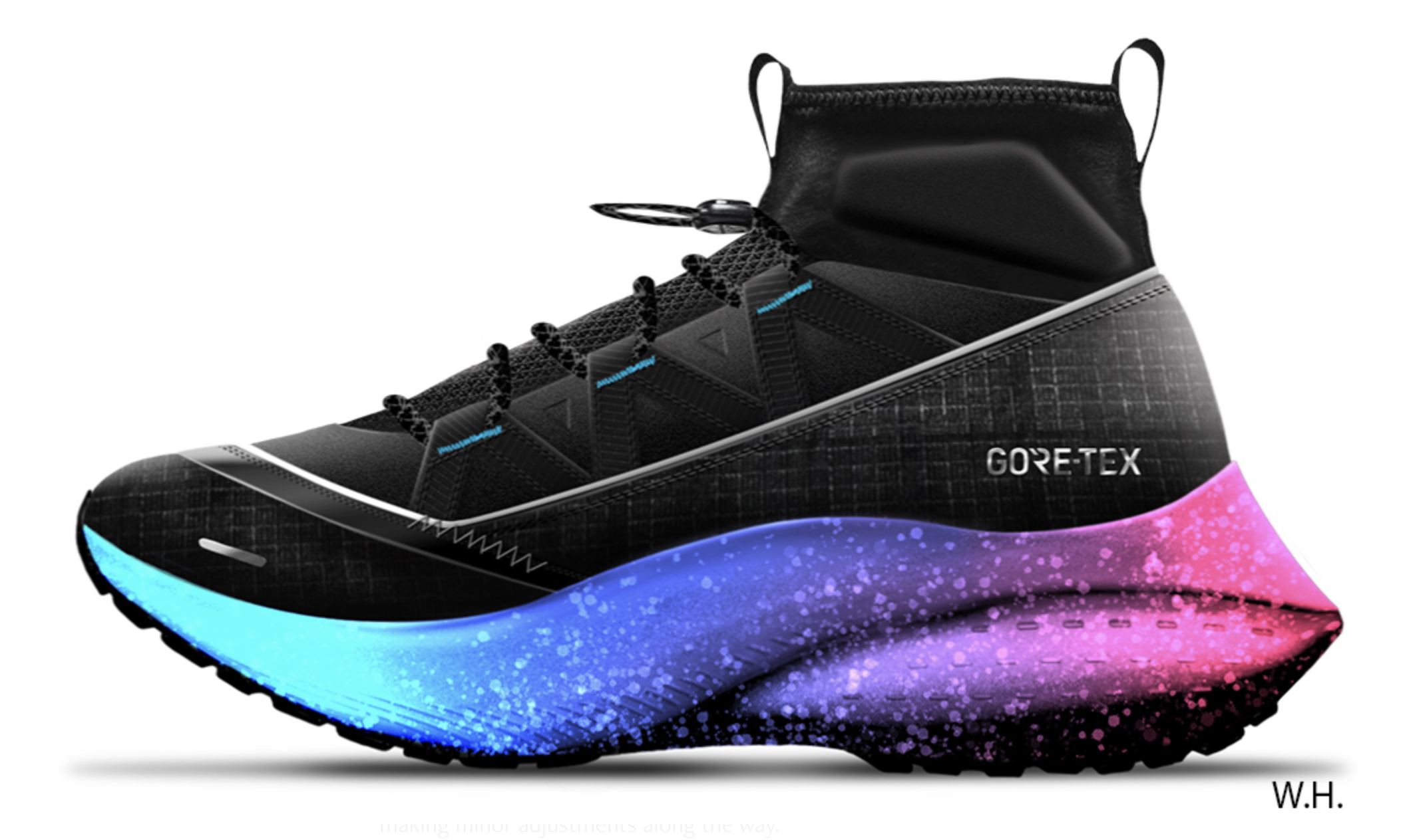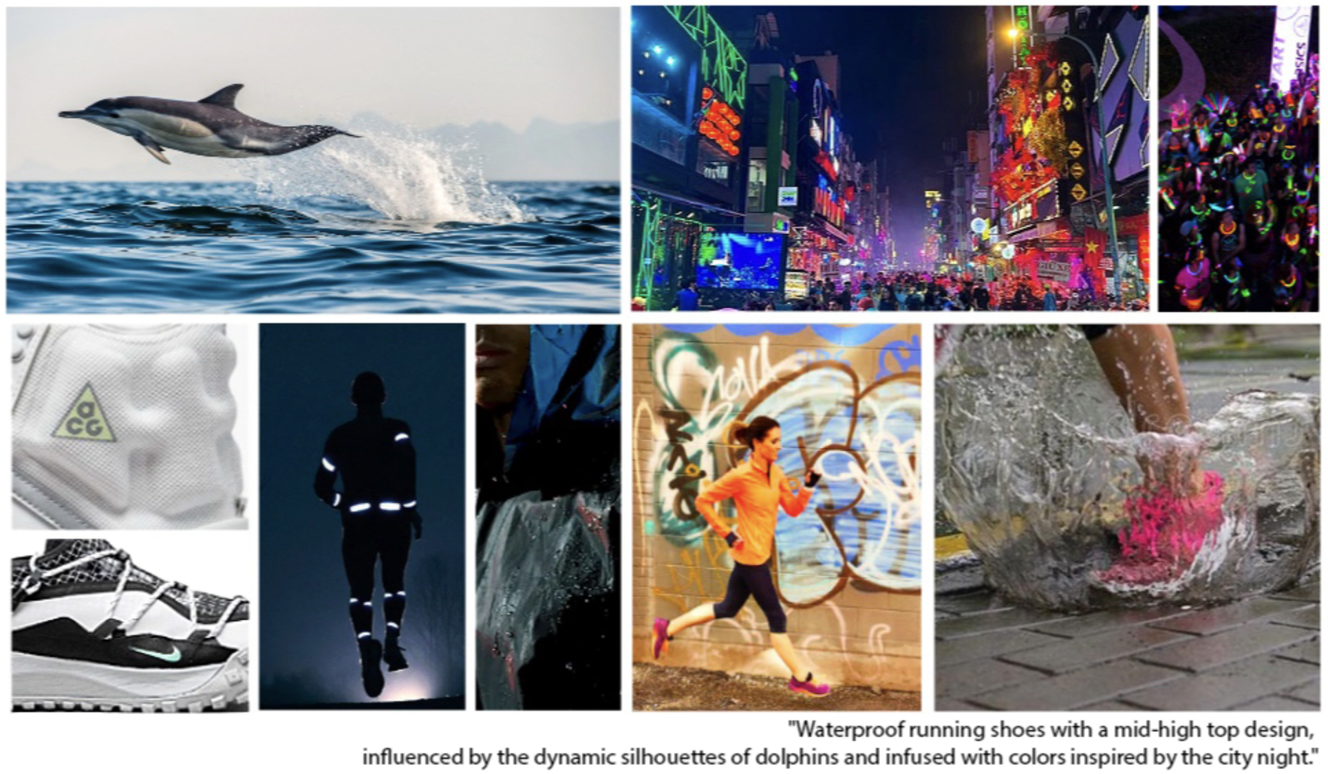 Introducing a water-resistant running shoe with a mid-high top design, inspired by the dynamic silhouettes of dolphins and infused with colors drawn from the vibrant neon signs that illuminate the city at night. The striking color palette captures the essence of the urban nightlife, while 3M reflective elements enhance safety during low-light conditions. Crafted with Gore-Tex fabric and a neoprene lining, these shoes ensure waterproof protection, making them ideal for runners in any weather.
