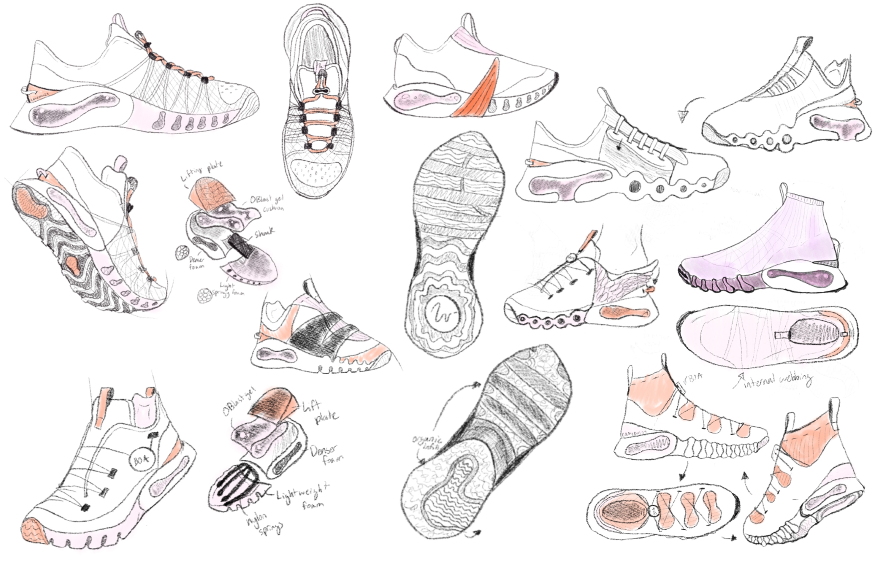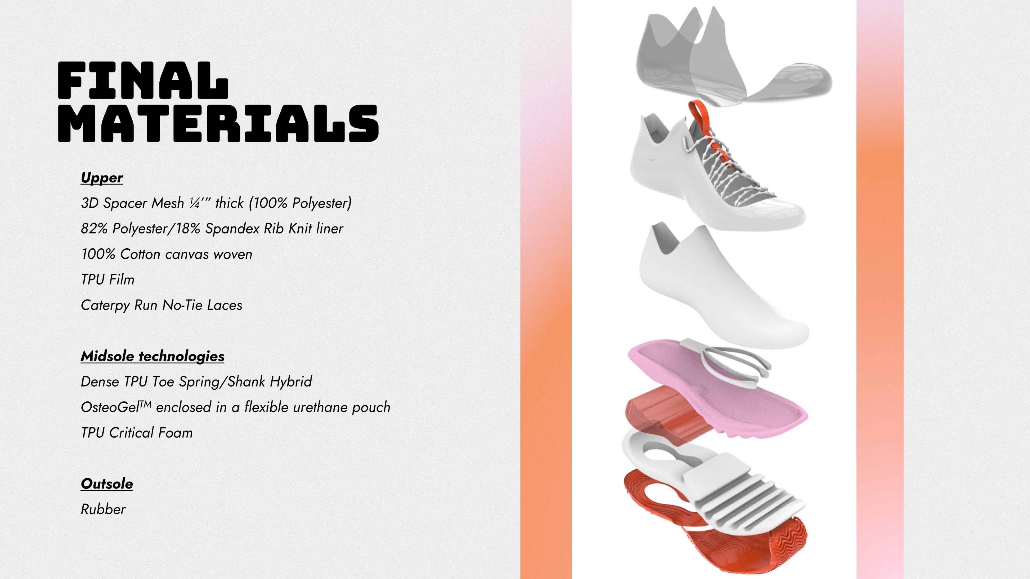 Using a shear-thinning liquid of my own creation dubbed OsteoGel, we can create a force absorbing pouch to as as both a lifting base and support midsole technology. This gel-like substance firms up upon sudden impacts, such as falls or rigorous foot striking, and is fluid during constant slow pressure - such as squats and other lifting exercises. This is so that healthy amounts of force are released onto the metatarsals during exercise and reduces the risk of stress-fractures in post-menopausal women.