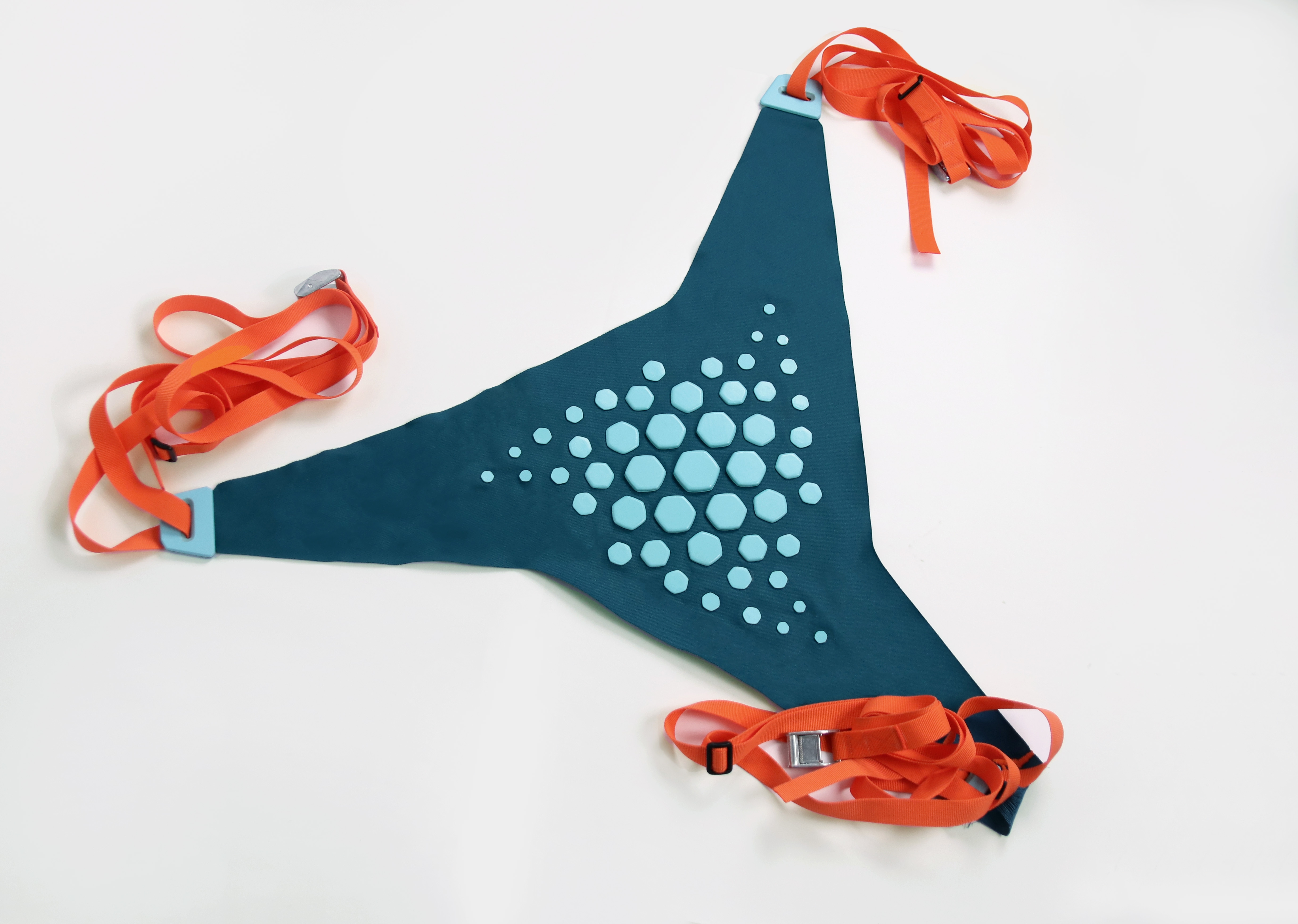Product Detail PITA is an innovative outdoor balance training product designed to enhance coordination and stability through a dynamic, fabric-based structure. Constructed from durable, weather-resistant tarpaulin fabric, it offers a slightly flexible yet stable surface, simulating the instability of a balance cushion. The structure is anchored with heavy-duty nylon ratchet straps, allowing for secure, multi-point fastening while maintaining consistent tension and form. The stepping surface incorporates plastic-printed hexagonal grip bumps, strategically designed for optimal foot placement and sensory feedback. The bold, contrasting colors not only enhance visibility and engagement but also help users intuitively position themselves, reinforcing a sense of movement and direction.