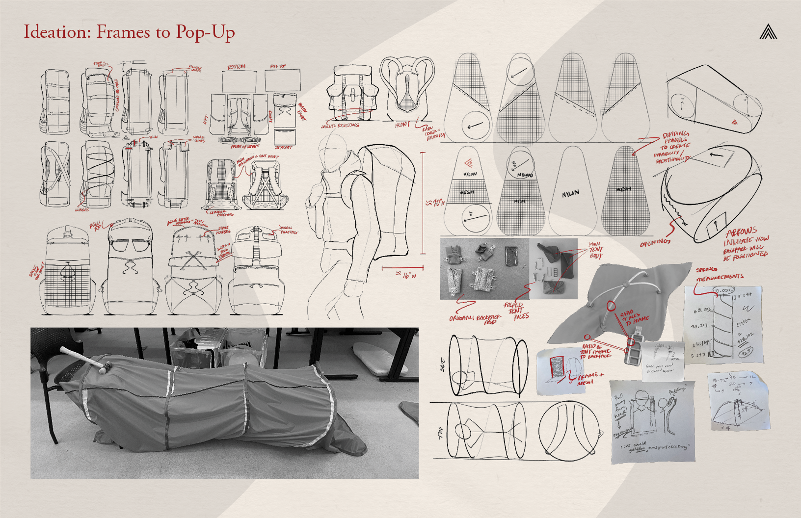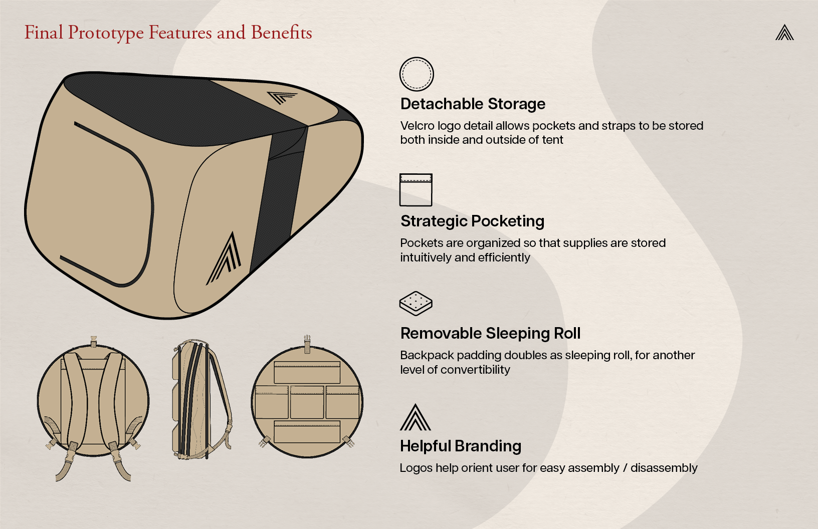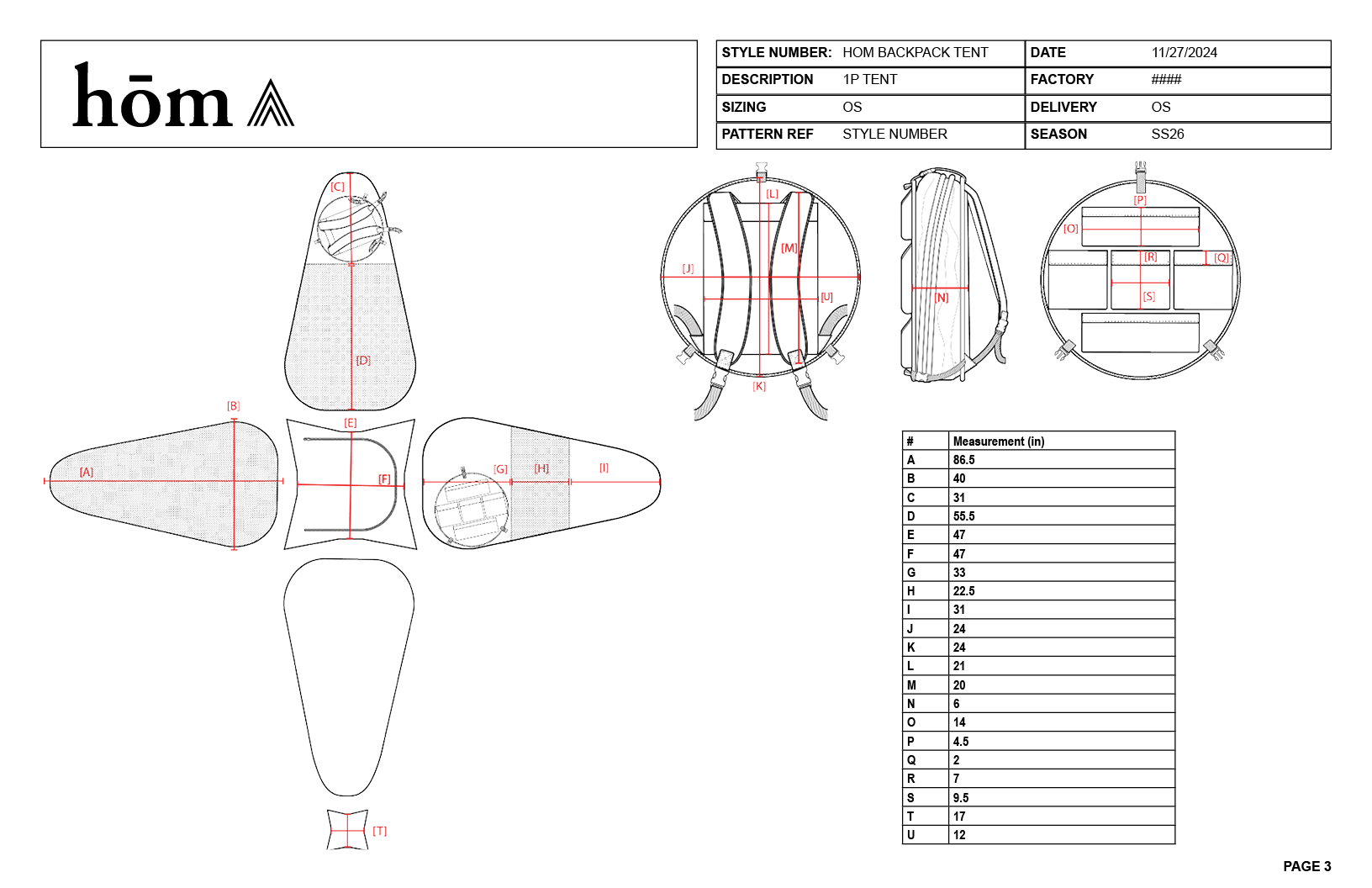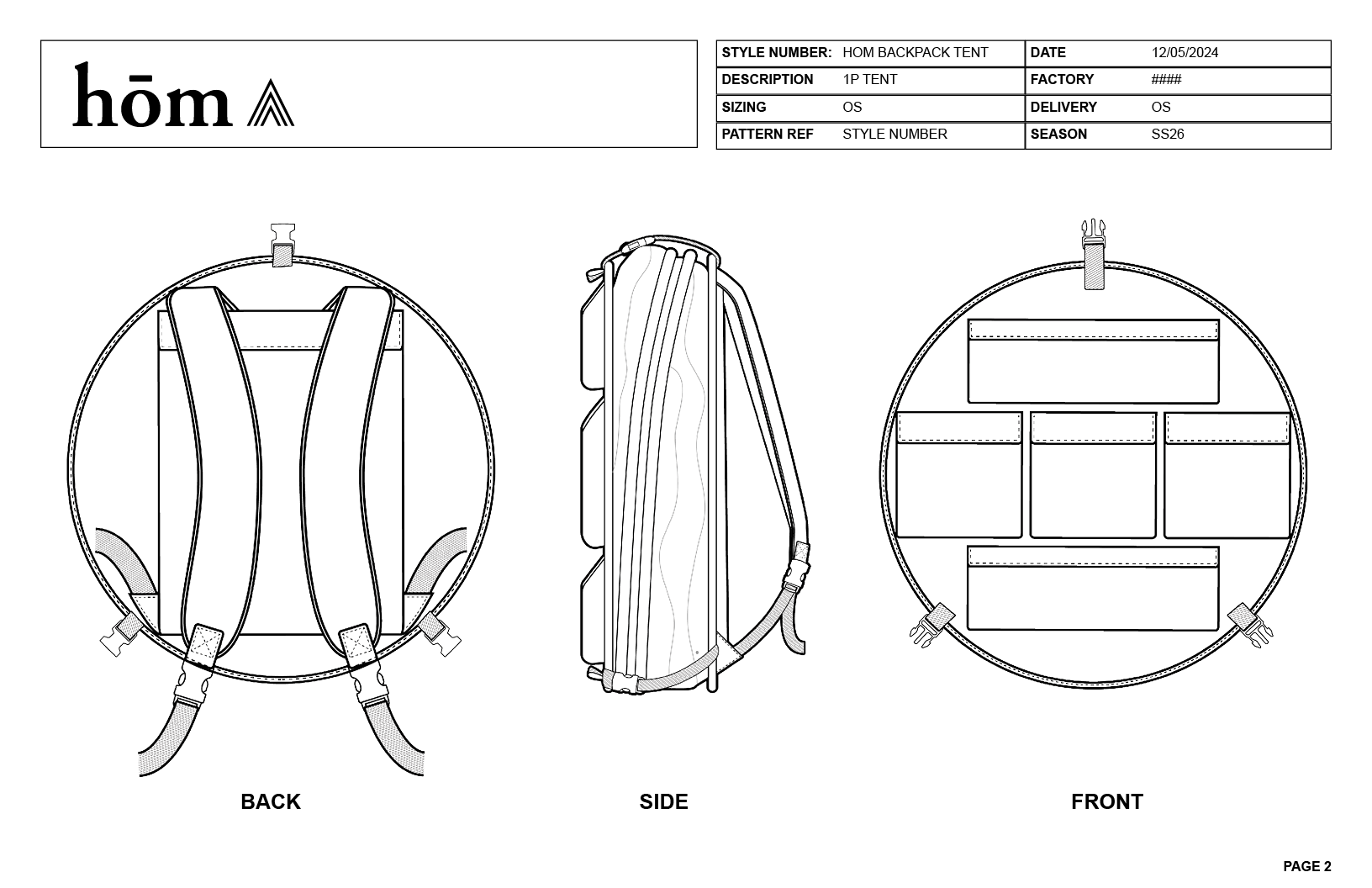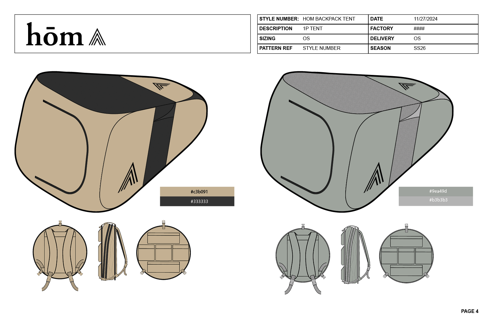 Product Detail The hōm backpack-to-tent system combines durable, lightweight materials to ensure both portability and comfort. The backpack is constructed from high-performance ripstop nylon and waterproof TPU-coated fabrics, providing durability and weather resistance. The tent utilizes a breathable yet water-resistant polyester fabric with UV protection, supported by a collapsible aluminum frame for easy setup. High-density foam in the backpack’s straps ensures comfort, while the tent's floor features a reinforced tarp layer for additional protection. The design emphasizes simplicity with minimalistic, functional zippers and adjustable straps, ensuring ease of use while maintaining a refined, luxurious aesthetic.