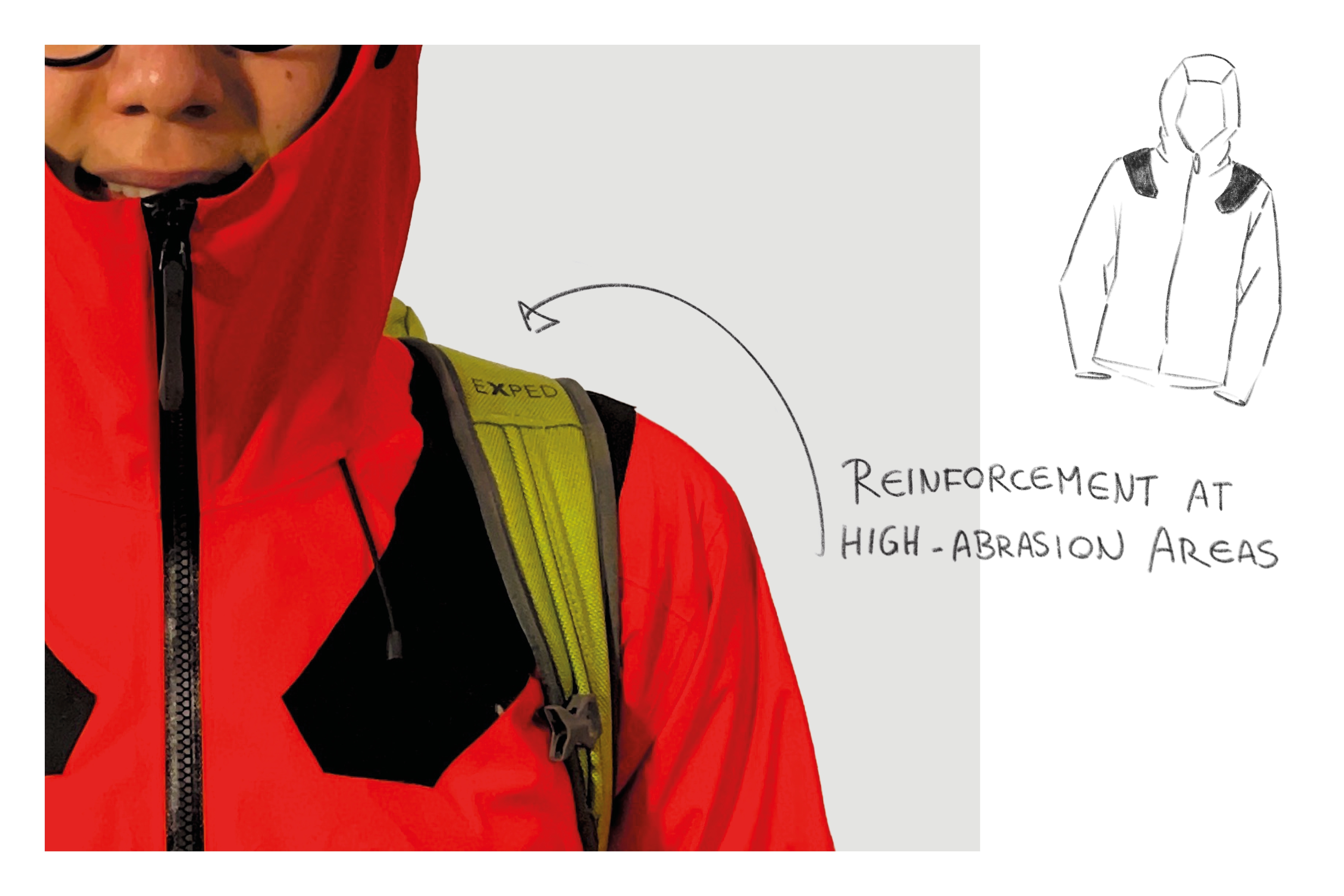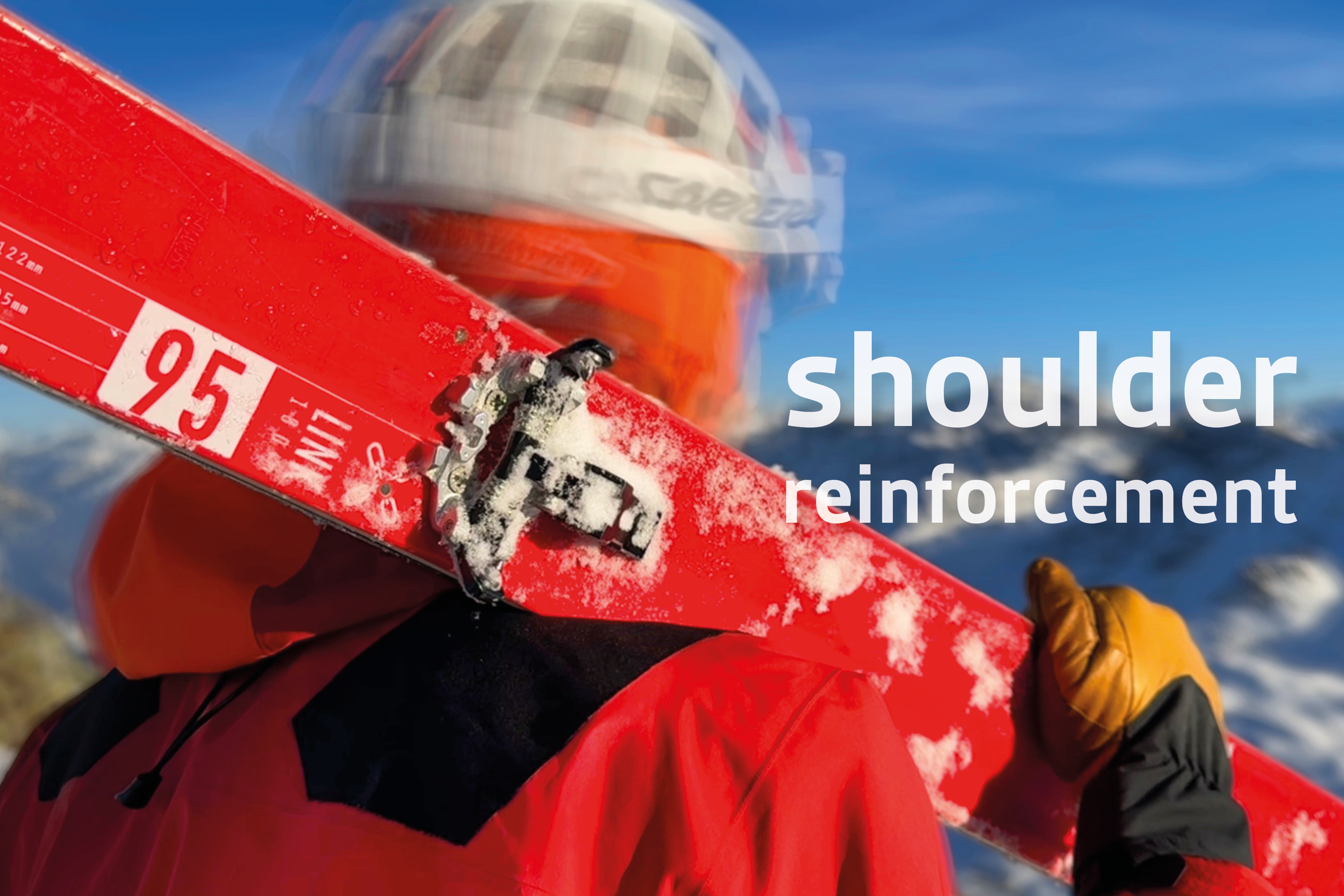 Innovation "Shoulder Reinforcement" strengthens the most vulnerable parts of a jacket – the shoulders. Whether it’s the abrasion from backpack straps or cuts from sharp edges of your skis, this minimalistic add-on provides reliable protection. It also contributes significantly to sustainability by extending the lifespan of hardshell jackets many times over.