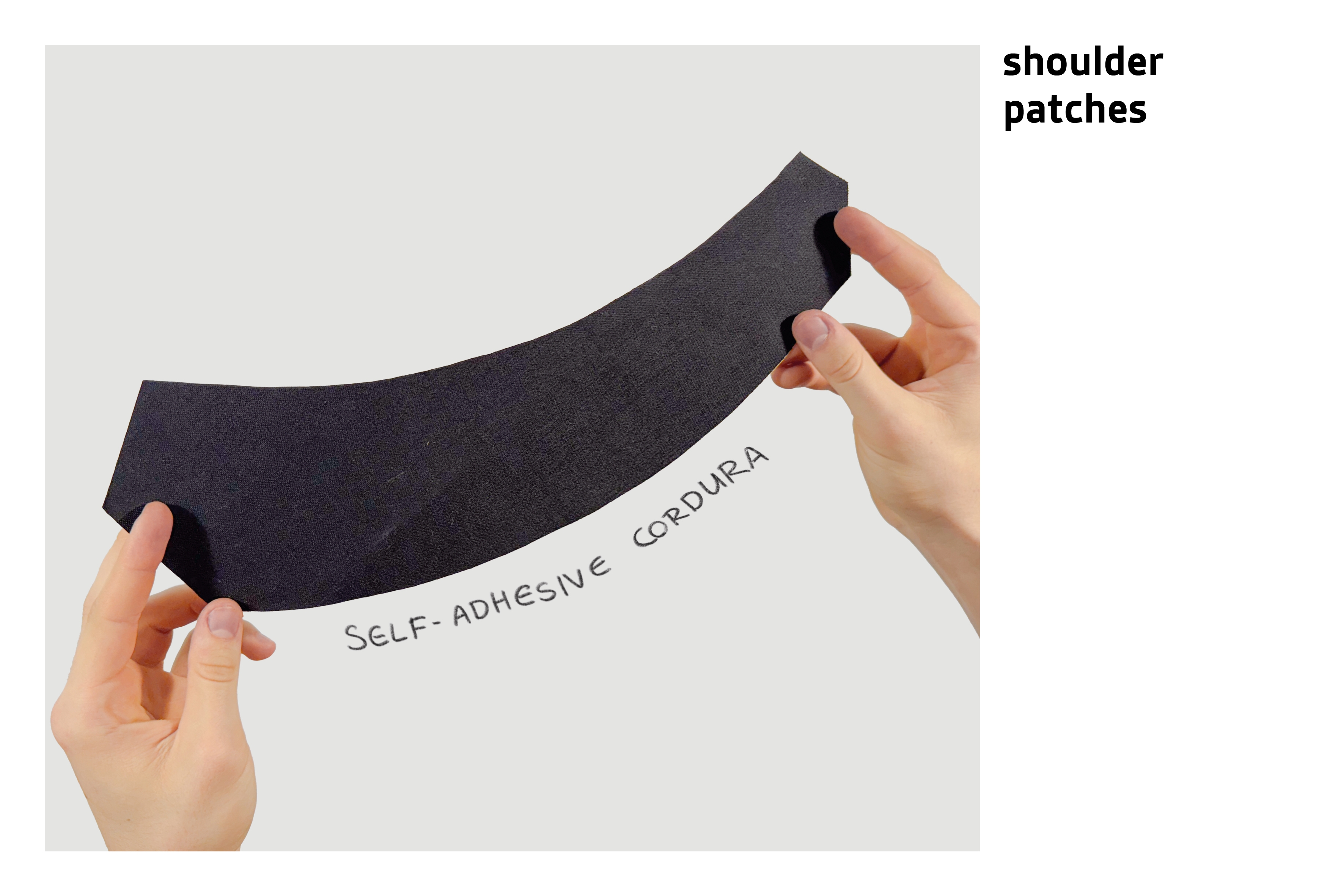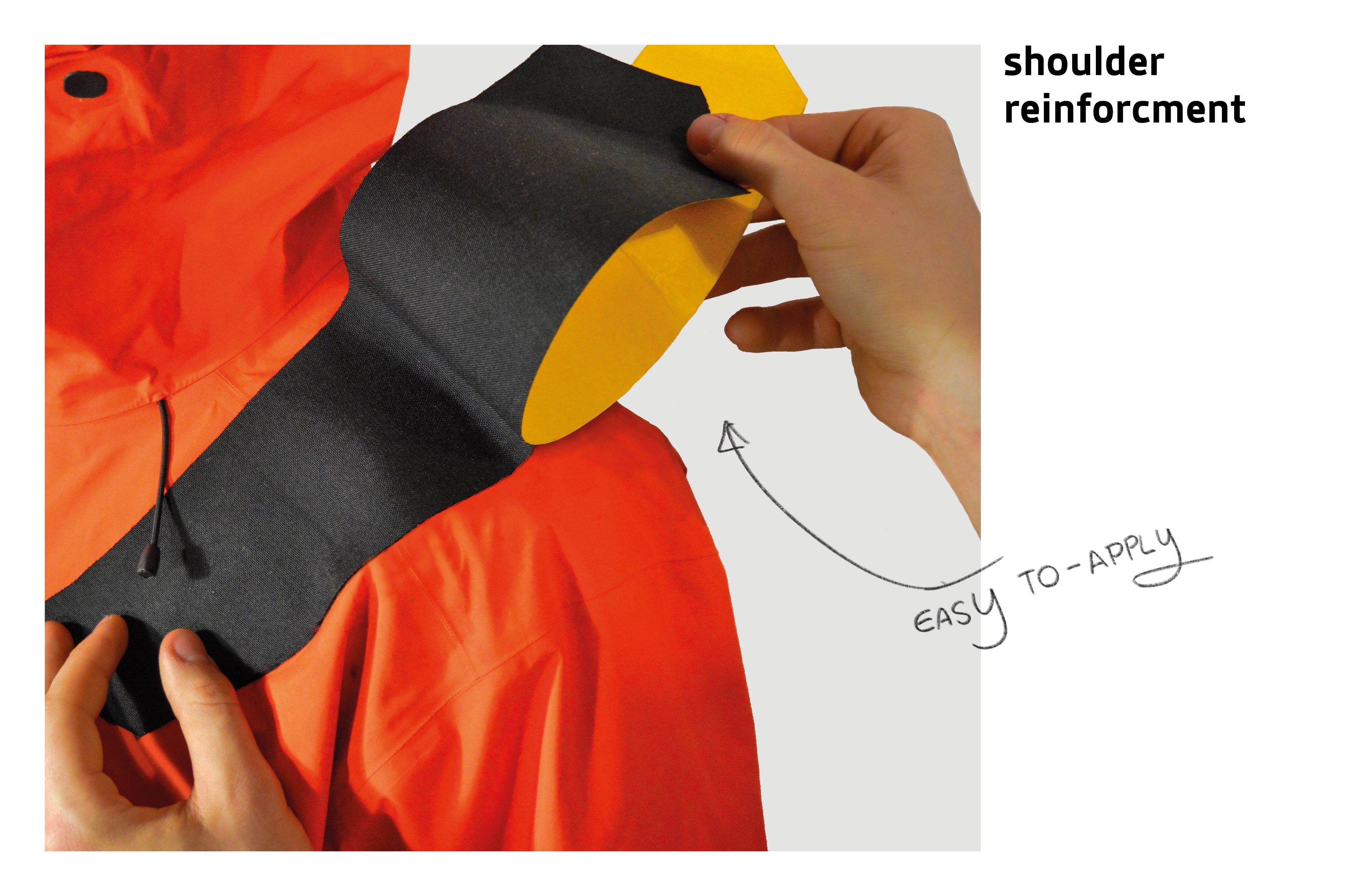 Description "Shoulder Reinforcement" is a lightweight, self-adhesive, and durable unisex add-on made from abrasion-resistant Cordura. It protects the most vulnerable areas of a jacket—especially the shoulders—from wear caused by backpack straps or sharp edges of your skis. Easy to apply on any jacket size, it enhances mobility and significantly extends the lifespan of hardshell jackets, making it a sustainable choice.
