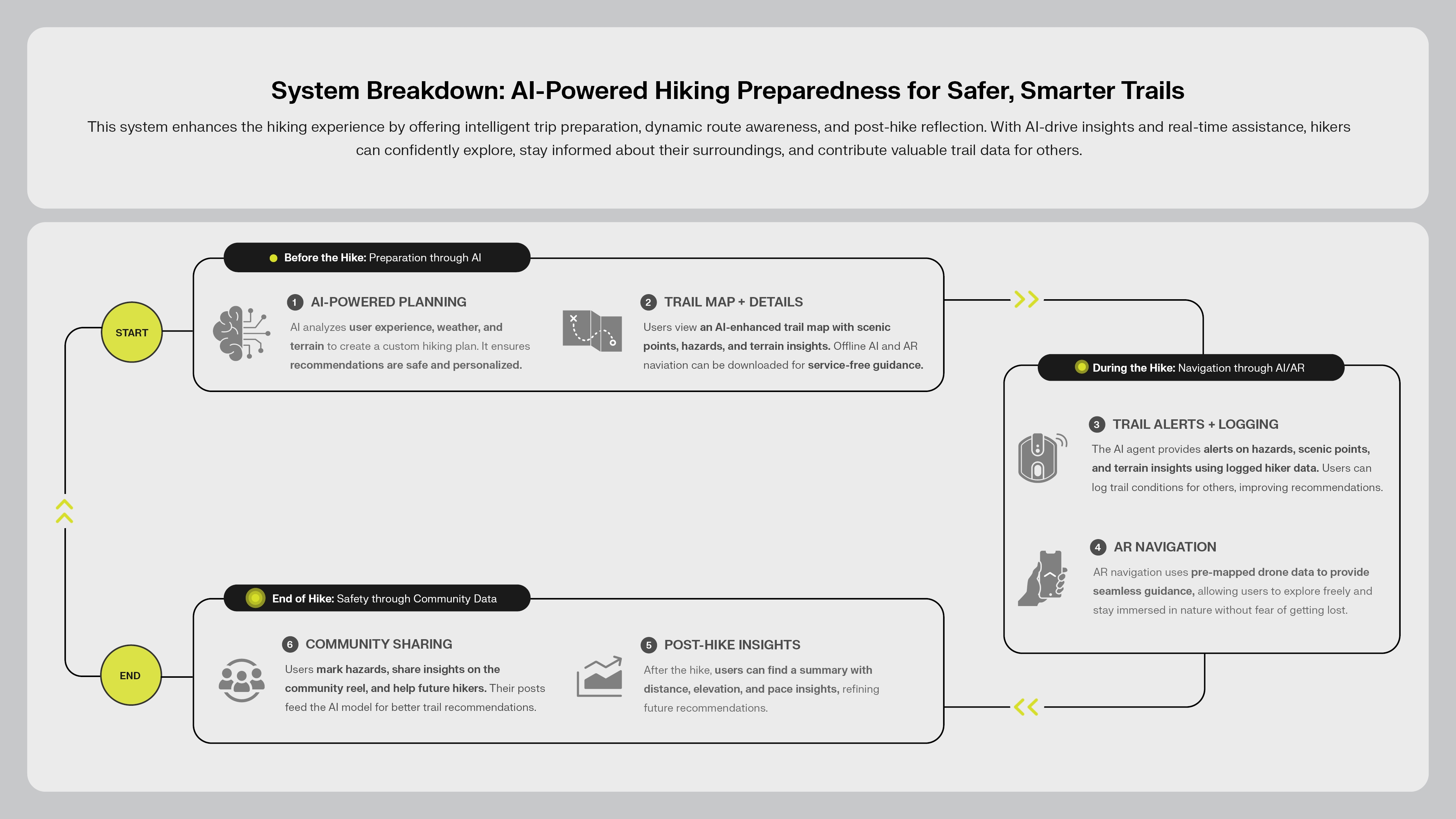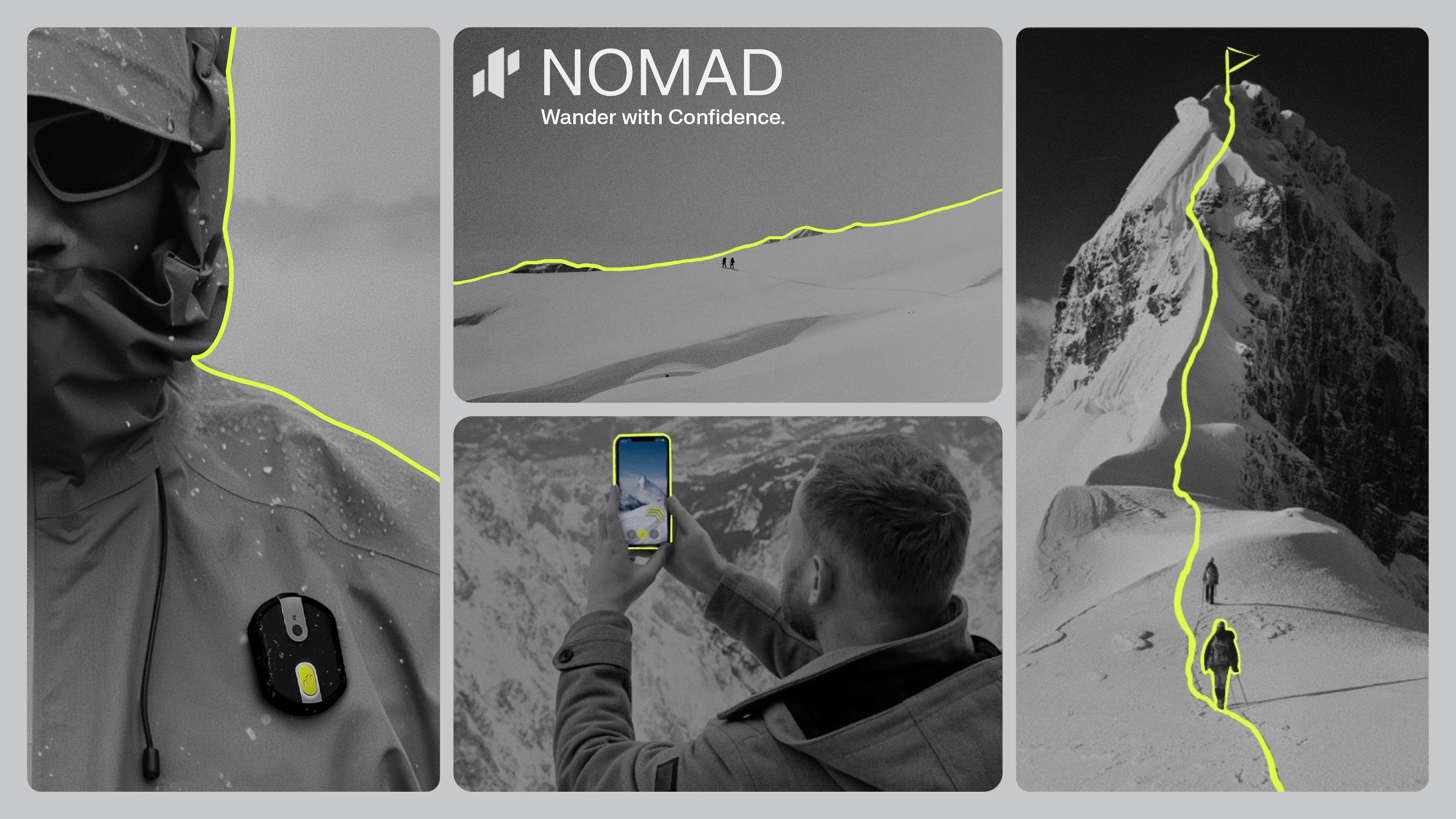 NOMAD reimagines outdoor navigation through a modular wearable and AI-powered system that minimizes screen dependency and supports immersive exploration. Unlike static GPS apps, NOMAD adapts intelligently by learning from trail conditions, weather, and user behavior—using a downloaded offline agent package prepared before each hike. This package includes route-specific insights such as scenic viewpoints, recent hazard reports, terrain difficulty, and community-shared updates. During the hike, the system provides offline AR navigation, ensuring users stay confidently on track even in remote areas with no service. The companion pin delivers real-time, hands-free feedback through subtle vibrations and short audio cues, guiding users through turns, waypoints, and upcoming changes. This approach removes the need to stop or look at a device, creating space for presence, reflection, and sensory awareness. NOMAD doesn’t just support exploration—it enhances it by quietly blending into the background and offering support only when needed.