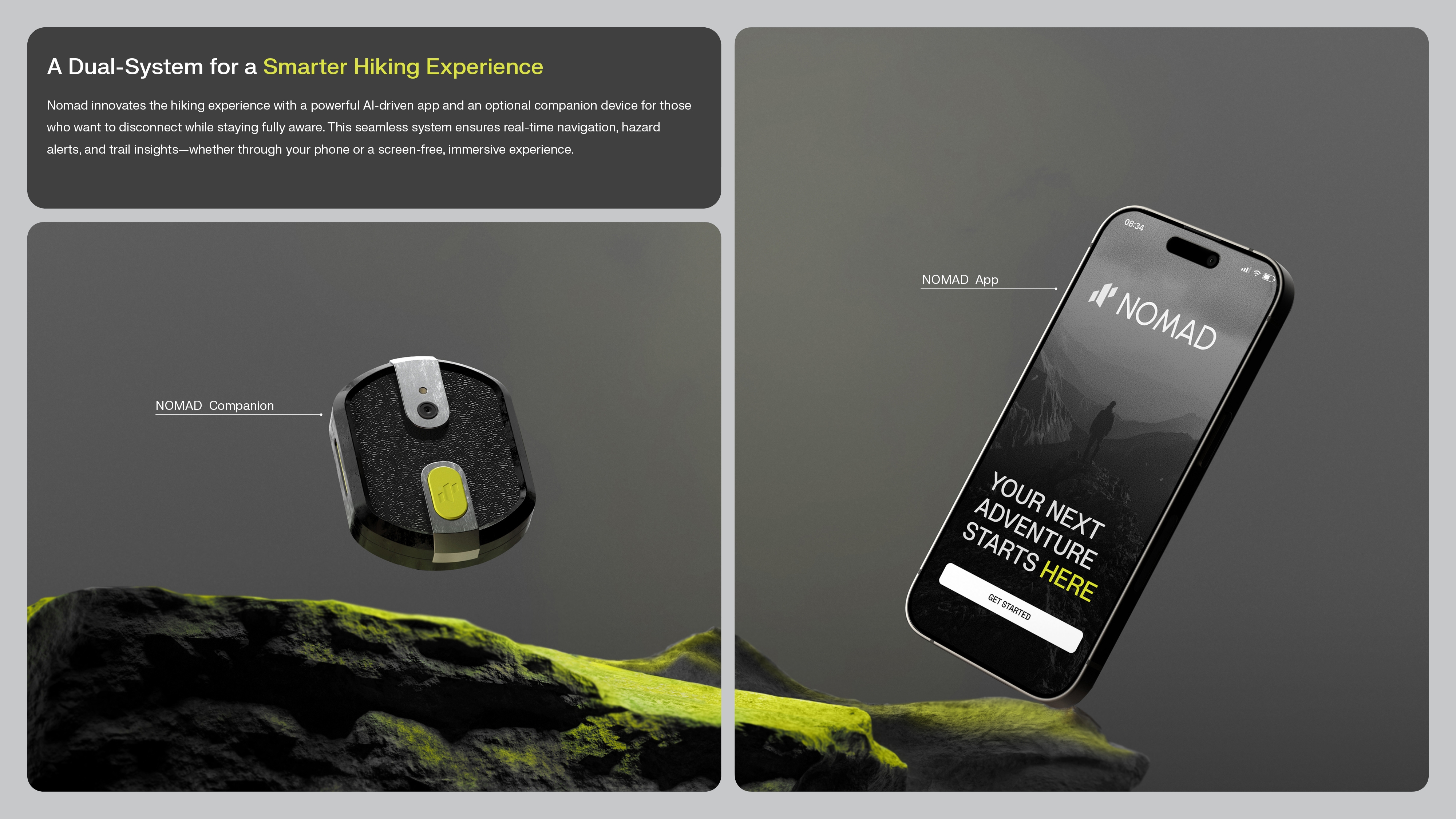 NOMAD is an AI-powered hiking ecosystem designed to support exploration without pulling users out of the experience. Made up of a user-friendly mobile app and a discreet wearable pin, NOMAD enhances every stage of the hiking journey, from pre-hike preparation to on-trail guidance and post-hike reflection. Before the hike, users download an offline agent package tailored to their route, including scenic points, hazard alerts, terrain difficulty, and weather forecasts. On the trail, this offline data powers AR navigation and safety guidance, even without cell service. The wearable pin provides hands-free support through subtle vibrations and brief audio cues, helping users stay focused on their surroundings rather than a screen. NOMAD also adapts to individual hiking preferences, adjusting future suggestions based on behavior. After the hike, the system logs route data, highlights key moments, and generates personalized performance insights. Designed to feel more like a companion than a tool, NOMAD promotes safety, presence, and connection, allowing hikers to explore confidently while staying immersed in nature.