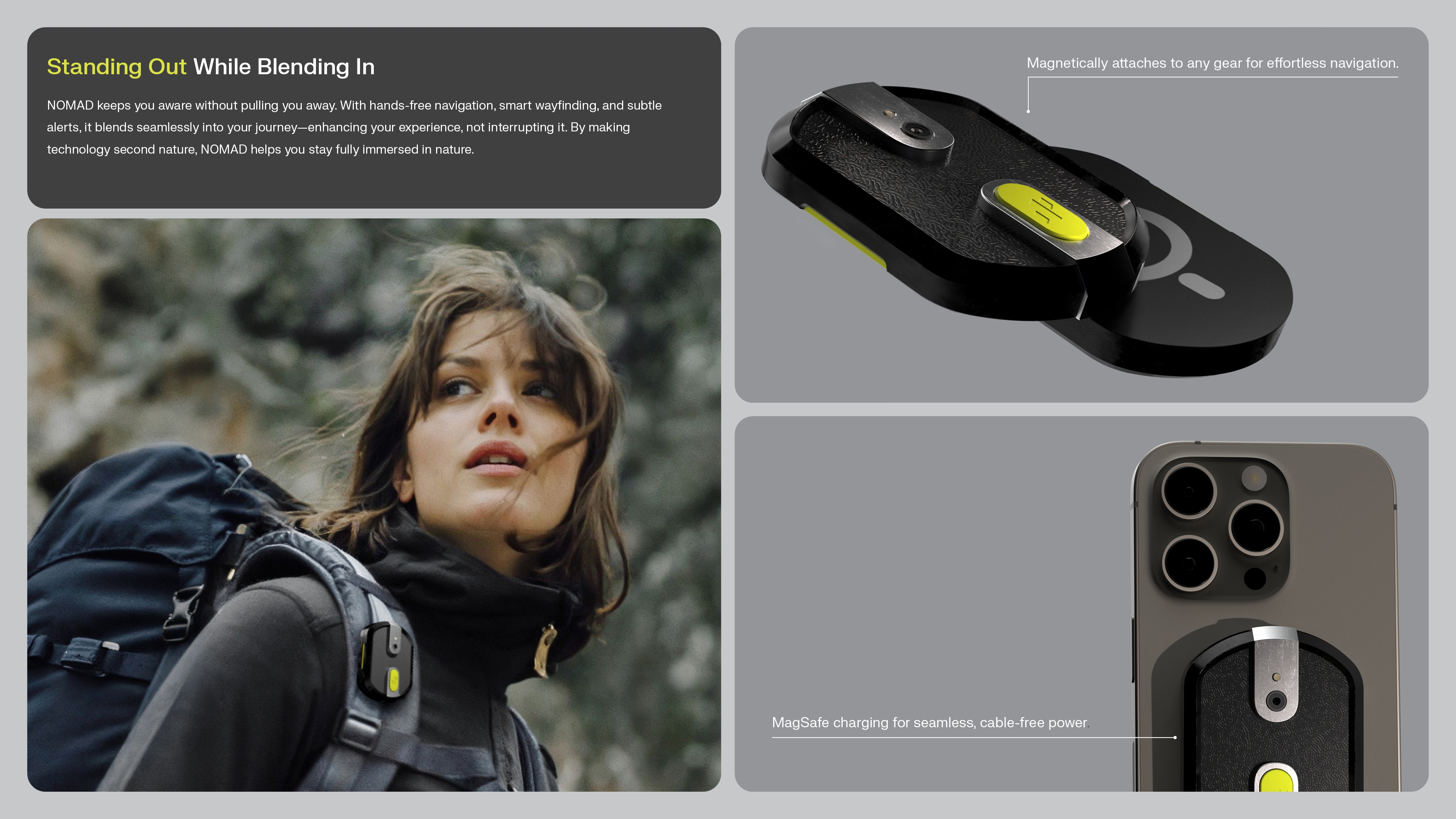 NOMAD is a unisex, one-size-fits-all modular pin designed for seamless attachment to backpacks, belts, jackets, and outdoor clothing in general. It measures 75mm × 45mm × 12mm and features a sleek, compact form optimized for comfort, stability, and low-profile wear. Weighing approximately 110g, NOMAD is finished in a matte charcoal body accented by a bold chartreuse button—a design choice that balances visibility with understated, rugged elegance. The pin is fully weather-sealed and impact-resistant, ensuring consistent performance across a wide range of conditions and environments.