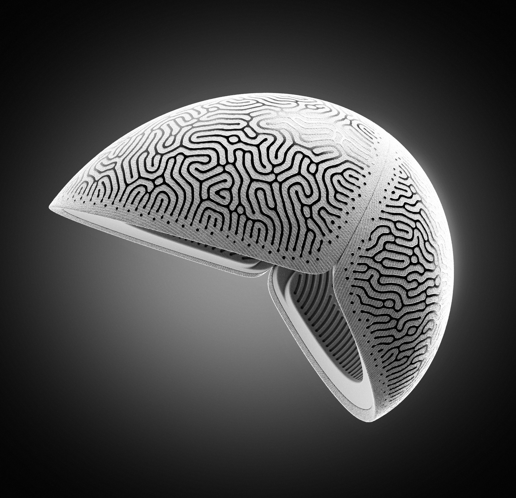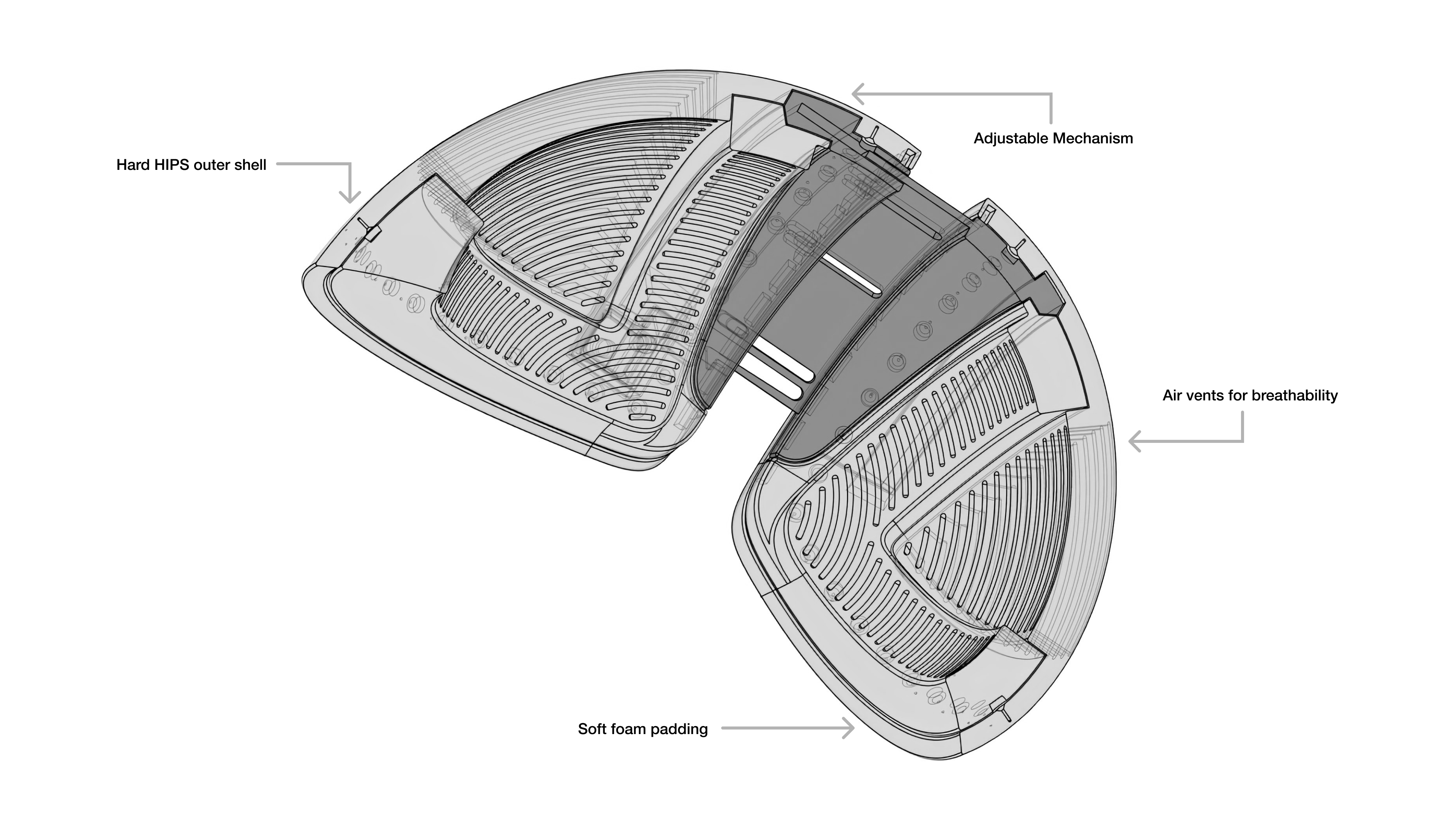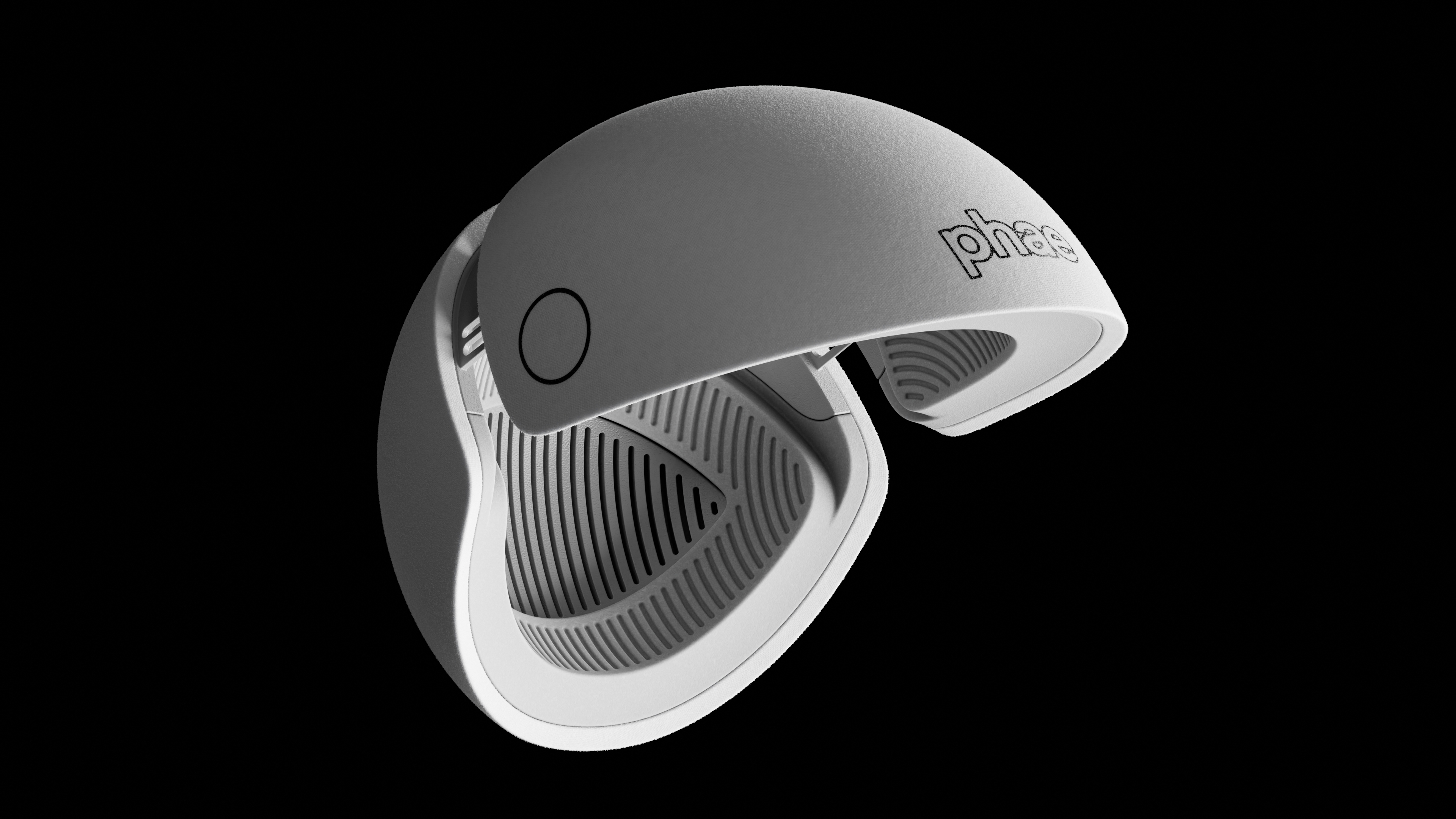 Specification Phae can expand almost an inch in overall diameter, allowing variable user sizing, reducing manufacturing waste, and encouraging a more accessible outcome. It is proposed in 2 fabric colorways: black with a modern organic pattern, and a traditional white minimal fabric appearance.