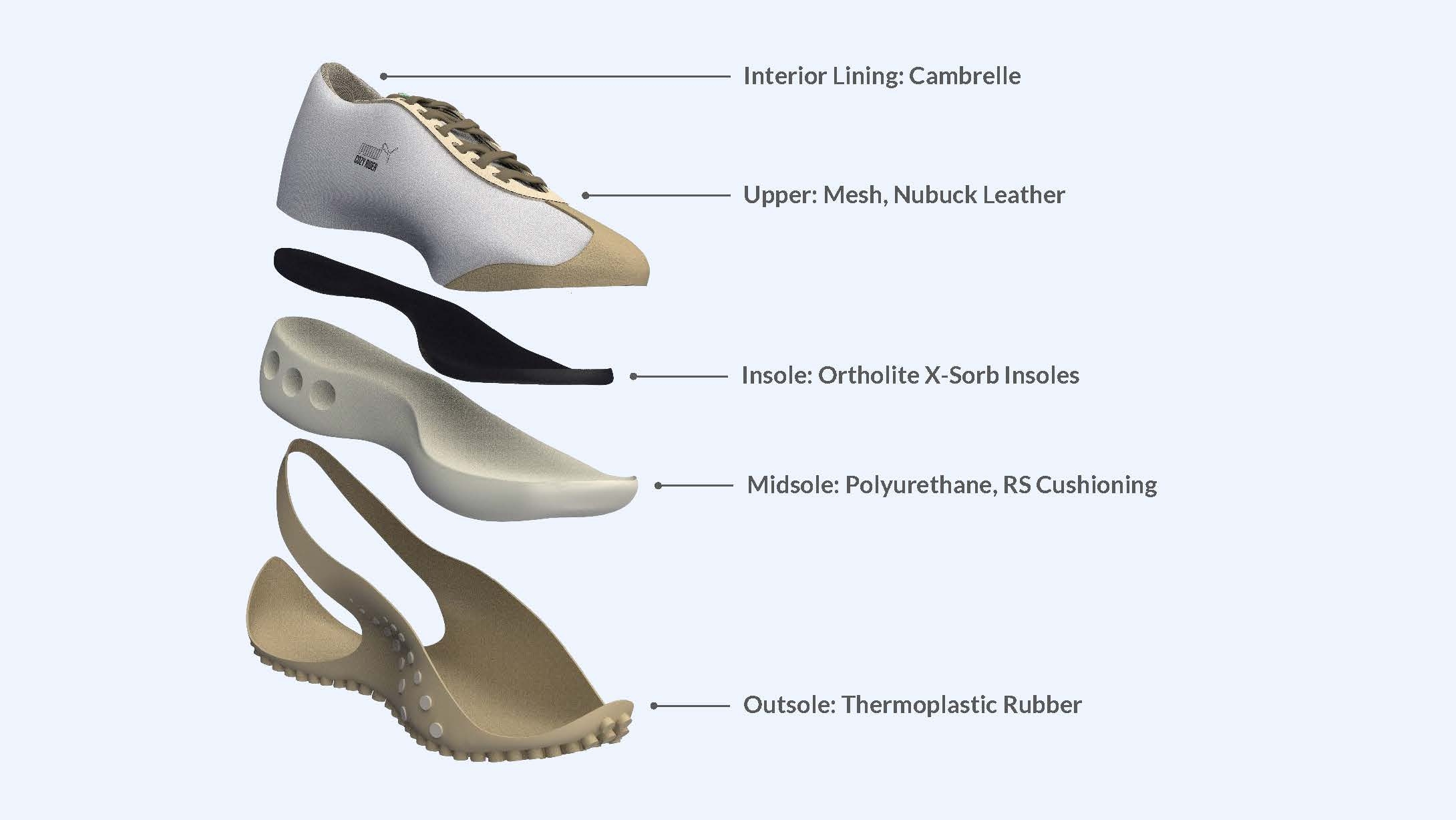 Product Detail To create a comfortable shoe, materials were chosen to provide comfort and stability to stand for long hours of the day. For the upper, a mesh textile combined with an open-cell foam material will provide excellent insolation. Nubuck leather, made from cowhide, is soft and very resistant to wear. For the collar and tongue, we chose memory foam, a synthetic material composed of viscoelastic polyurethane foam. These are great qualities that ensure comfort and allow for the shoe to properly mould to the wearer's foot. For the interior lining, we chose cambrelle, known for its abrasion resistance, softness, antifungal, and moisture-absorbing properties. Ortholite X-Sorb Insoles are Ideal for environments where comfort, performance, stability, and mobility are critical. Protects against shock while reducing fatigue, without limiting motion. For the outsole, thermoplastic rubber has excellent shock absorption and slip resistance. For the midsole, Polyurethane, is known for its ability to rebound and provide a reliable cushion. This gives the shoe a longer lifespan while being flexible and comfortable. Combining this with Puma’s patented RS cushioning will make for the perfect midsole.