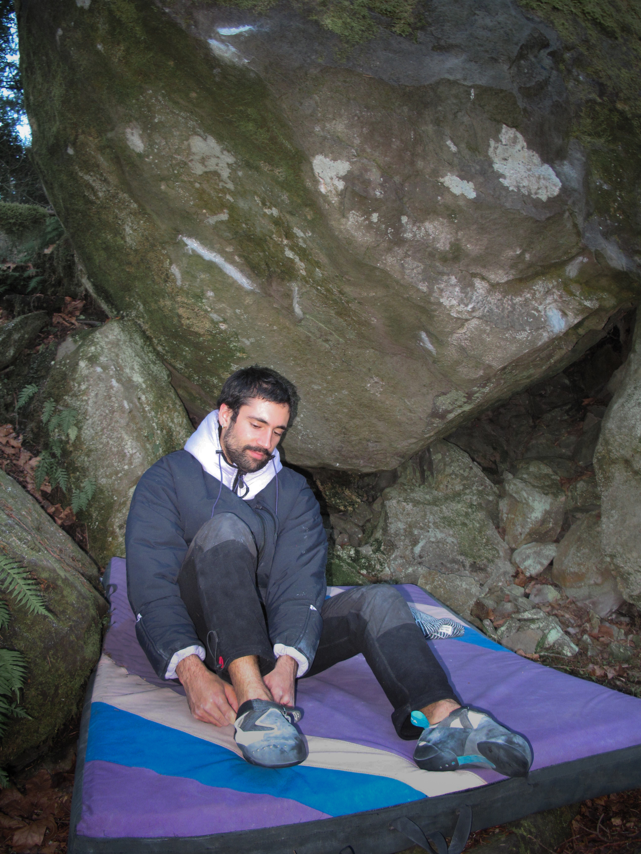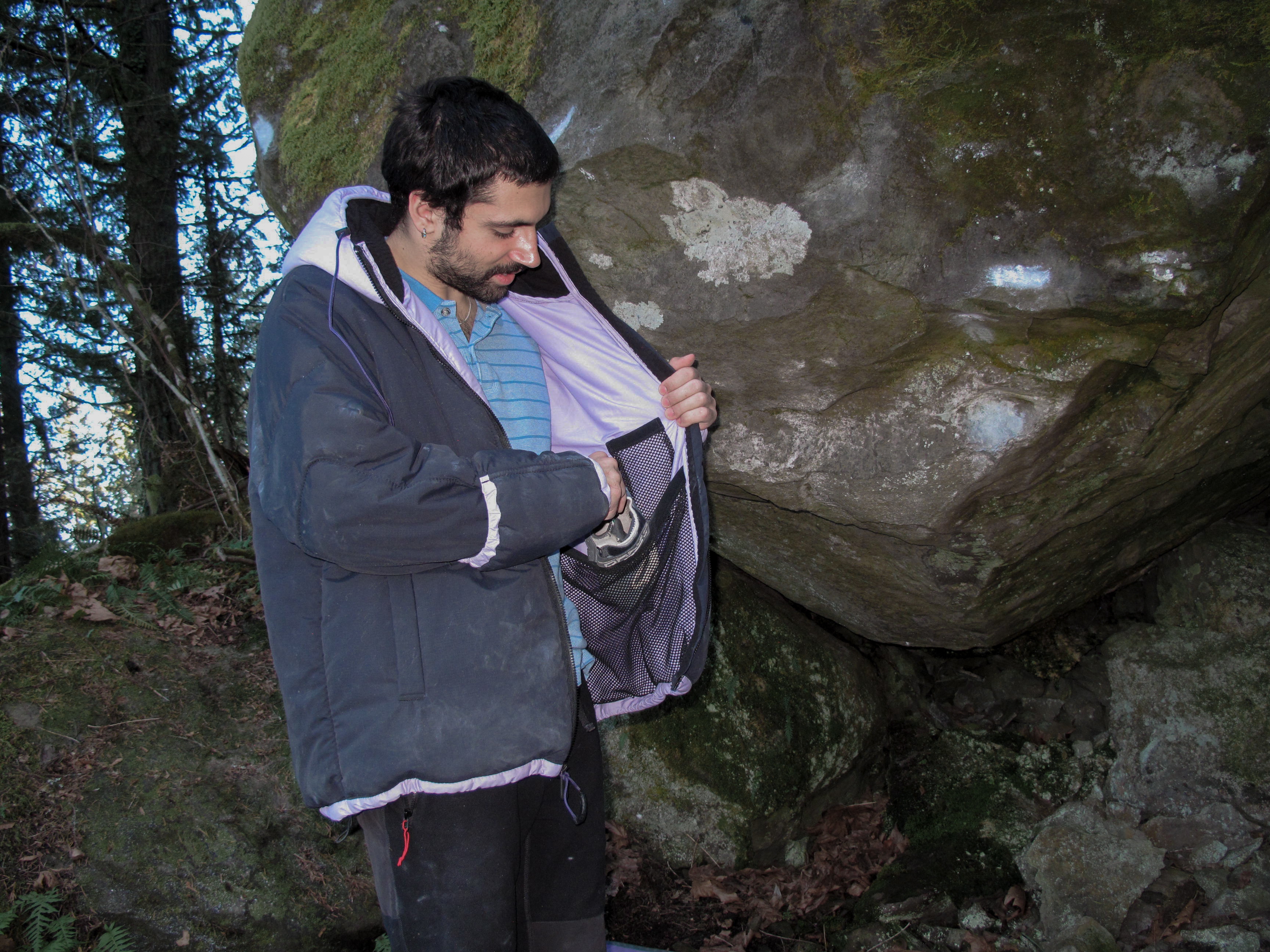 Innovation The Crag Cloud Puffer innovates by addressing the specific needs of outdoor boulderers in extreme cold conditions. Unlike traditional insulated jackets, it integrates built-in mittens to keep hands warm, large interior mesh pockets to keep climbing shoes insulated, and heater pockets for customizable warmth. The oversized fit enhances mobility and allows for easy on/off transitions between climbs. An oversized zipper prevents jamming from dirt or chalk, while a custom easy-open zipper pull ensures usability even with the built-in mittens on. Reinforced elbow patches add durability in rough environments.