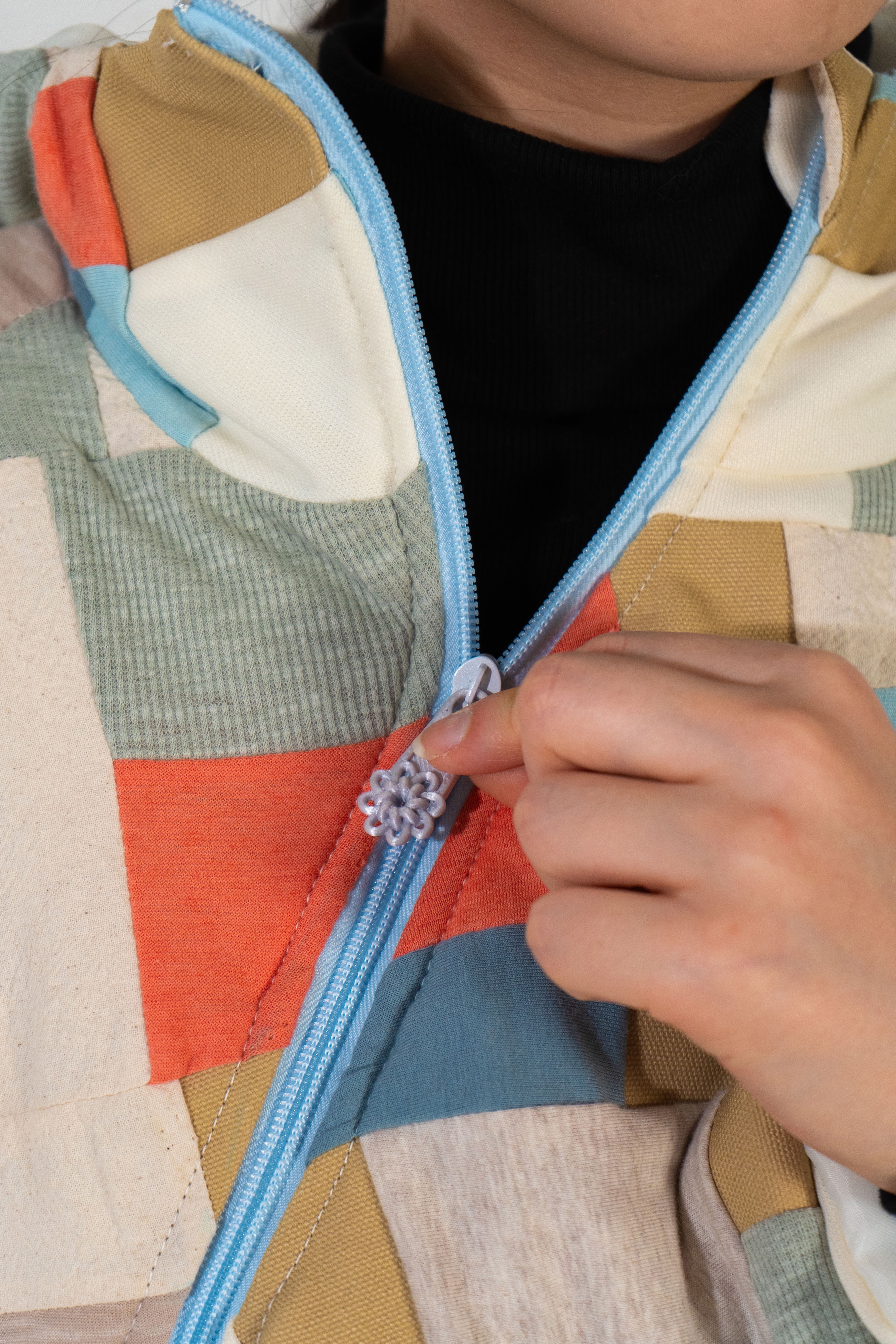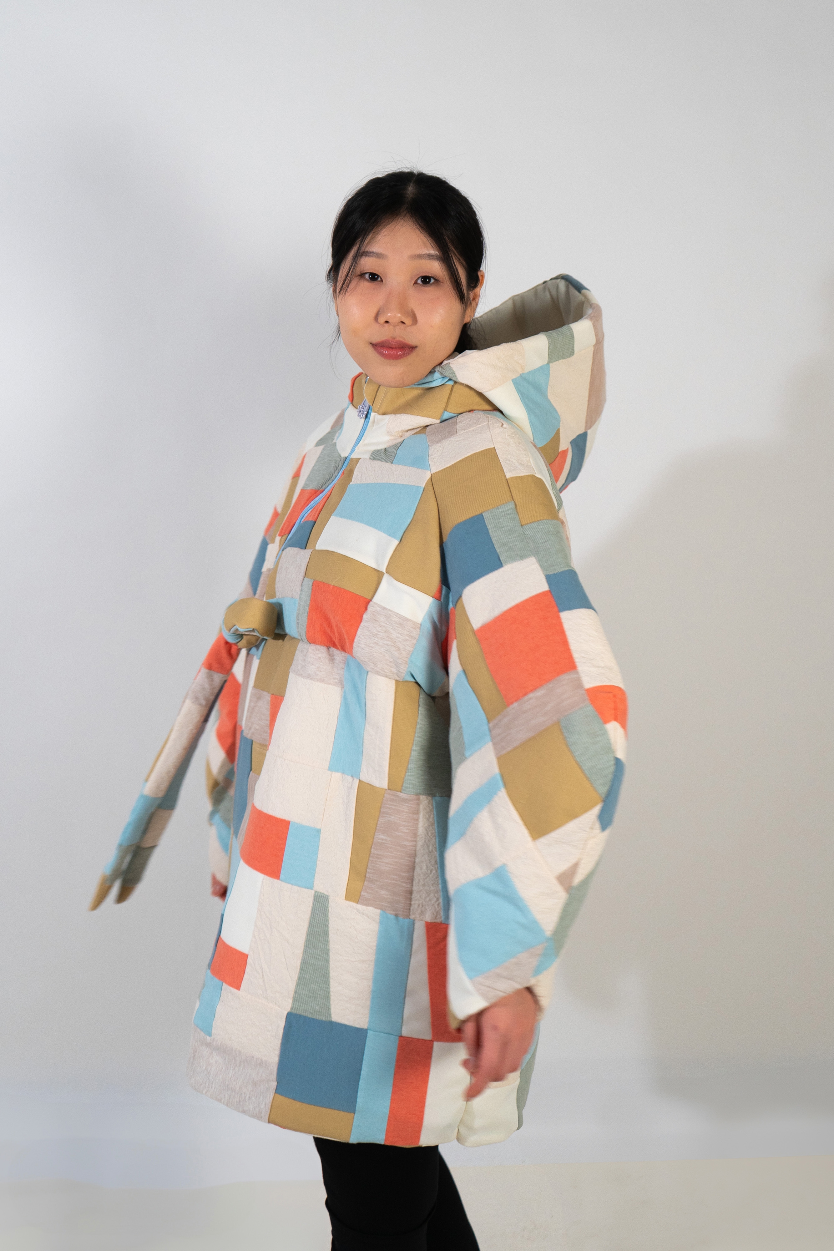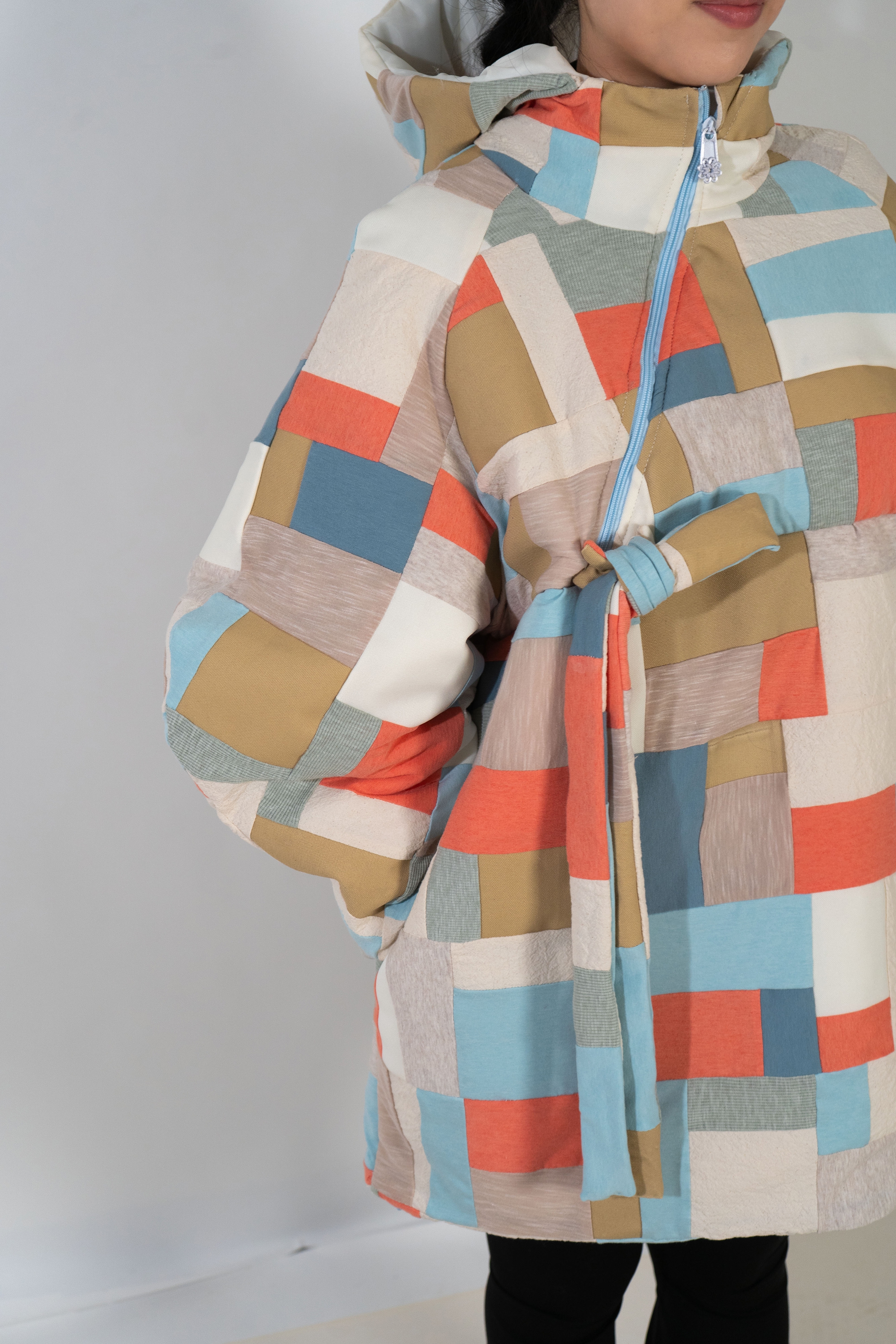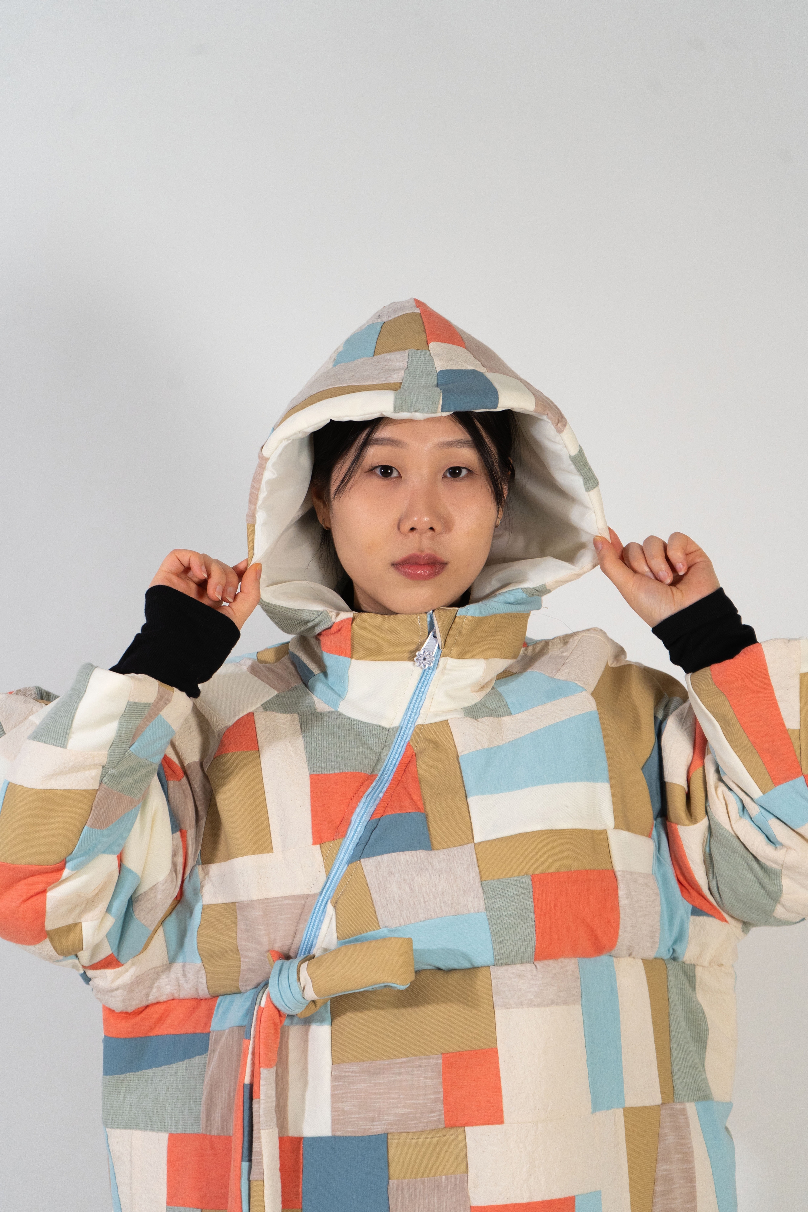 Product Detail The Jogak Jacket is named for its quilting technique, Jogakbo, a Korean style of patchwork made from scrap material. Inspired by this art and the pressing need to address climate change, the shell fabric of this jacket is gathered piece by piece and stitched into a whole using leftover scrap fabric from previous projects at my university. This practice is not only symbolic of snowboarder Chloe Kim’s Korean-American identity, but is a reminder that every step towards sustainability is meaningful.