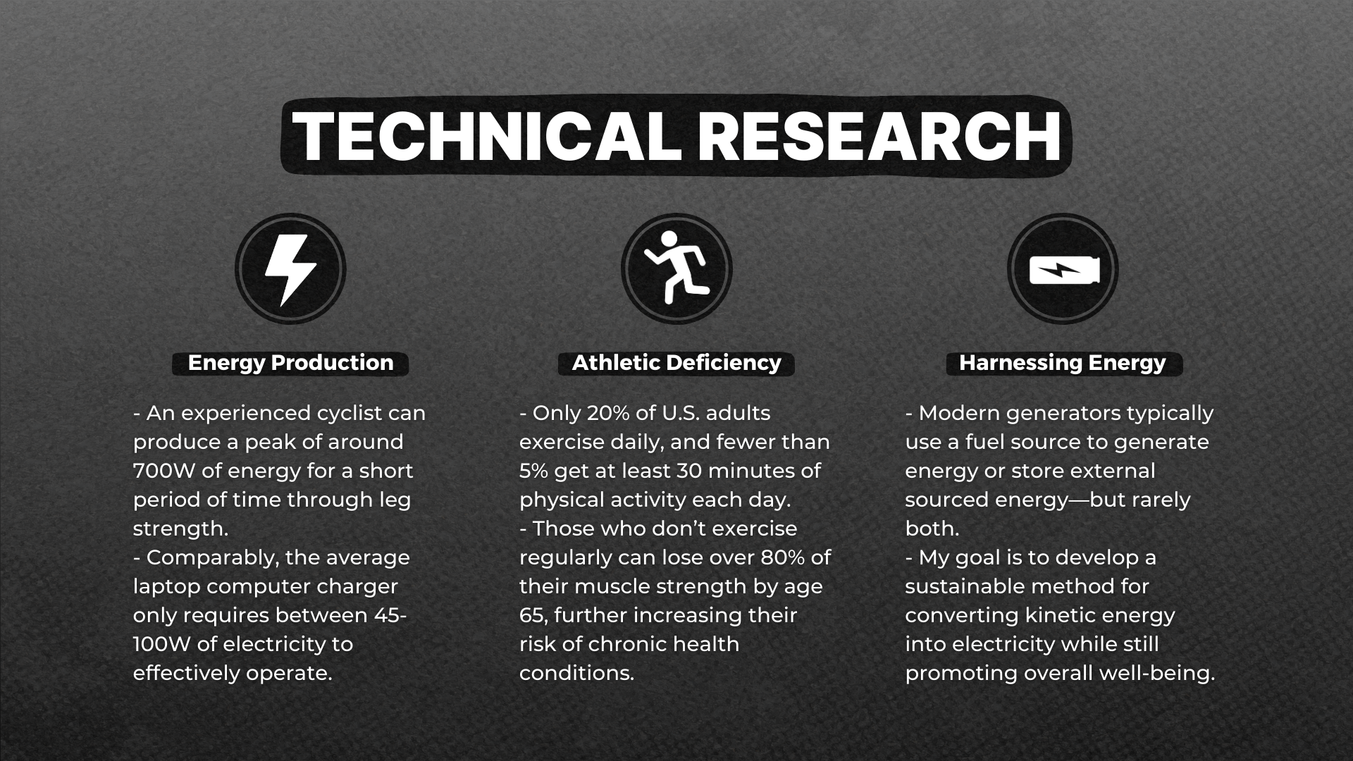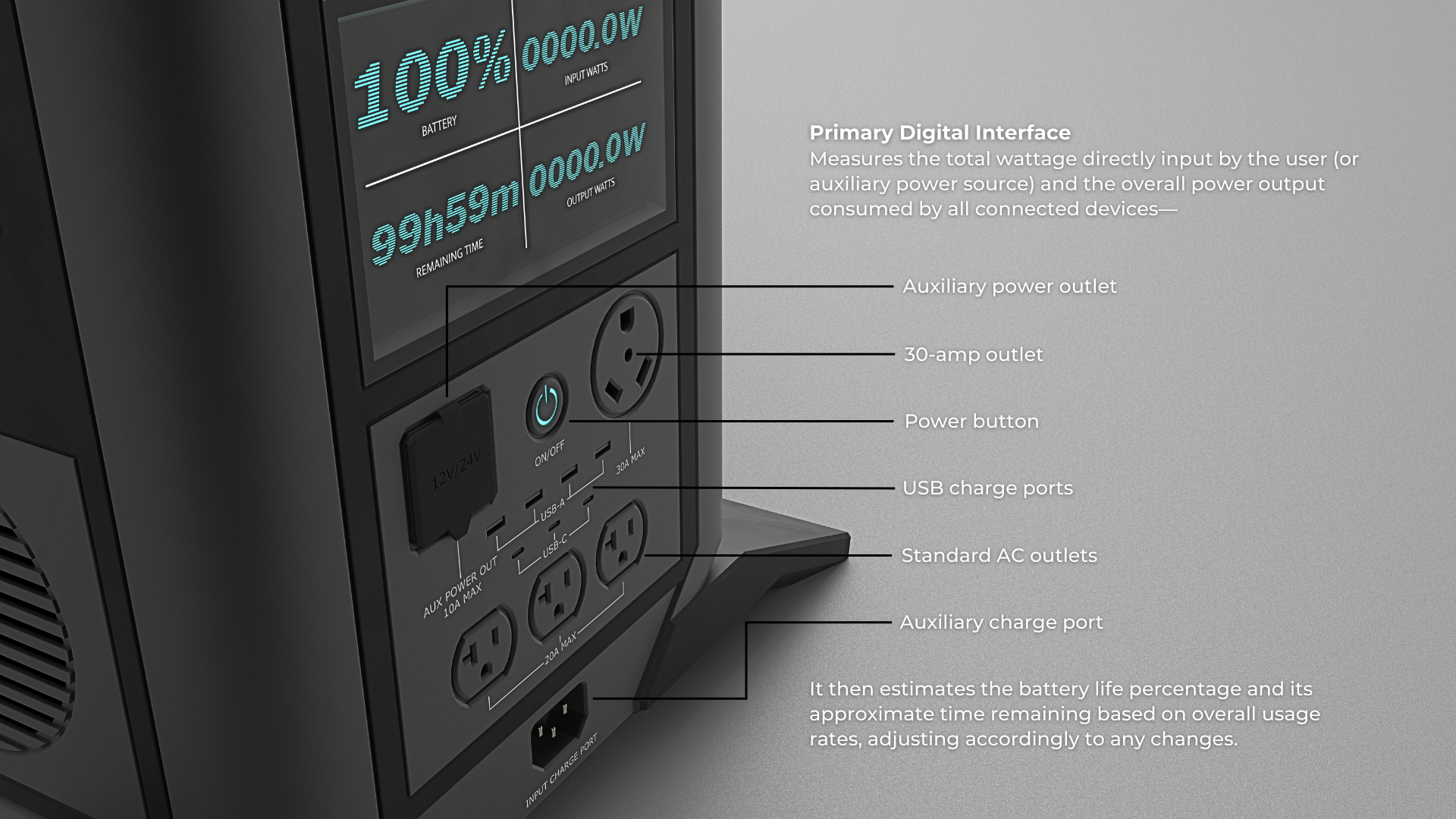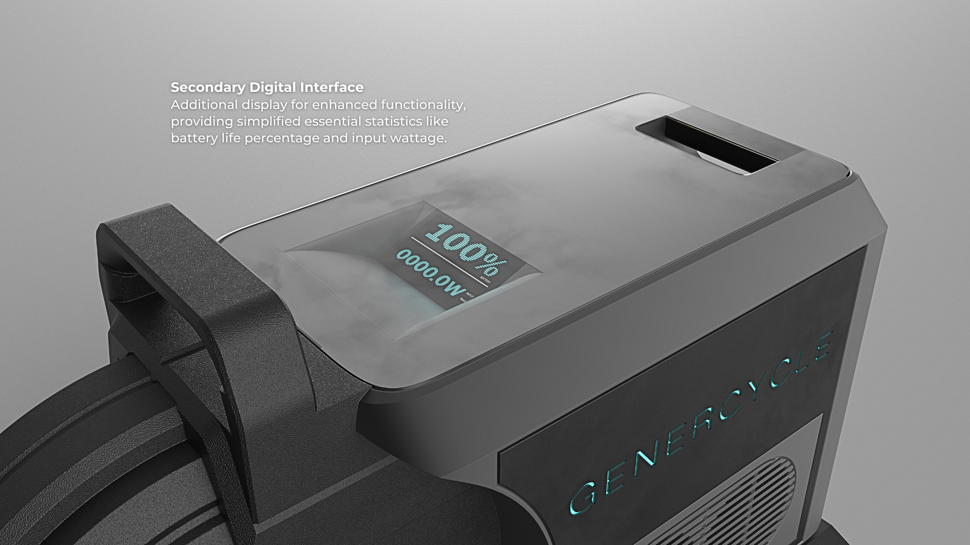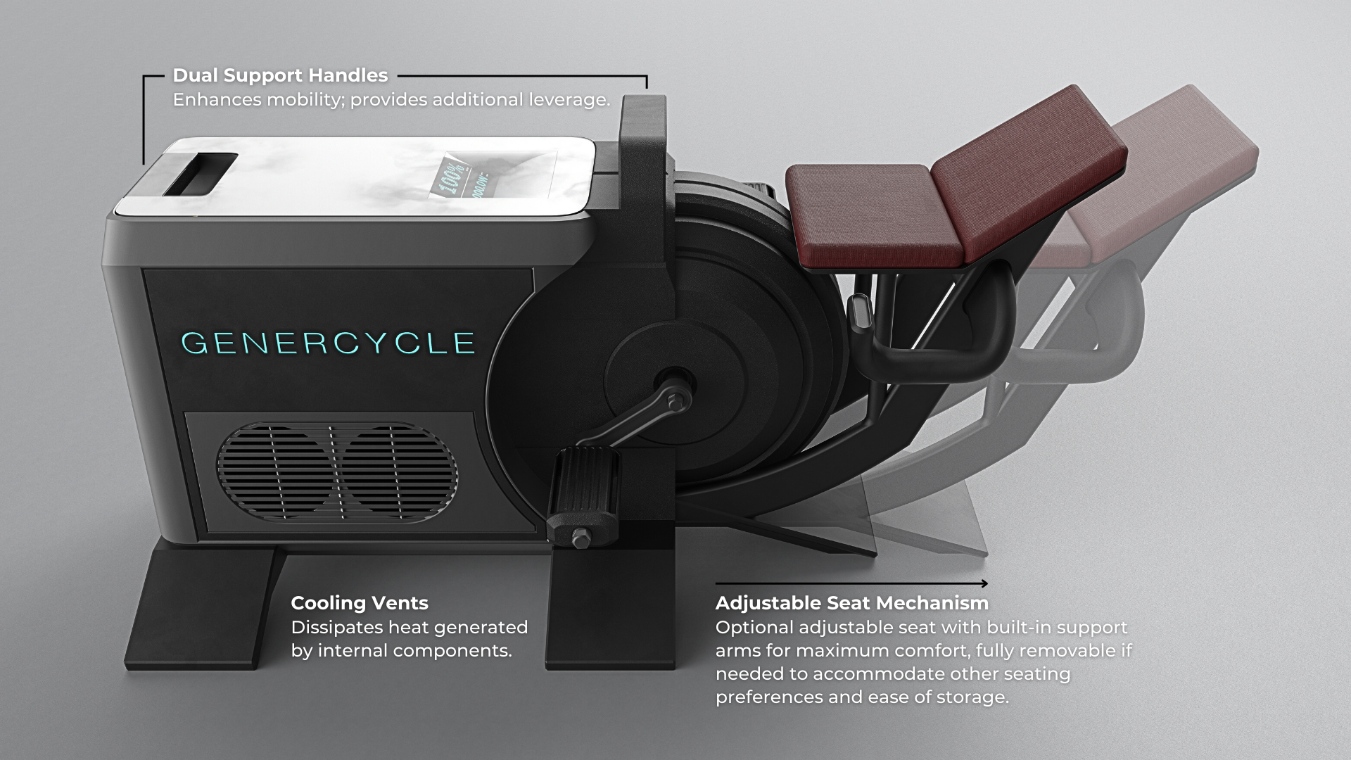 Innovation Utilizing digital interfaces, Genercycle monitors both the total wattage generated by the user—or an auxiliary power source—and the overall power consumption of connected devices. Then, it estimates the time remaining of battery based on the energy input and output differential, adjusting the battery life percentage accordingly based on any changes. Additionally, Genercycle features an adjustable seat mechanism with integrated handles, which is also fully removable to support alternative seating preferences. This adaptable design accommodates a diverse range of users, enhancing both comfort and convenience.