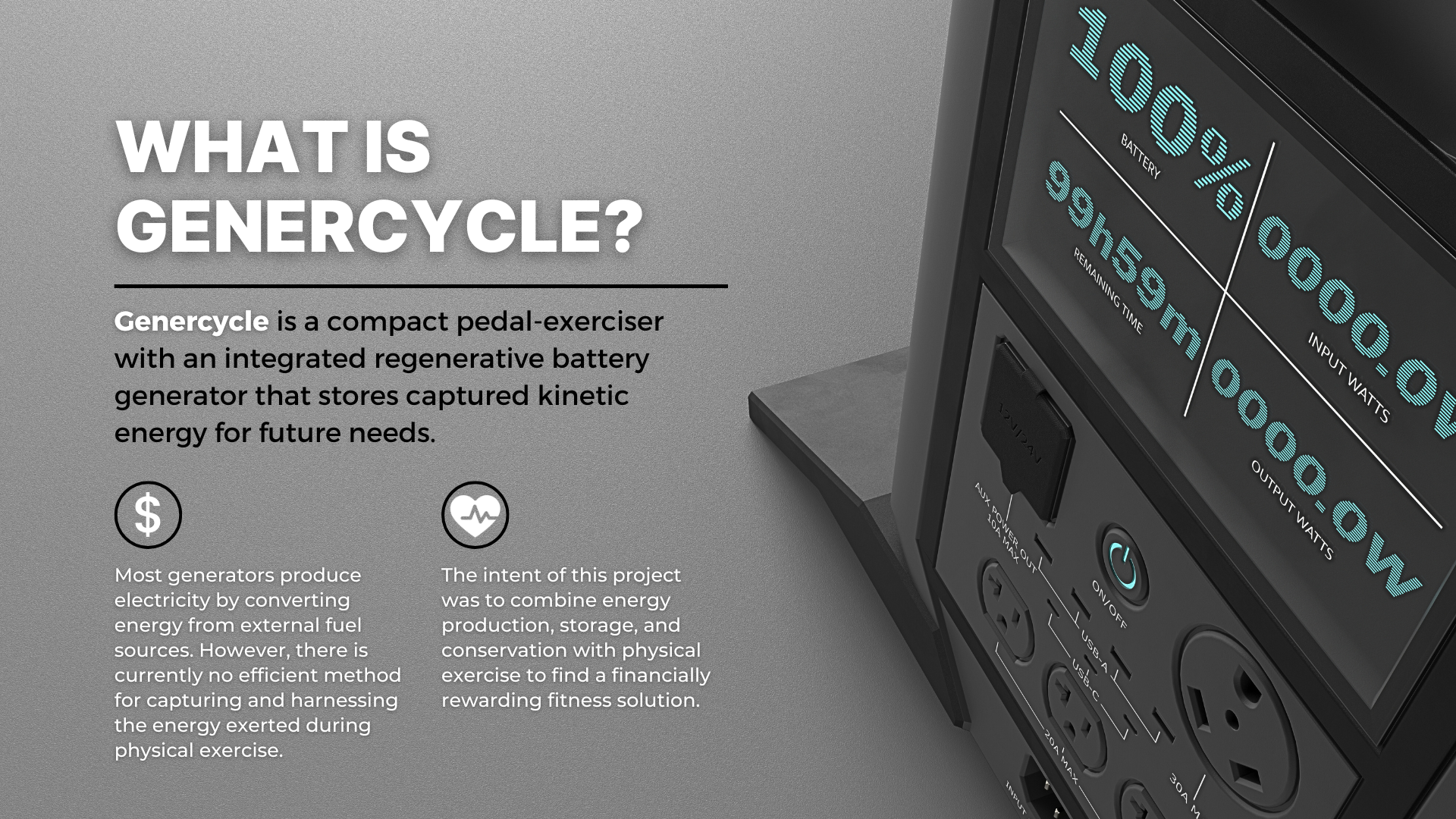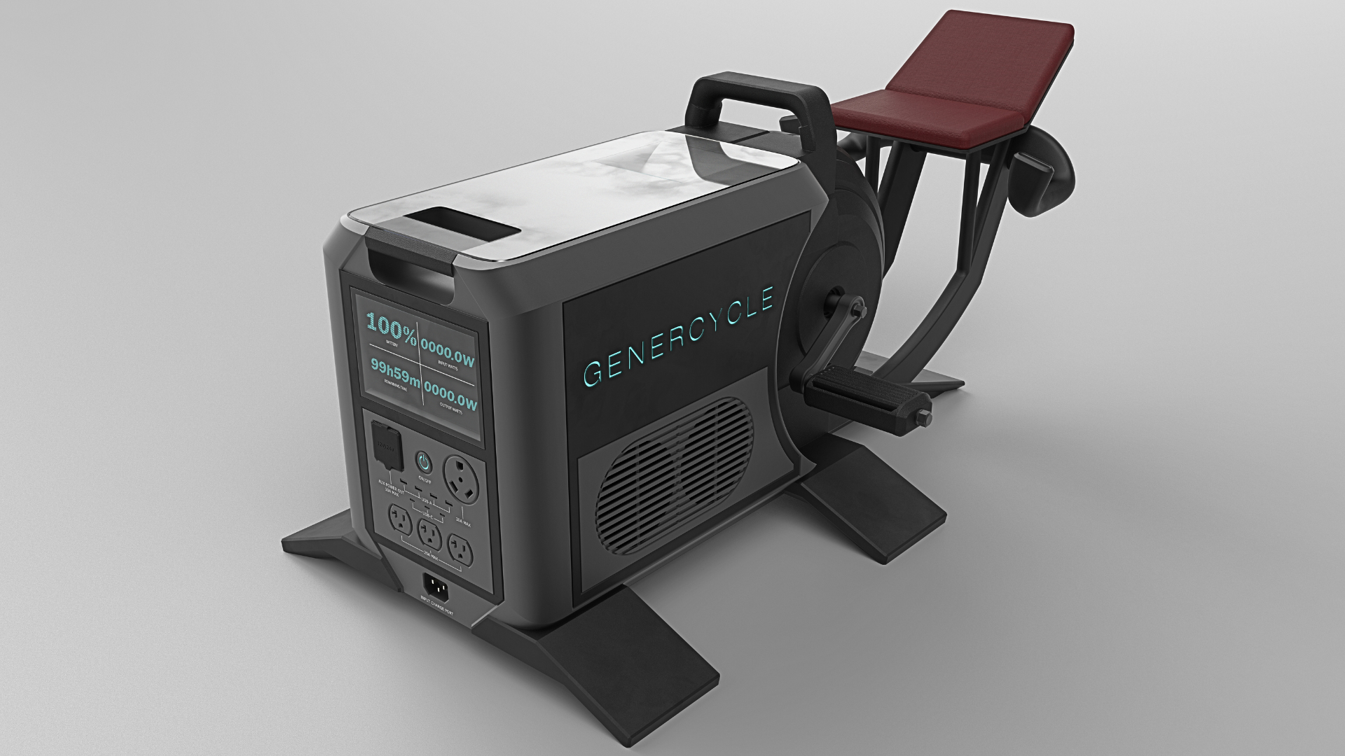 Description Genercycle is a compact, pedal-powered exerciser equipped with an integrated regenerative battery system that is capable of capturing and storing kinetic energy for later use. This innovative device merges physical fitness with sustainable energy generation, aiming to promote health and environmental consciousness simultaneously. The project explores the intersection of exercise, energy production, and conservation—transforming personal fitness into a practical and rewarding source of renewable energy.