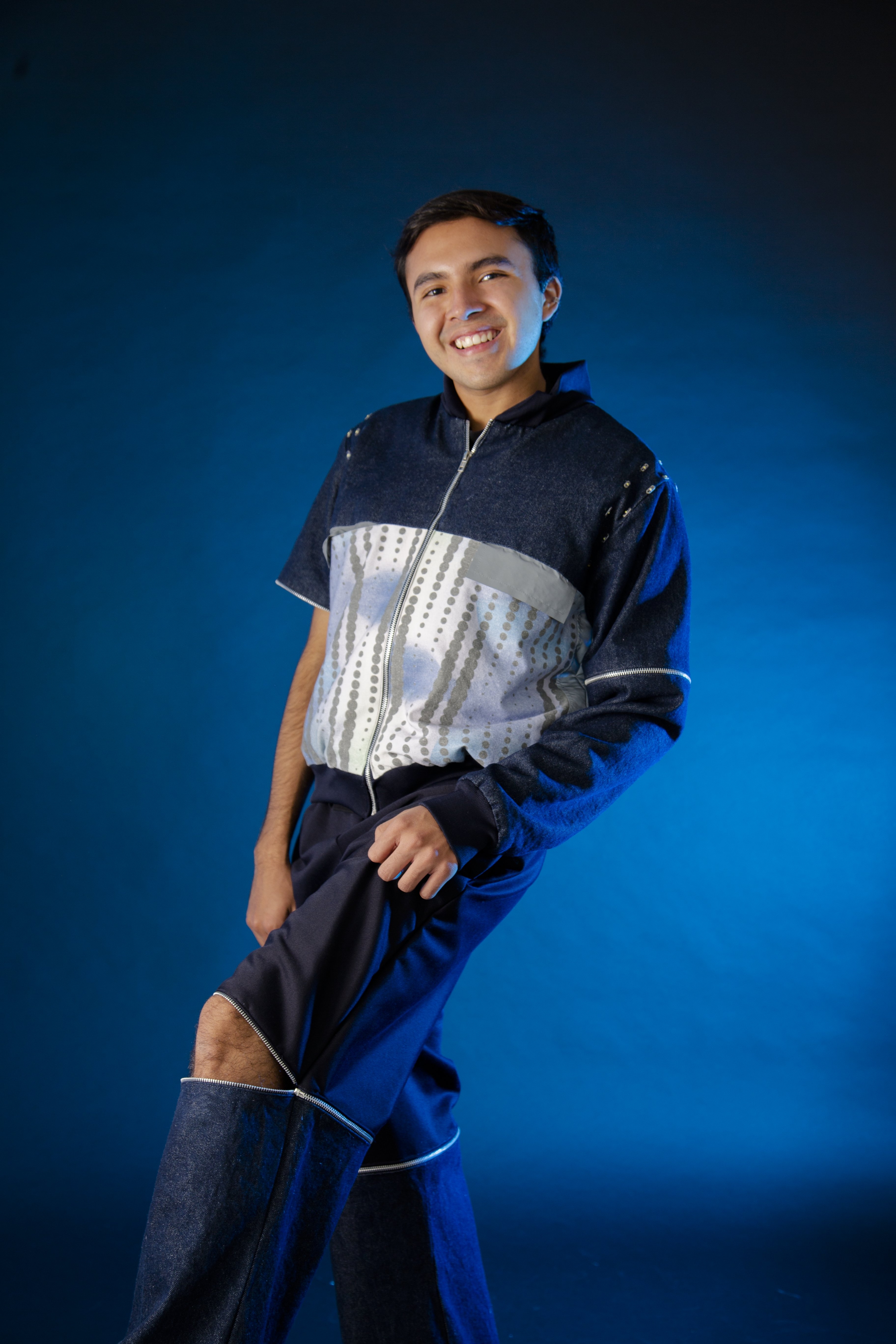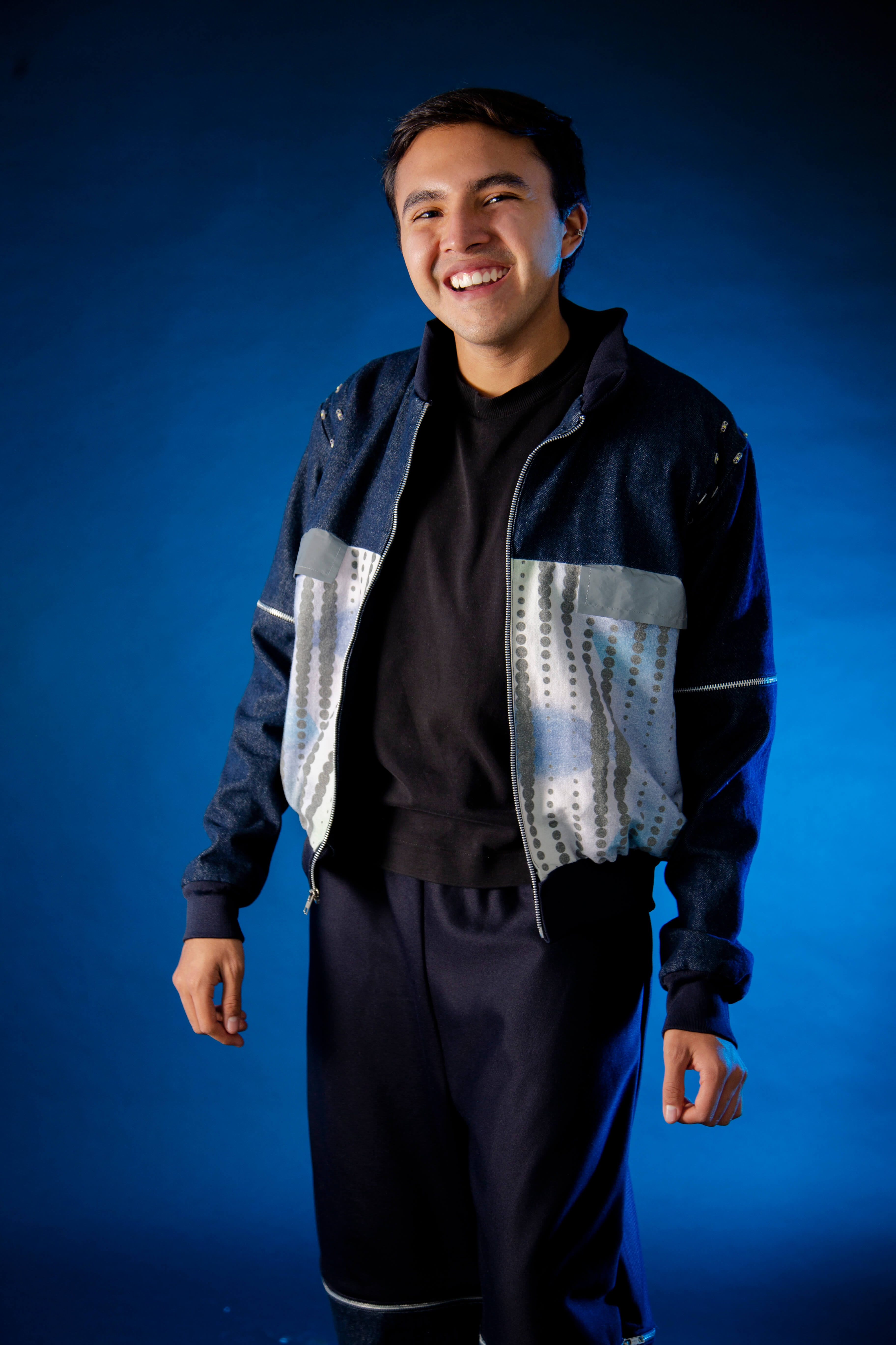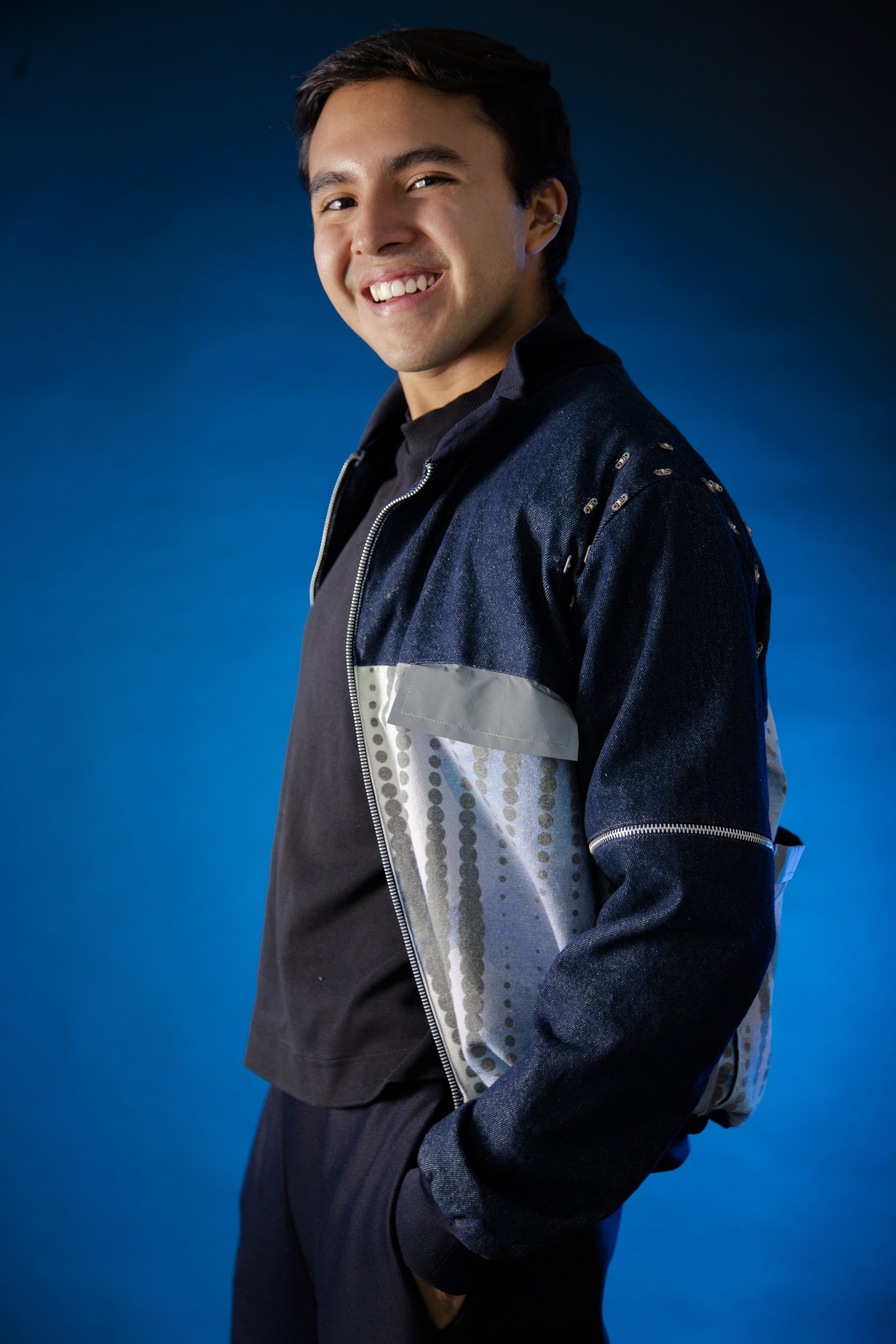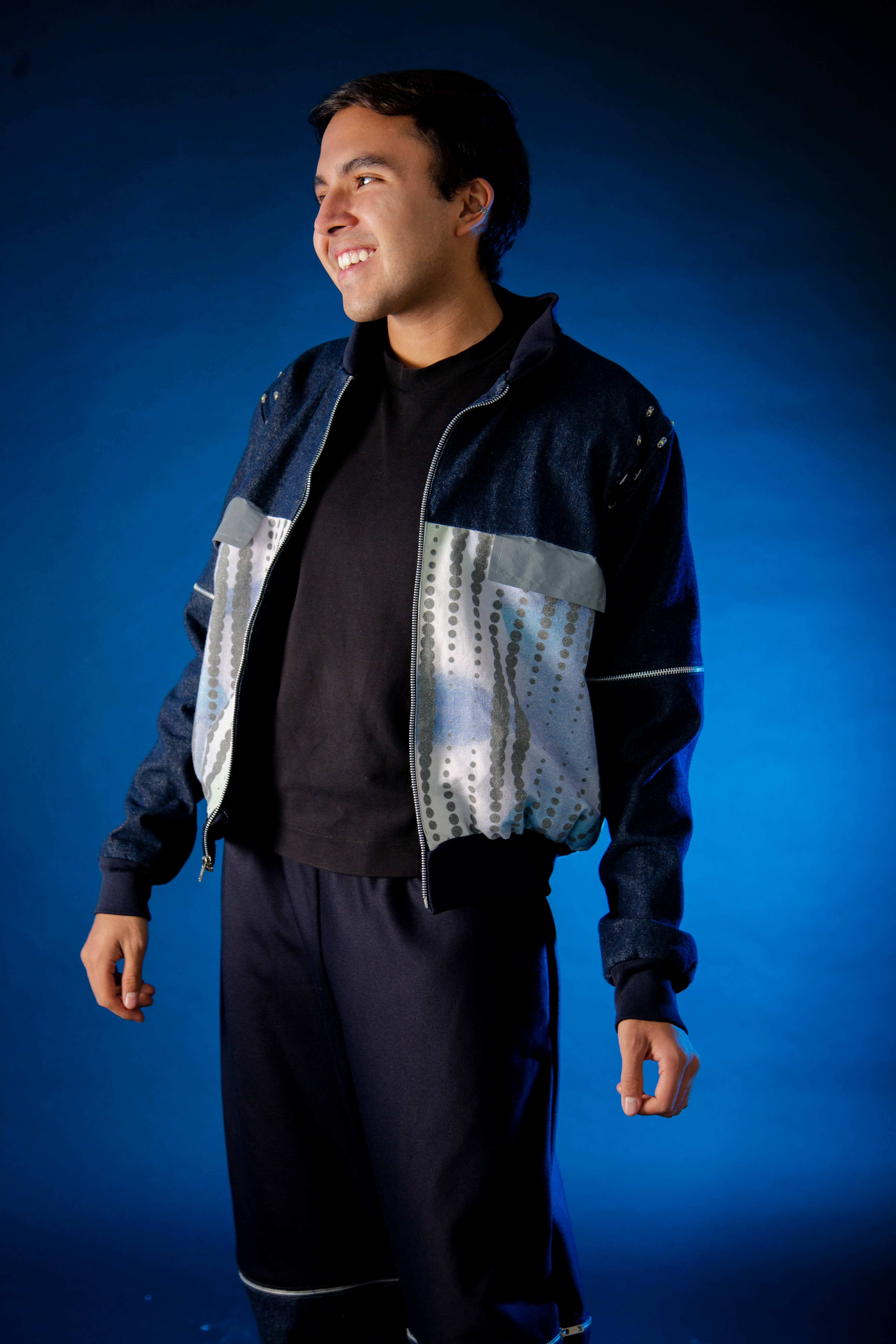 Specification It is a bomber jacket for men. The print of the lower part of the garment is inspired by the macro trend of WGSN, called "Meta-Ready", which corresponds to the season A/W 23724.