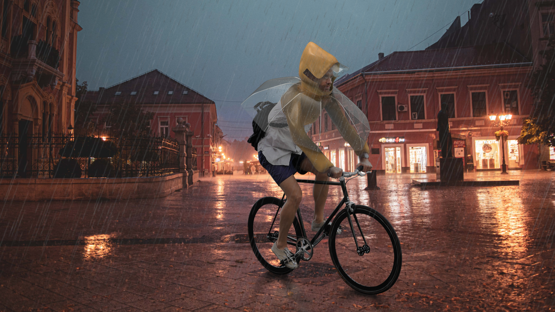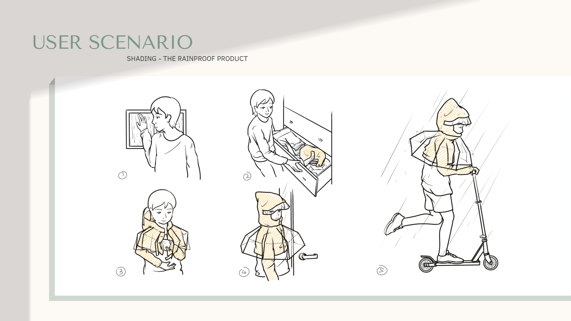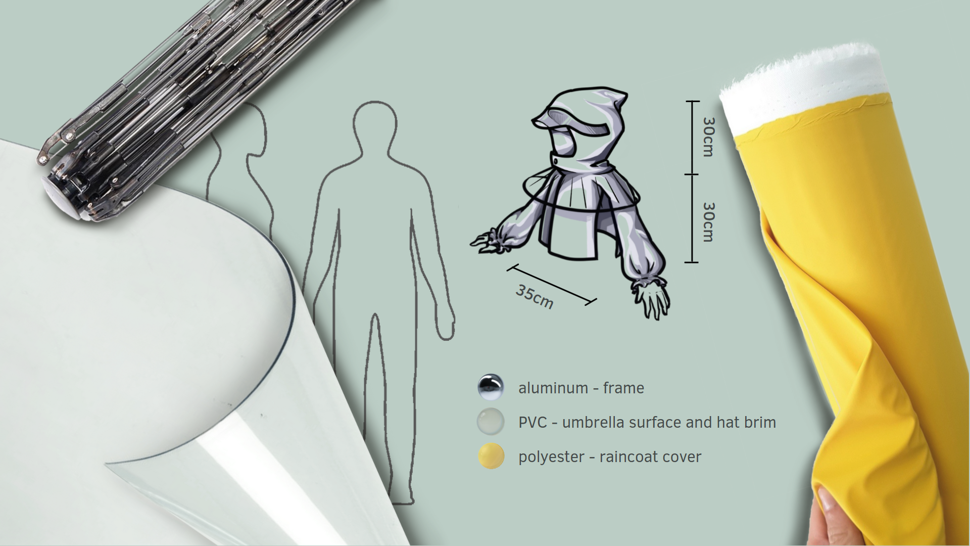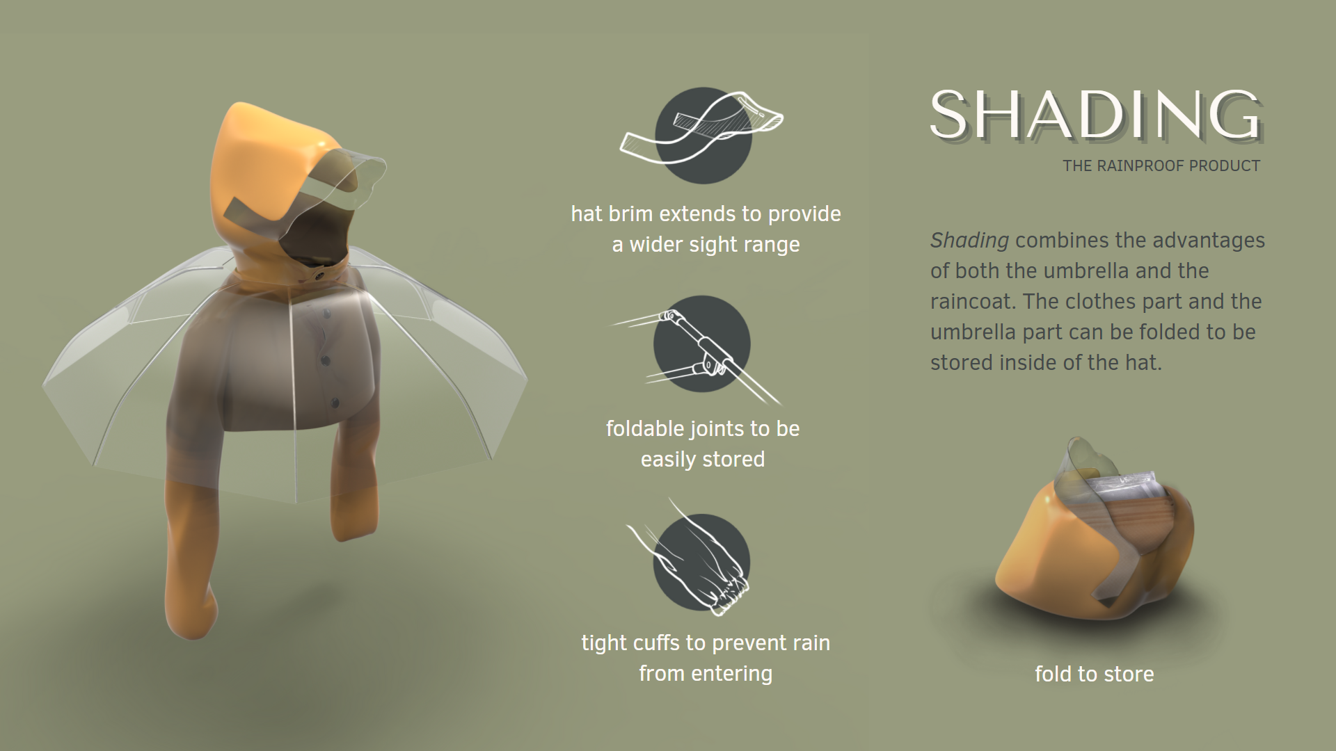 Innovation Compared with the original umbrella design, the height of the umbrella surface decreases, and the edge extends downward to reduce the entry of rainwater. The clothes part and the umbrella part can be folded to be stored inside of