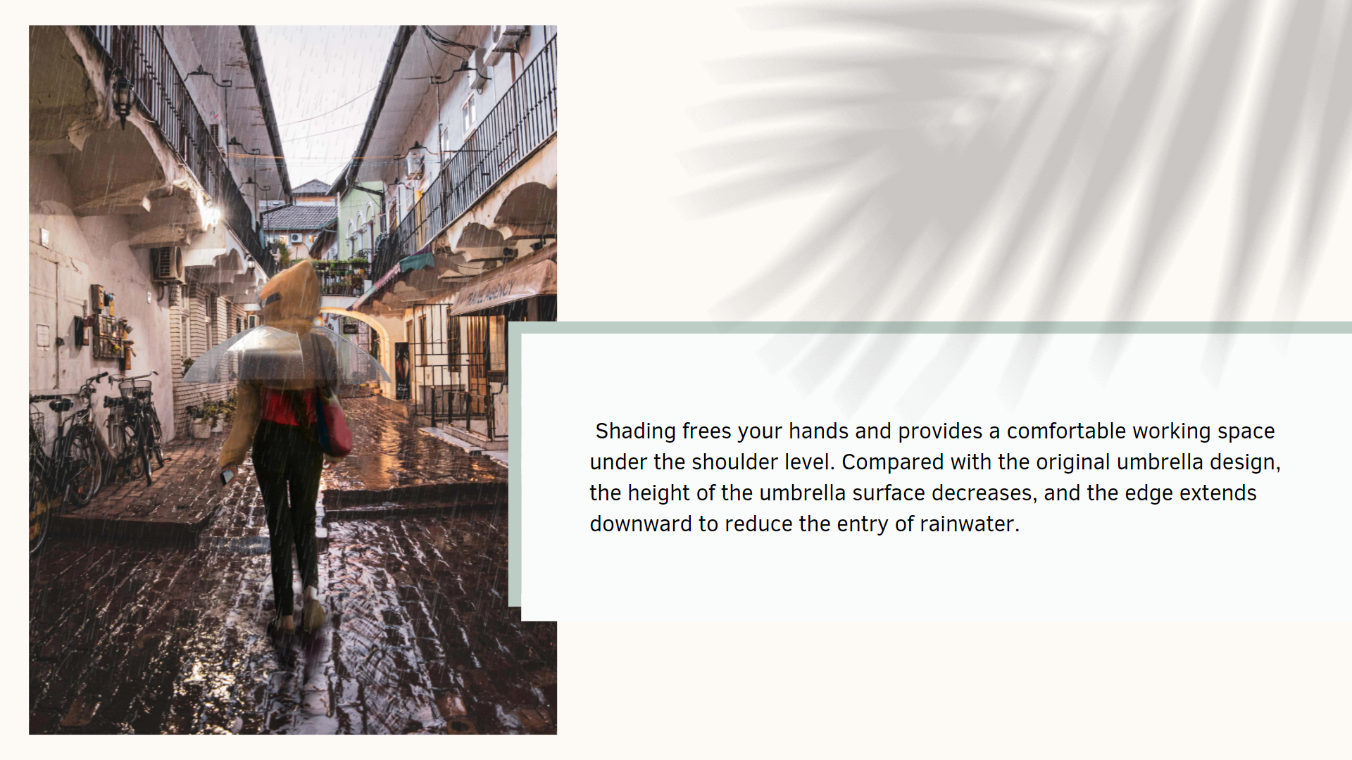 Description People use rainproof products like umbrellas and raincoats to protect themselves from rain. But both of them have limitations to move comfortably duringuse. It also takes a hand to carry the umbrella. Shading combines the advantages of both the umbrella and the raincoat. Shading frees hands and provides a comfortable working space under the shoulder level.
