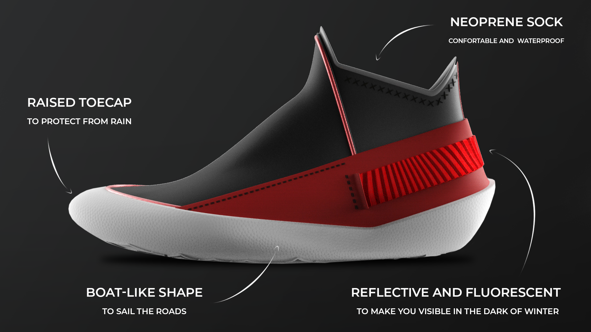 Description Pluviam is a new concept of footwear, made up of fabrics that not only seek users' comfort, but also their protection on the road. In cold seasons, rain, fog and other meteorological conditions cause a visibility reduction over medium and long distances. This is a real danger for all people who share the road with vehicles. Even more when there are not even raised sidewalks. In this way, Pluviam tries to be a protection system for the user, taking advantage of fluorescent, waterproof and high quality fabrics to provide comfort and safety. With Pluviam, You will stay safe, dry and visible.