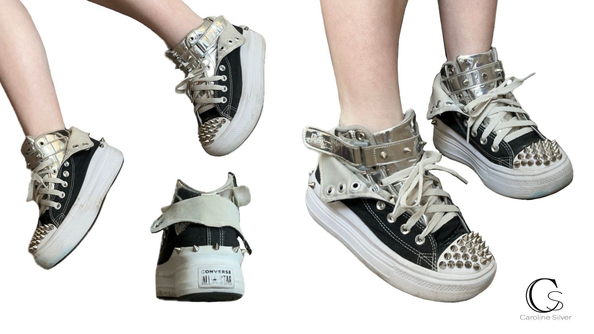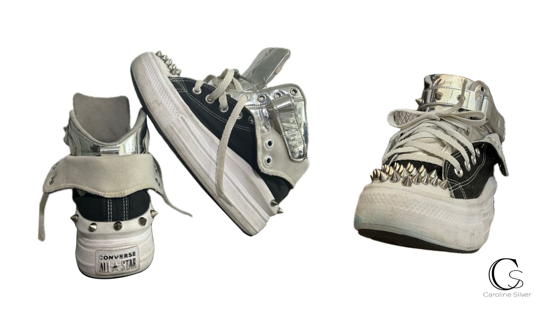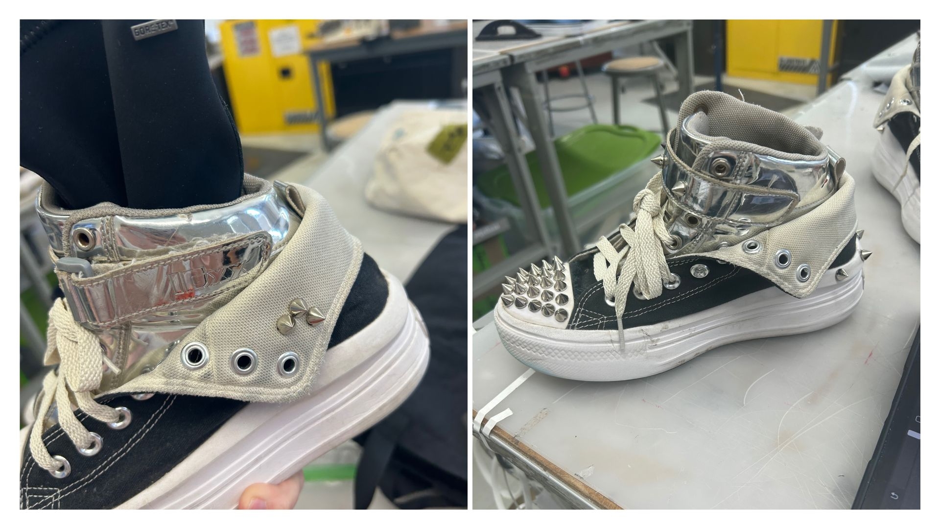 Description Two older pairs of shoes fused together to create a new pair. The updated pair features metallic uppers placed inside a pair of converse that are folded over on the sides. Lastly the shoes are then outfitted with spikes and laces.