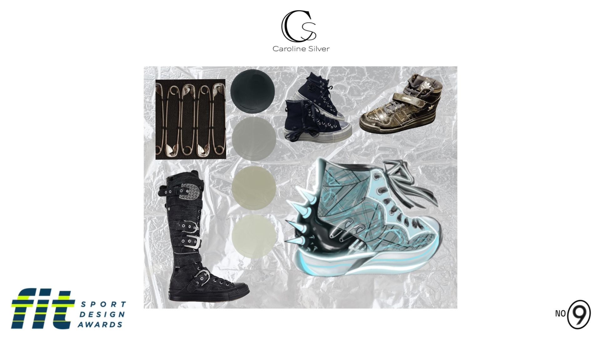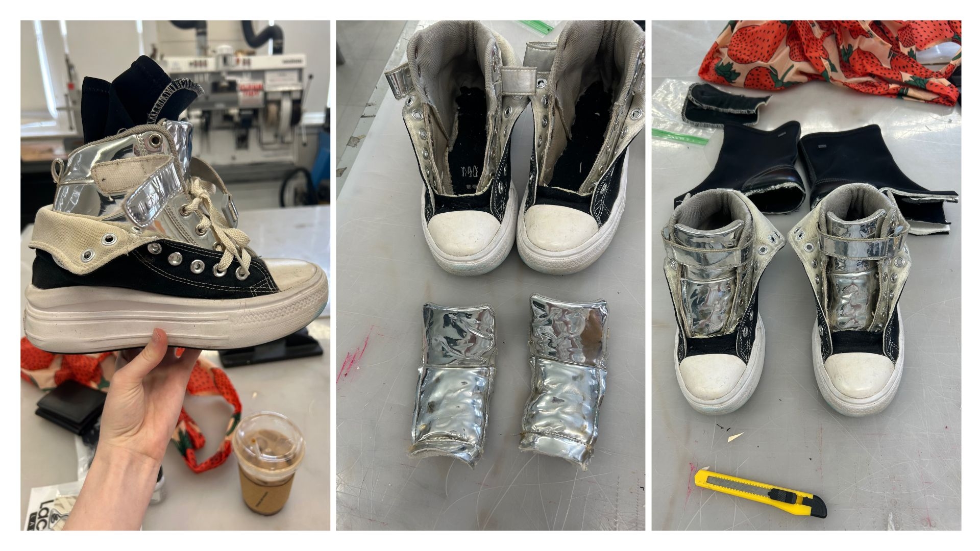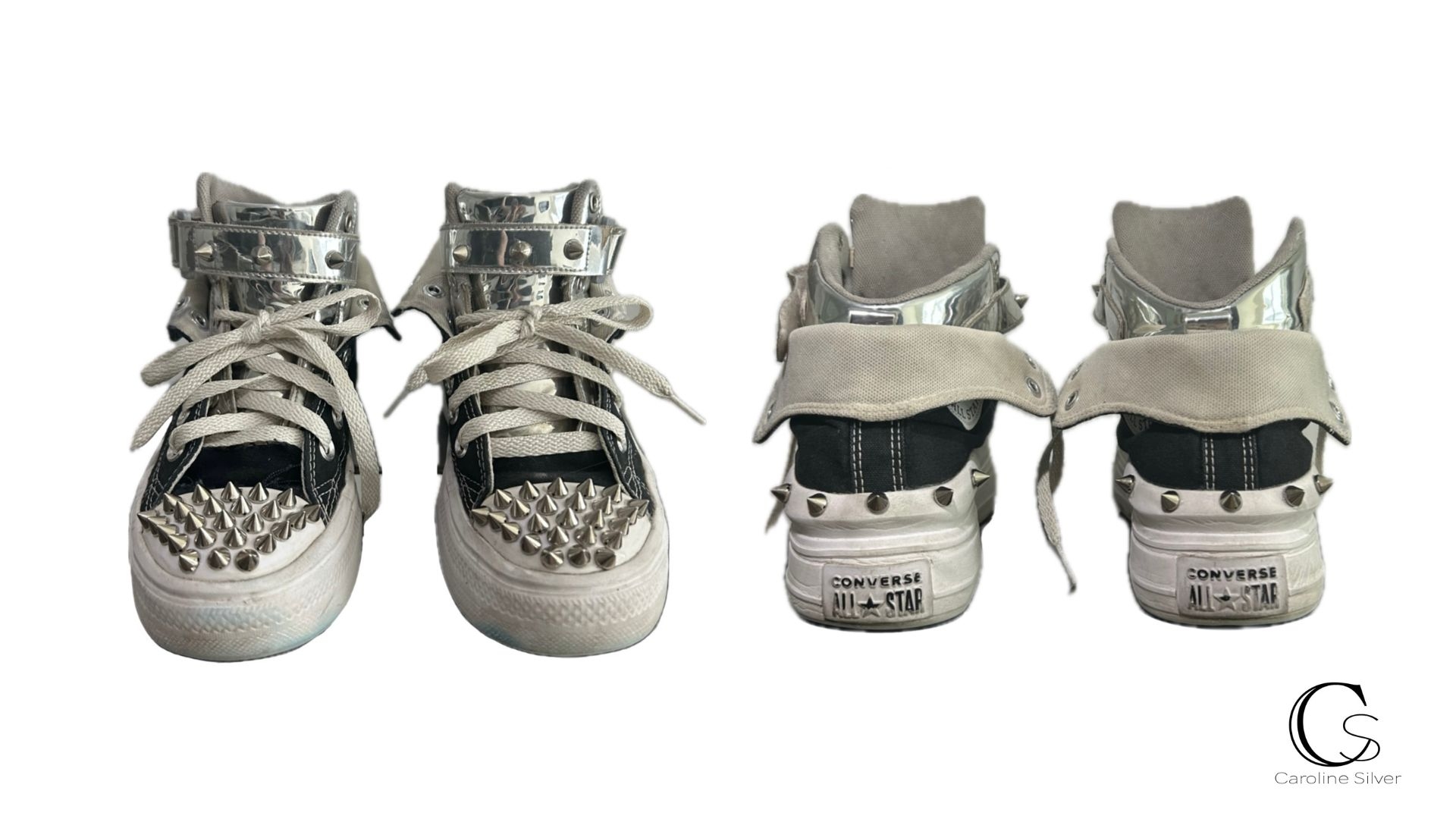 Description Two older pairs of shoes fused together to create a new pair. The updated pair features metallic uppers placed inside a pair of converse that are folded over on the sides. Lastly the shoes are then outfitted with spikes and laces.