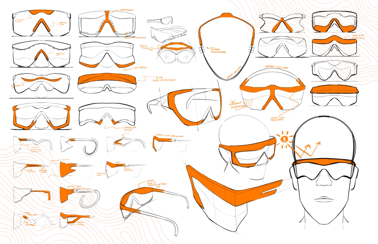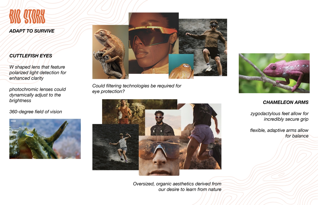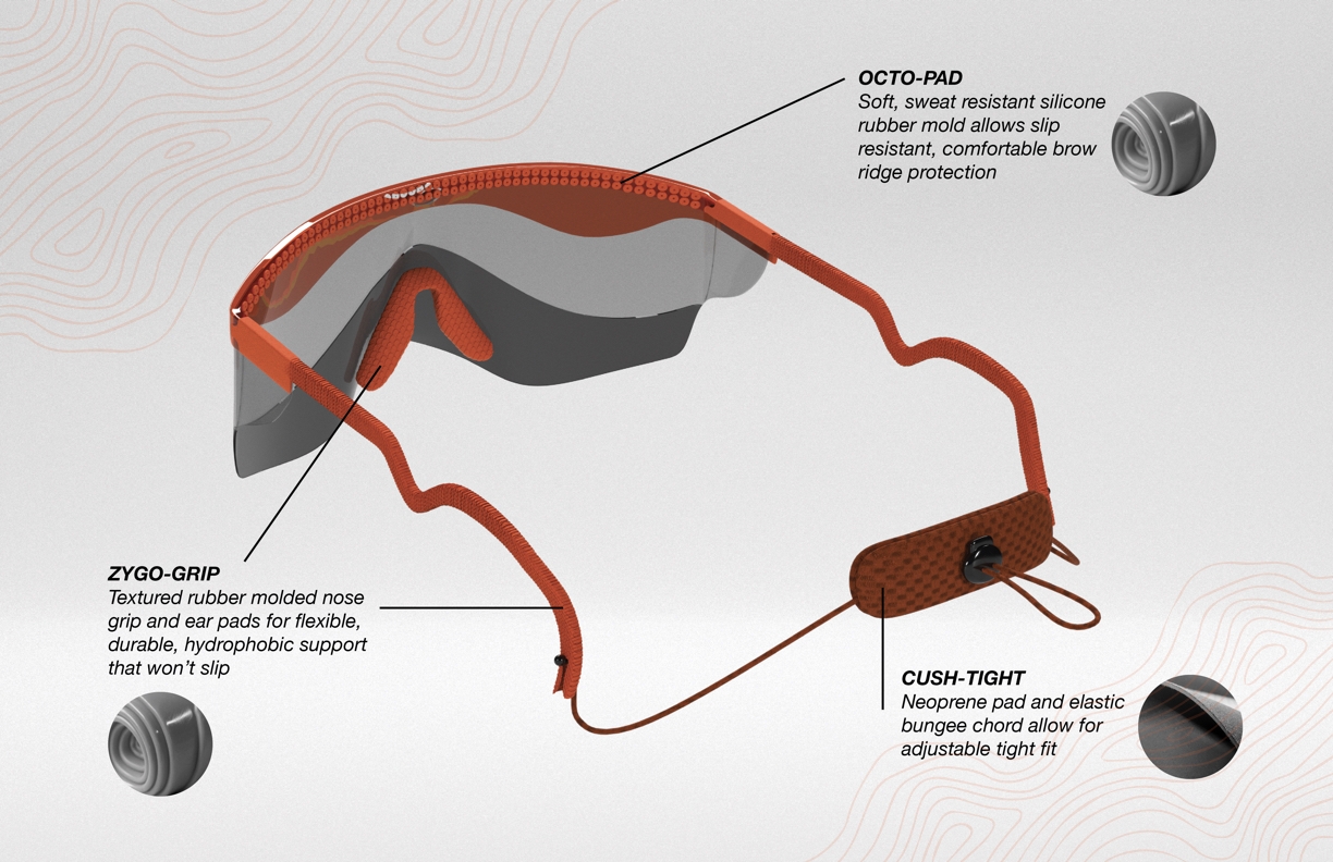Biomimicry Inspiration: Chameleon arms. The temple grips adapt to the wearer's head, providing a secure, slip-free fit even during intense activity.