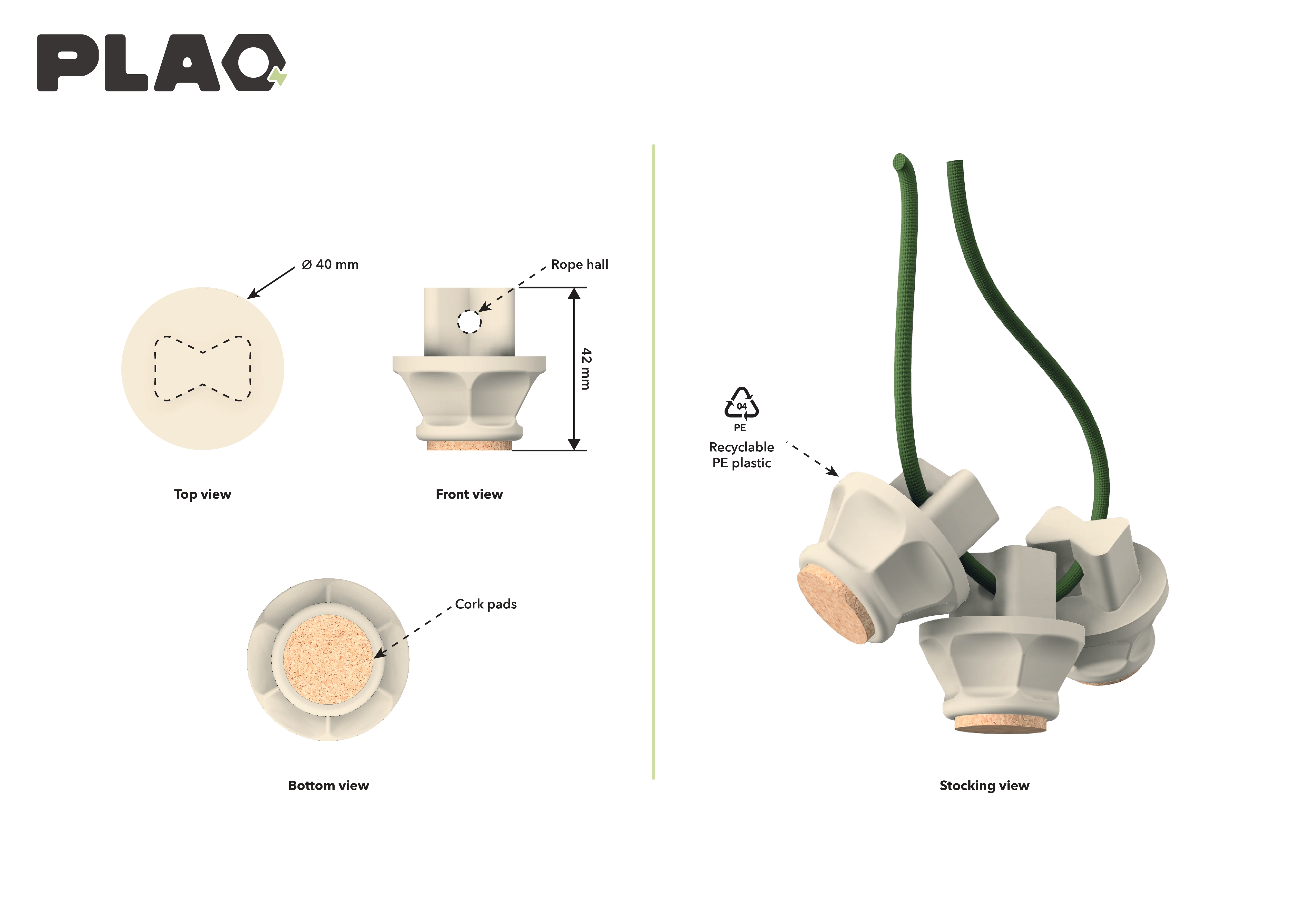 The legs of the tabletop are made from recyclable polyethylene (PE) from a recycling network, reducing the consumption of virgin resources. This material guarantees a long lifespan while offering an eco-responsible solution, and can be easily recycled at the end of its life. To enhance the stability of the tray while adding an aesthetic touch, the legs have cork pads on the underside to absorb any unevenness in the floor.