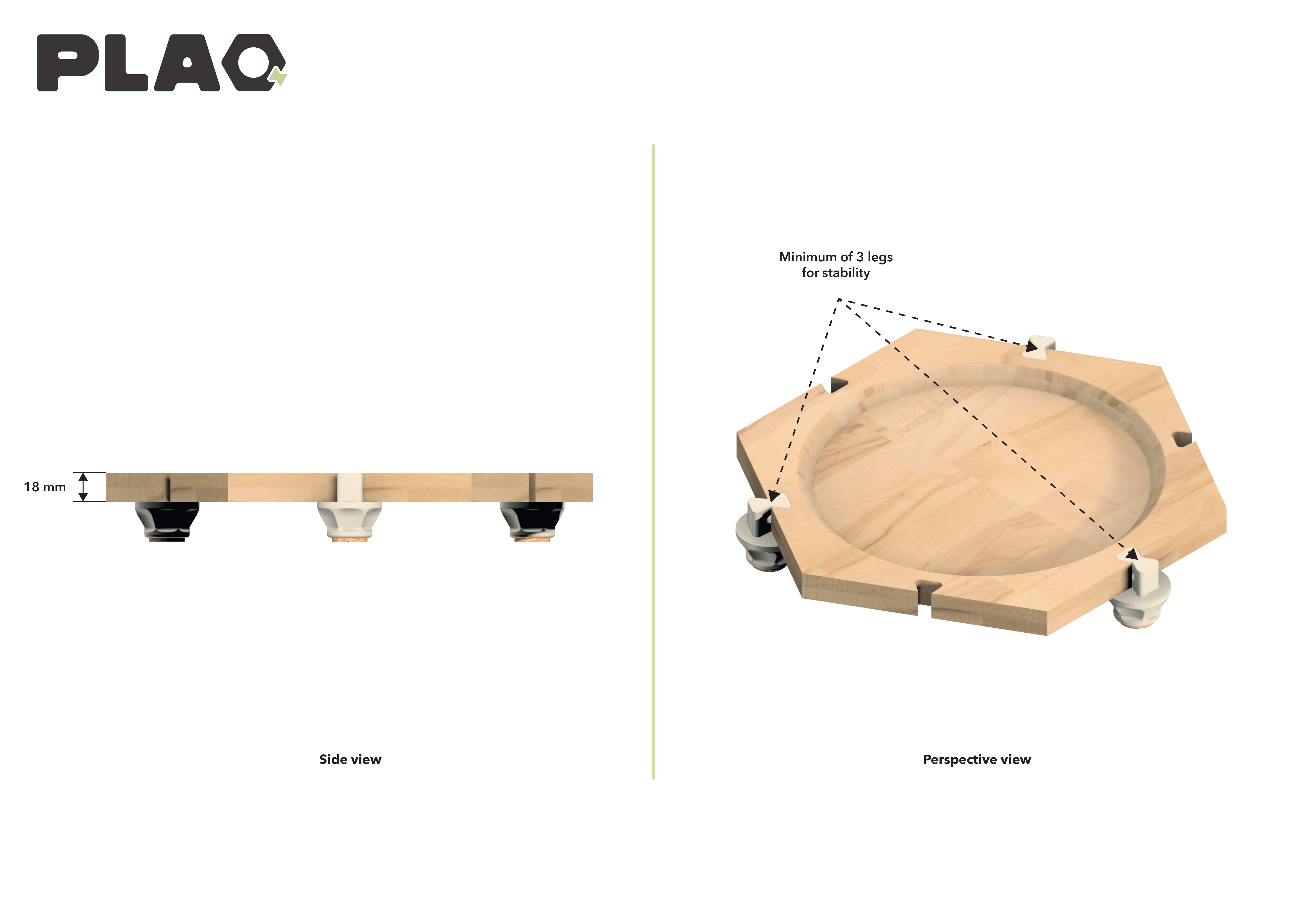 Specification The concept of this kit is based on a design that facilitates affordance: a simple machined wooden tray, weighing around 475 g, with a thickness of 18 mm and a diameter of 300 mm. This is complemented by three feet in recycled PE for optimum flexibility, each weighing 25 g and measuring 42 mm high and 40 mm in diameter. With a total weight of just 550 g, this kit is easy to attach to a bag and is perfectly suited to the specific constraints of outdoor adventures, combining lightness and ergonomics.