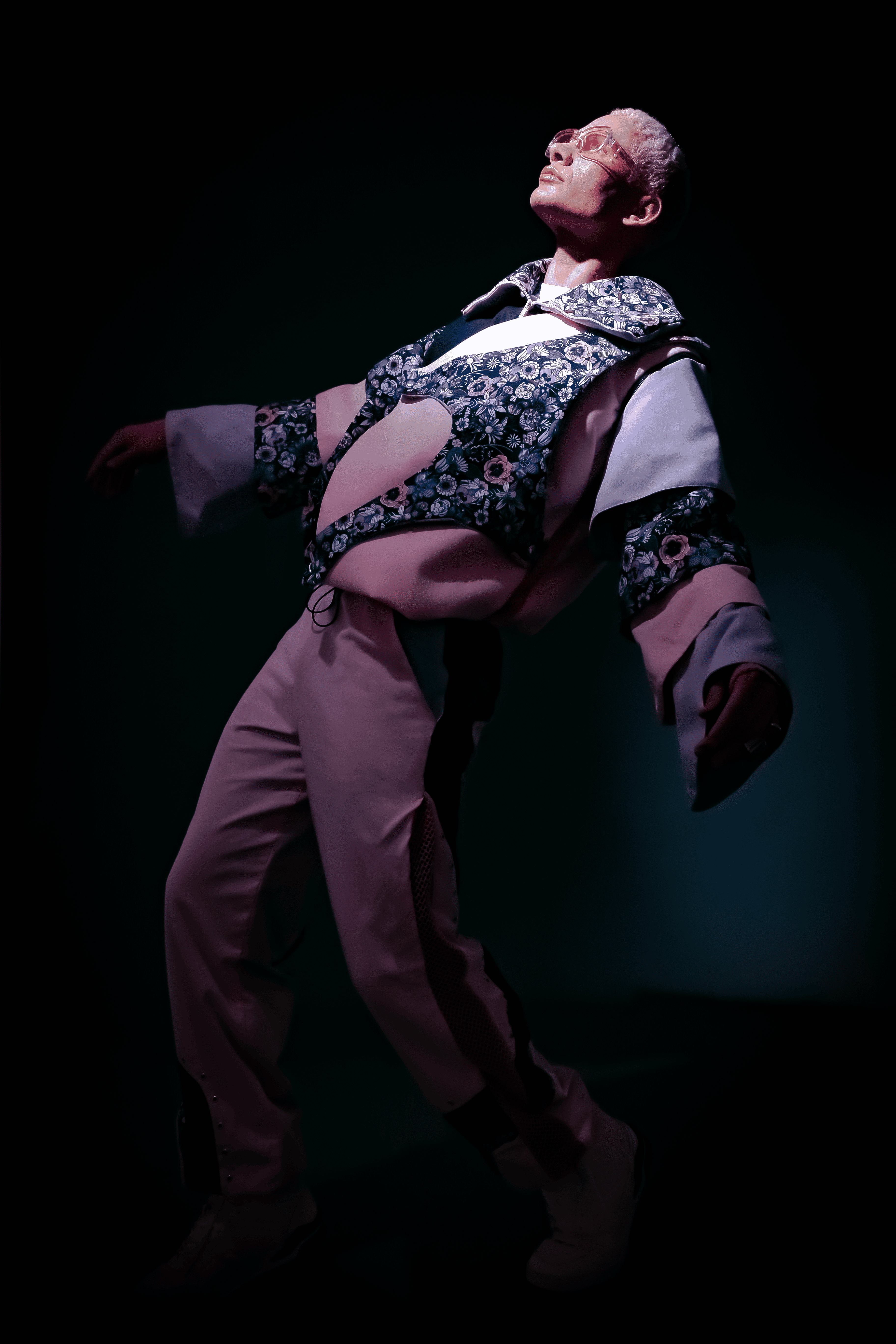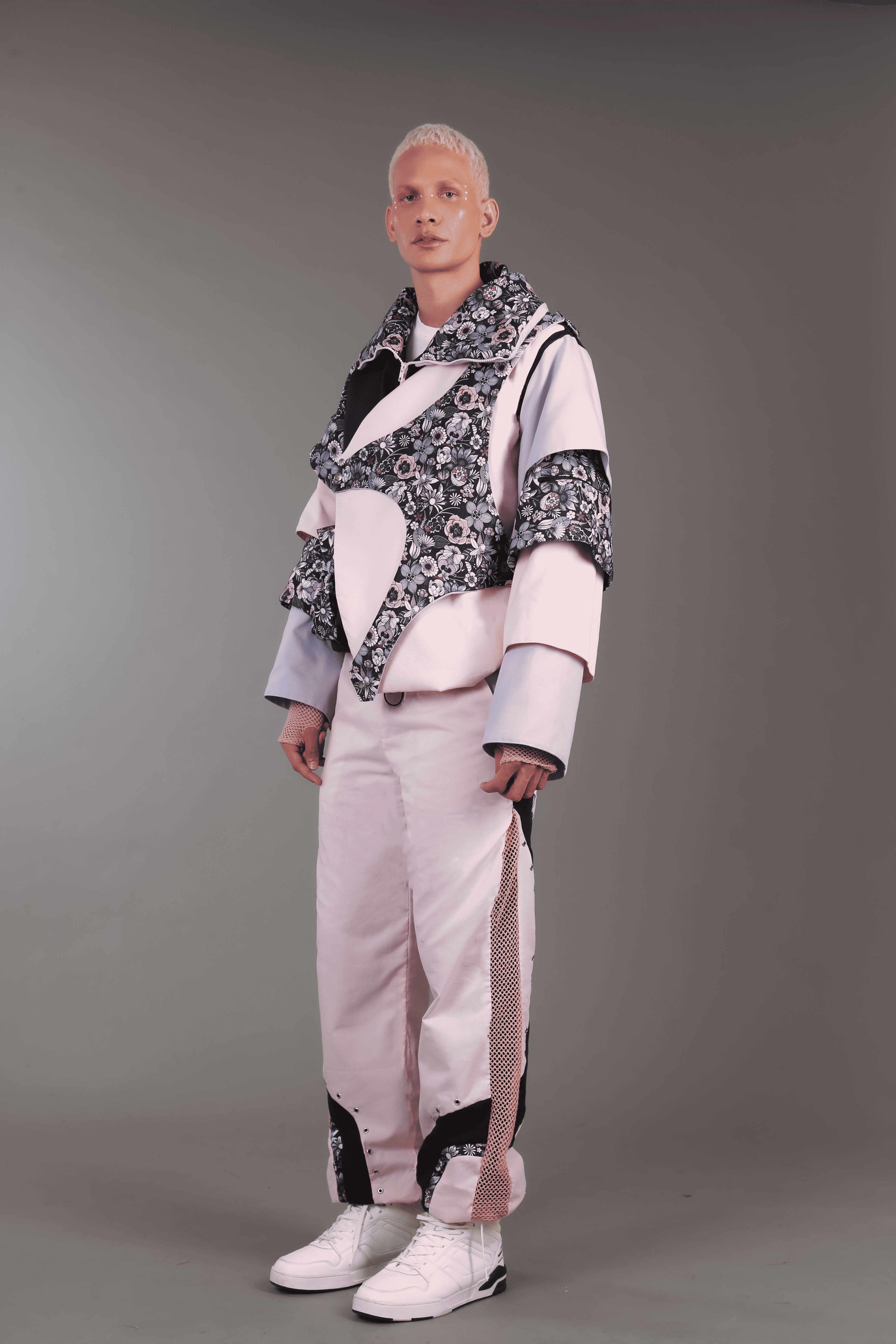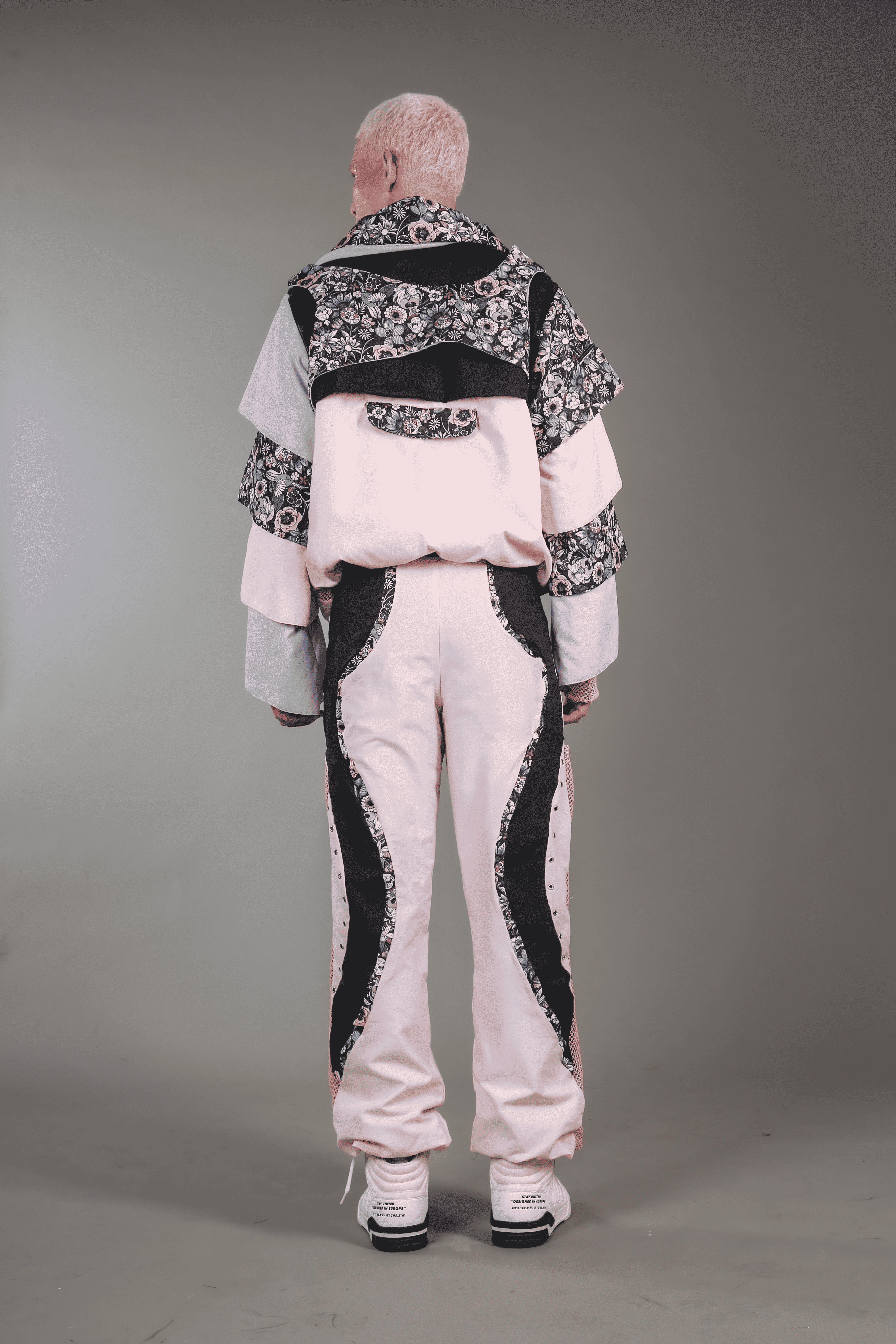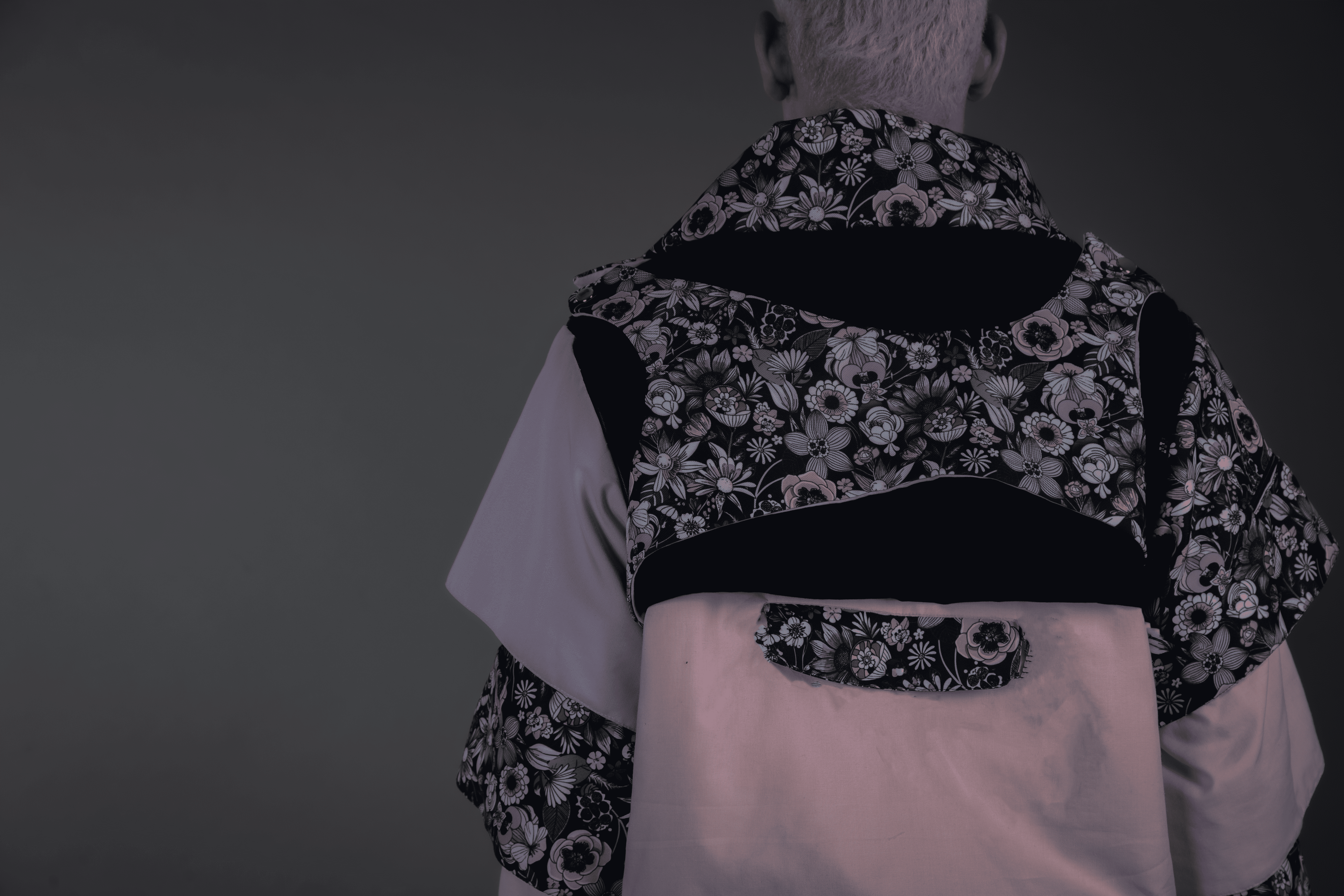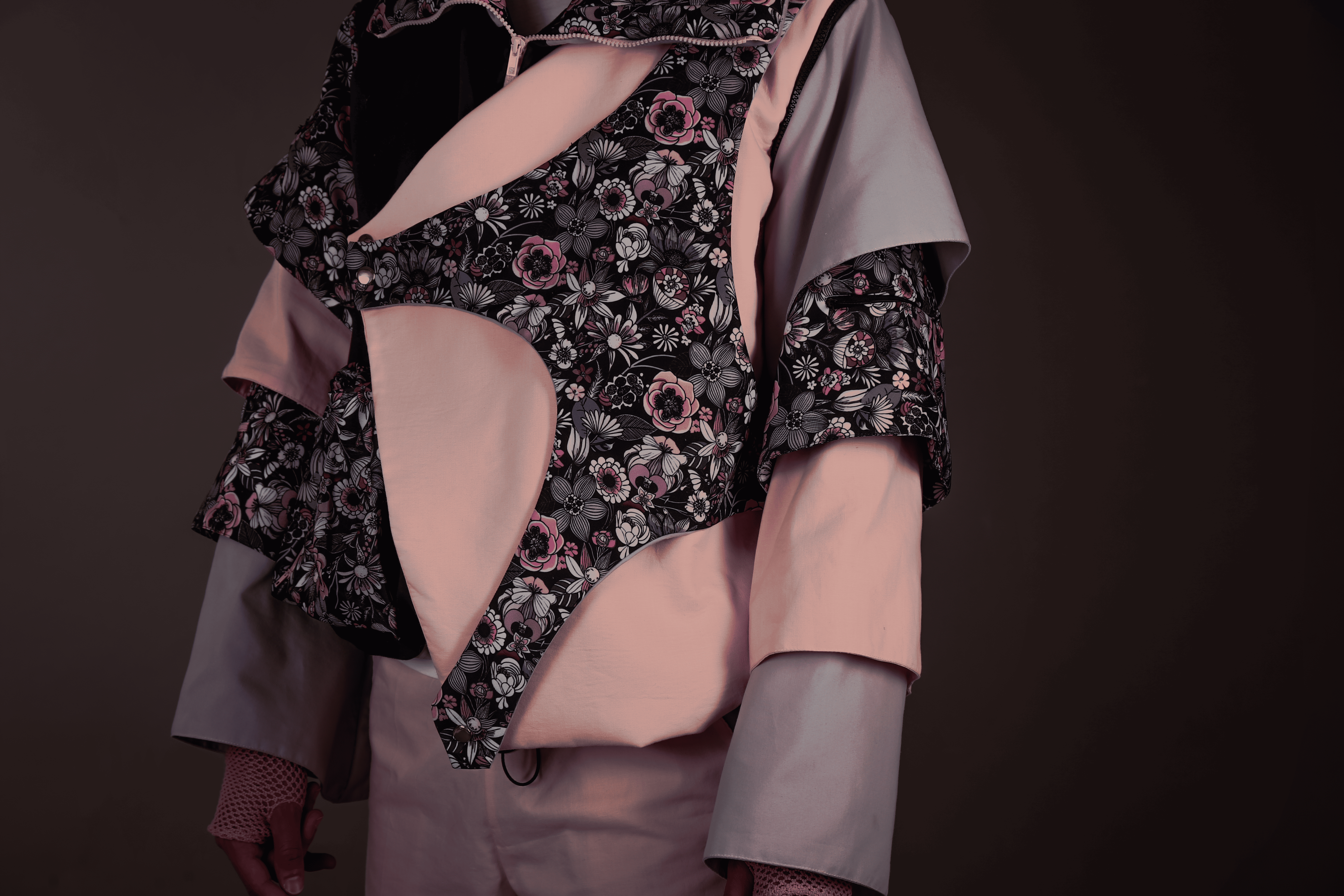 Description UPPER: Bomber jacket with detachable sleeves that can be stored in the collar of the garment, turning it into a travel pillow. This jacket integrates two pieces printed in amorphous figures, which can be disassembled according to the customer's preferences. It has three outer pockets and three additional pockets on the printed sleeves, offering a total of six pockets throughout the garment. It also has a mesh on the sides that provides ventilation to combat the heat in public transport, and hangers at the bottom to adjust the garment in a comfortable and functional way.