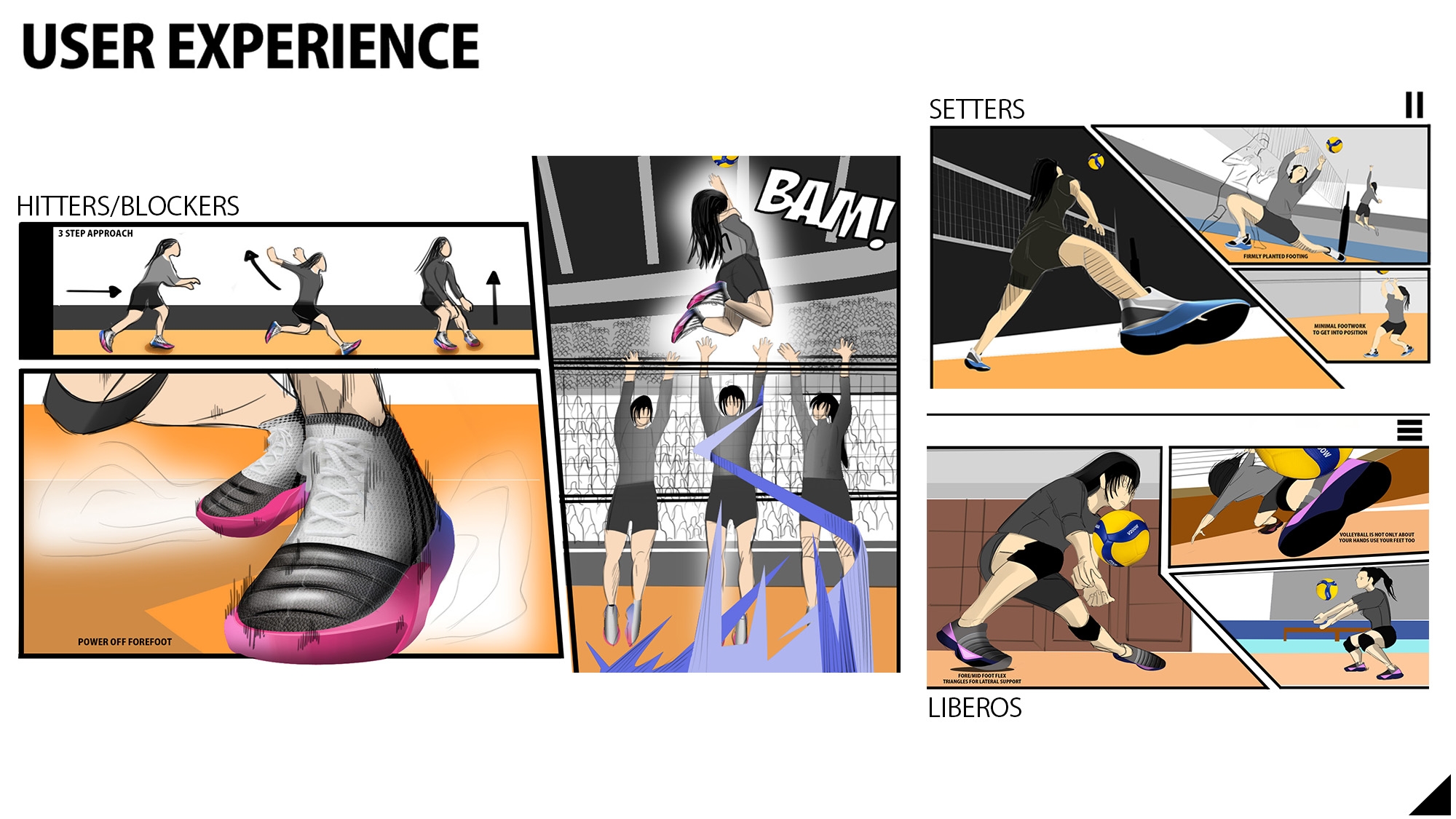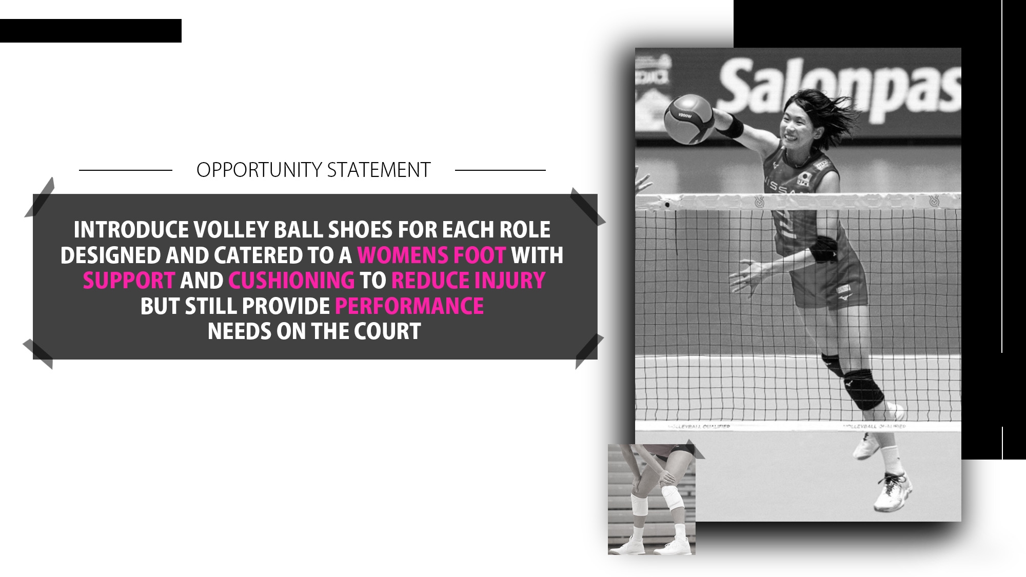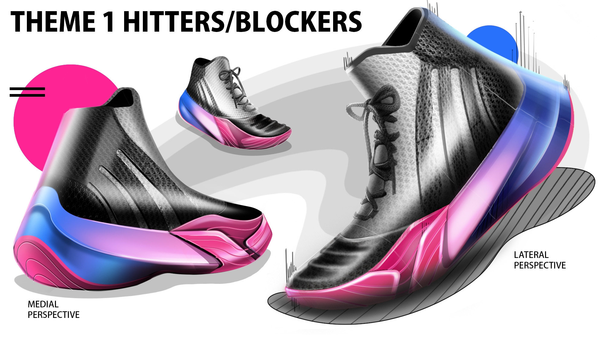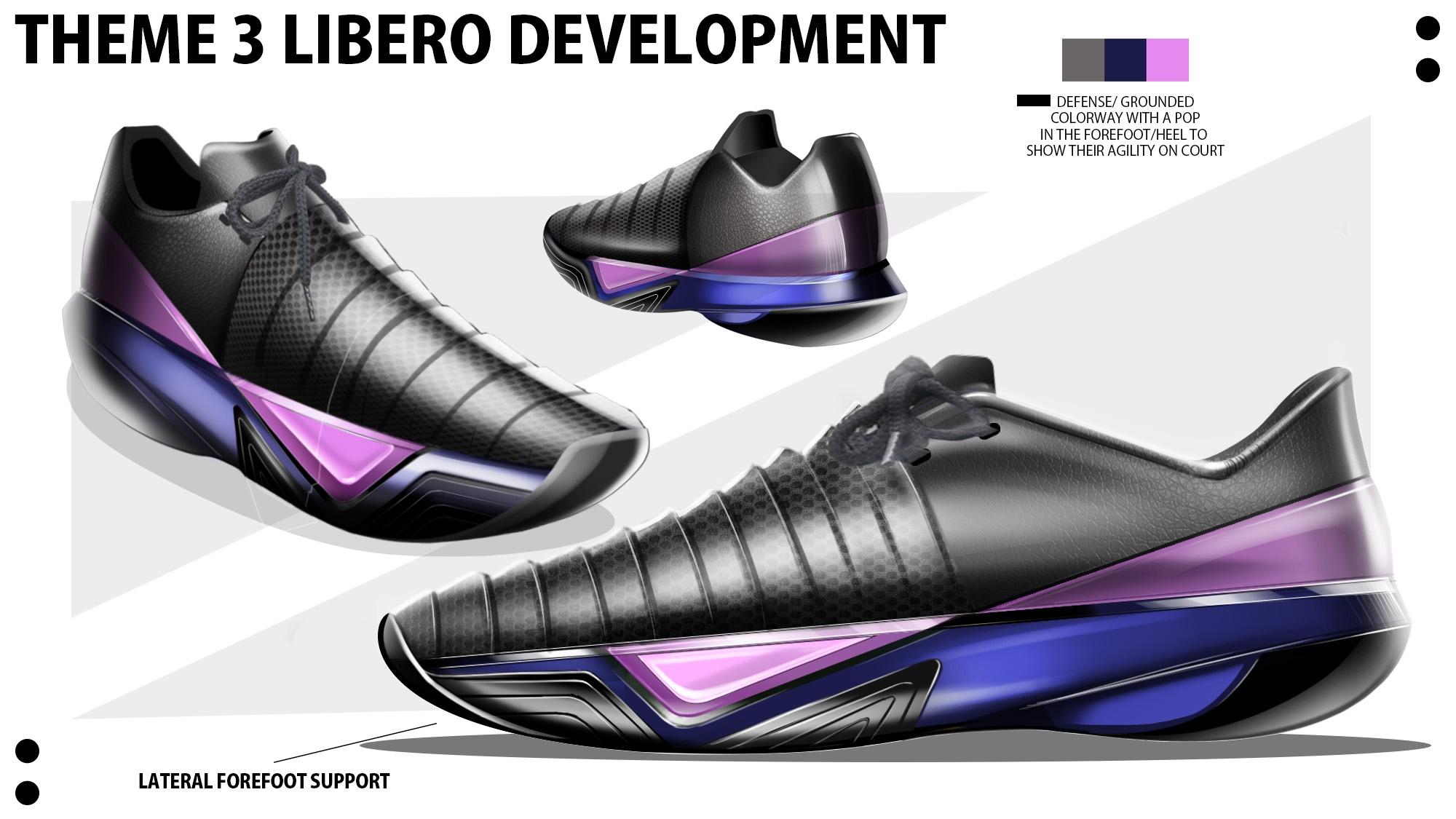 Description My project is a volleyball shoe designed for a women's foot because majority of shoes that are worn for women's volleyball are men's sport shoes. However men's foot shape and a women's foot is different, a women's forefoot is wider and their heel is more narrow compared to a men's foot. Also wanting to target the different roles in volleyball because each role, from the movement and functional needs of the foot is different.