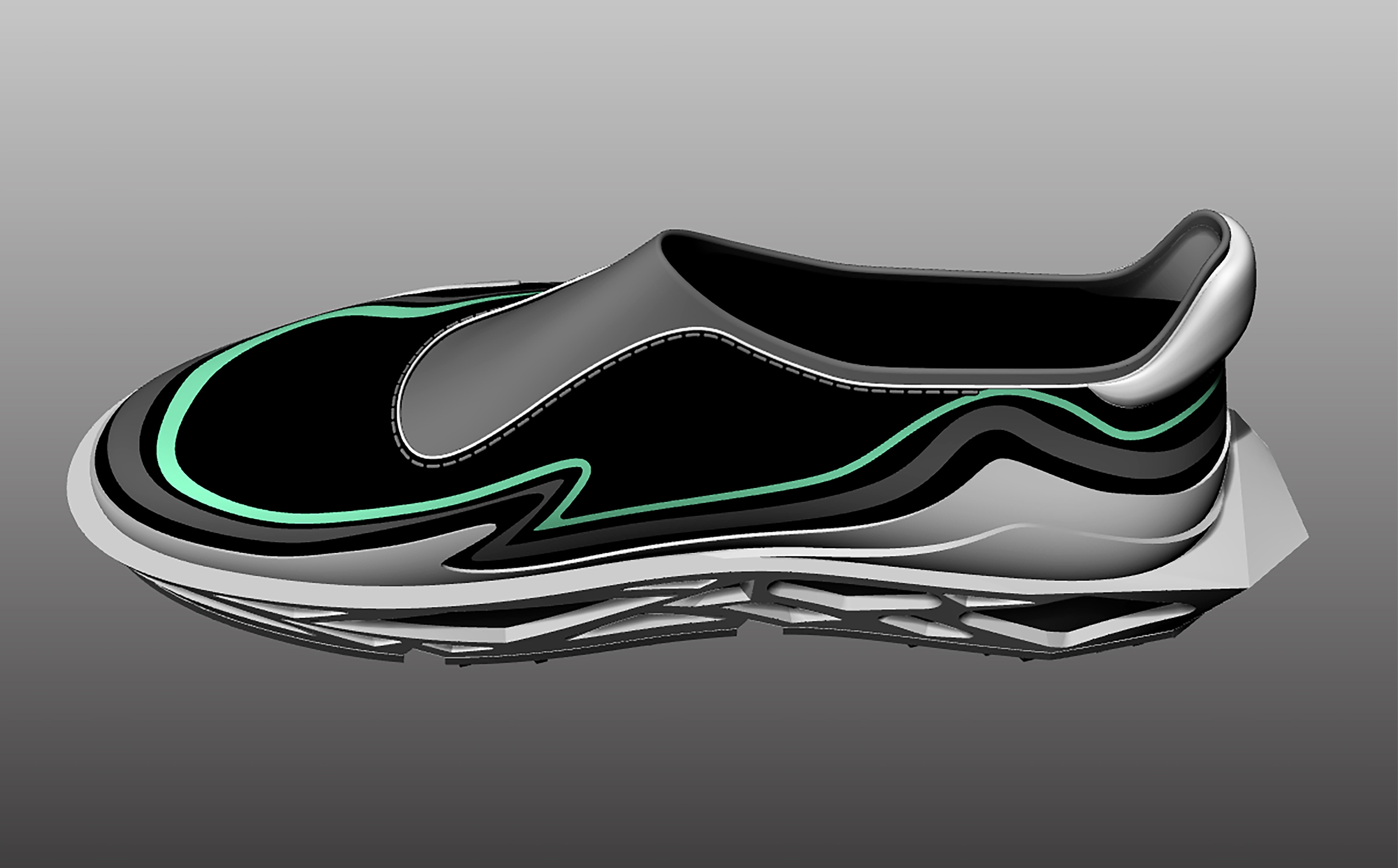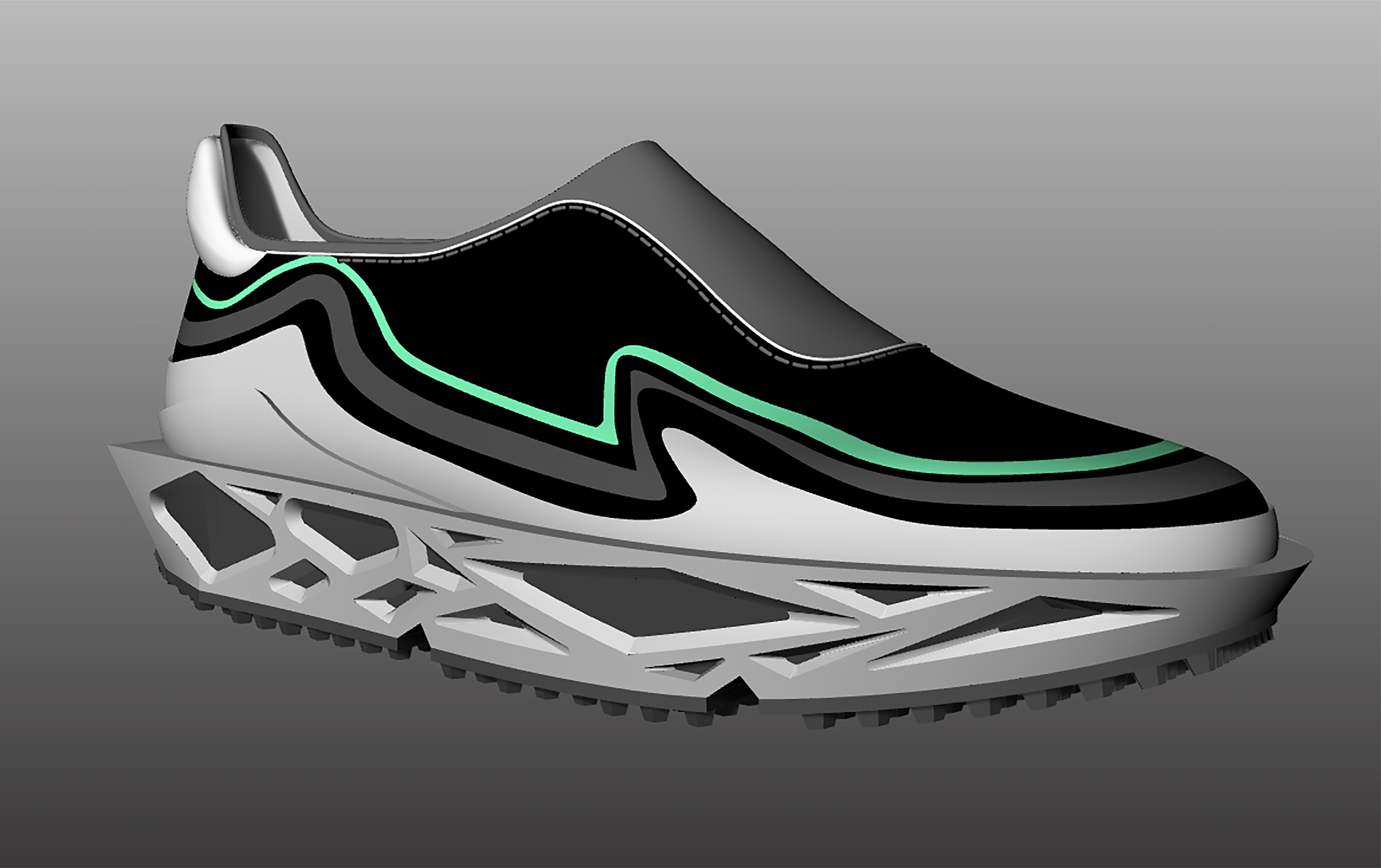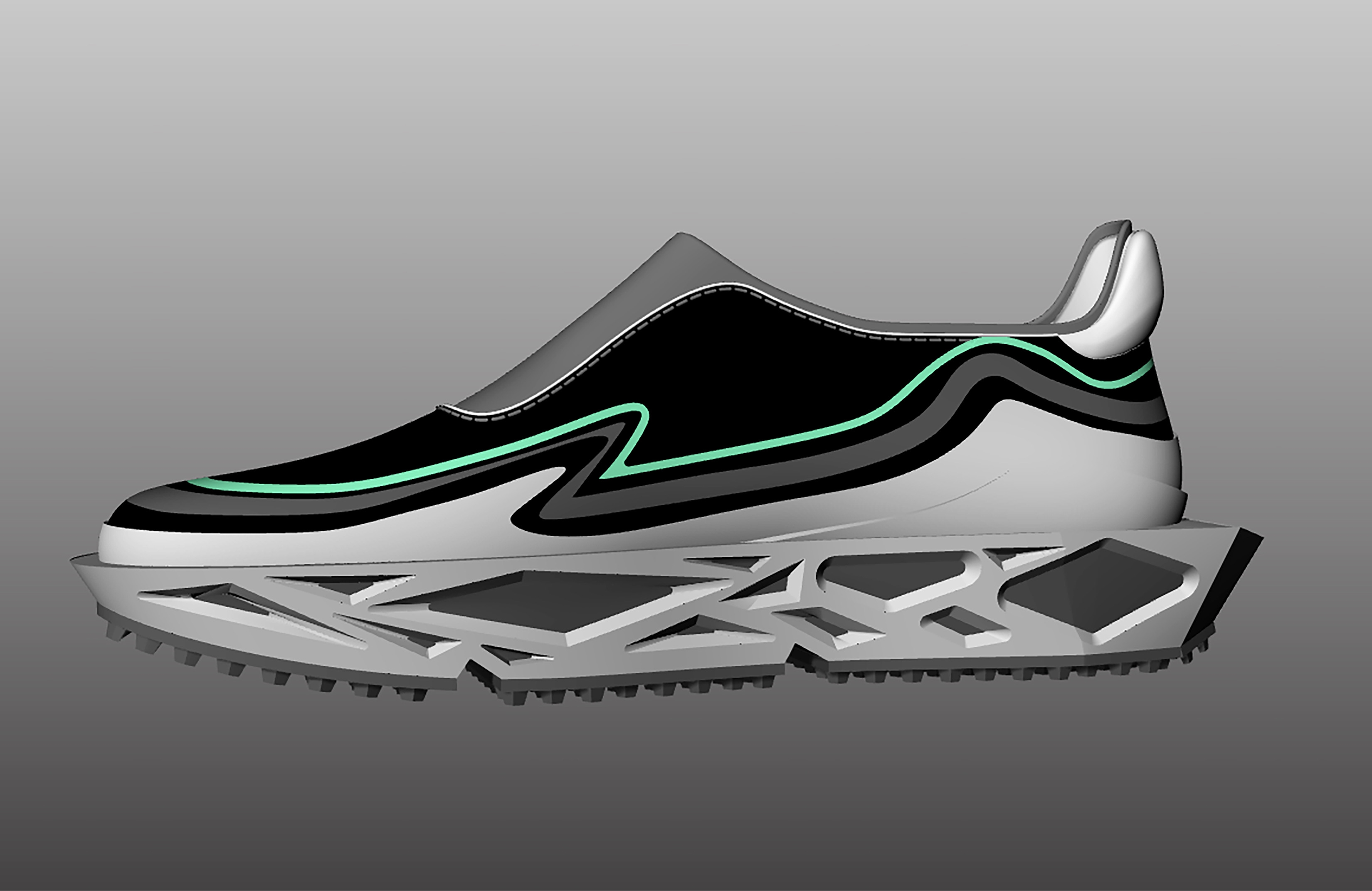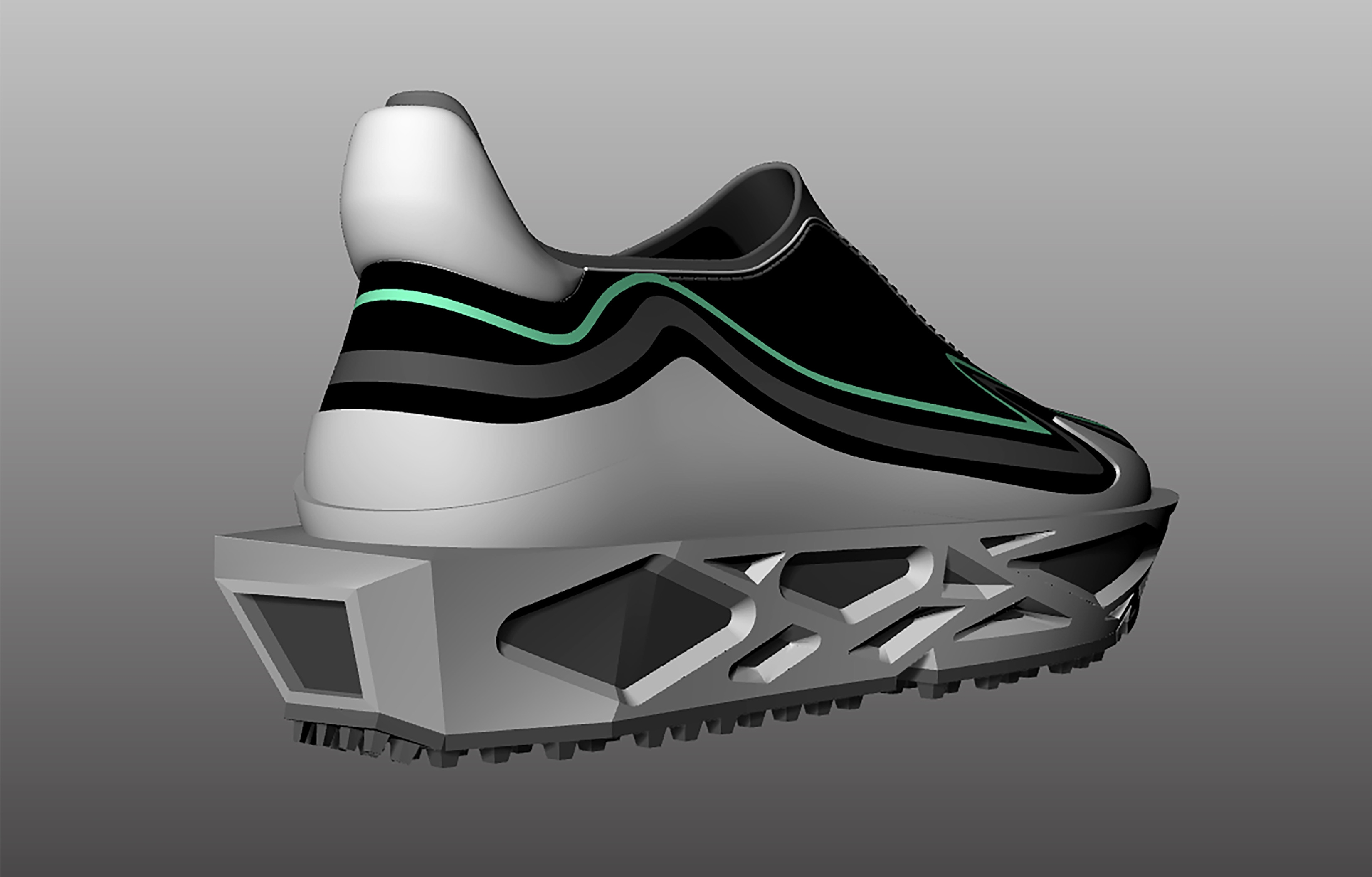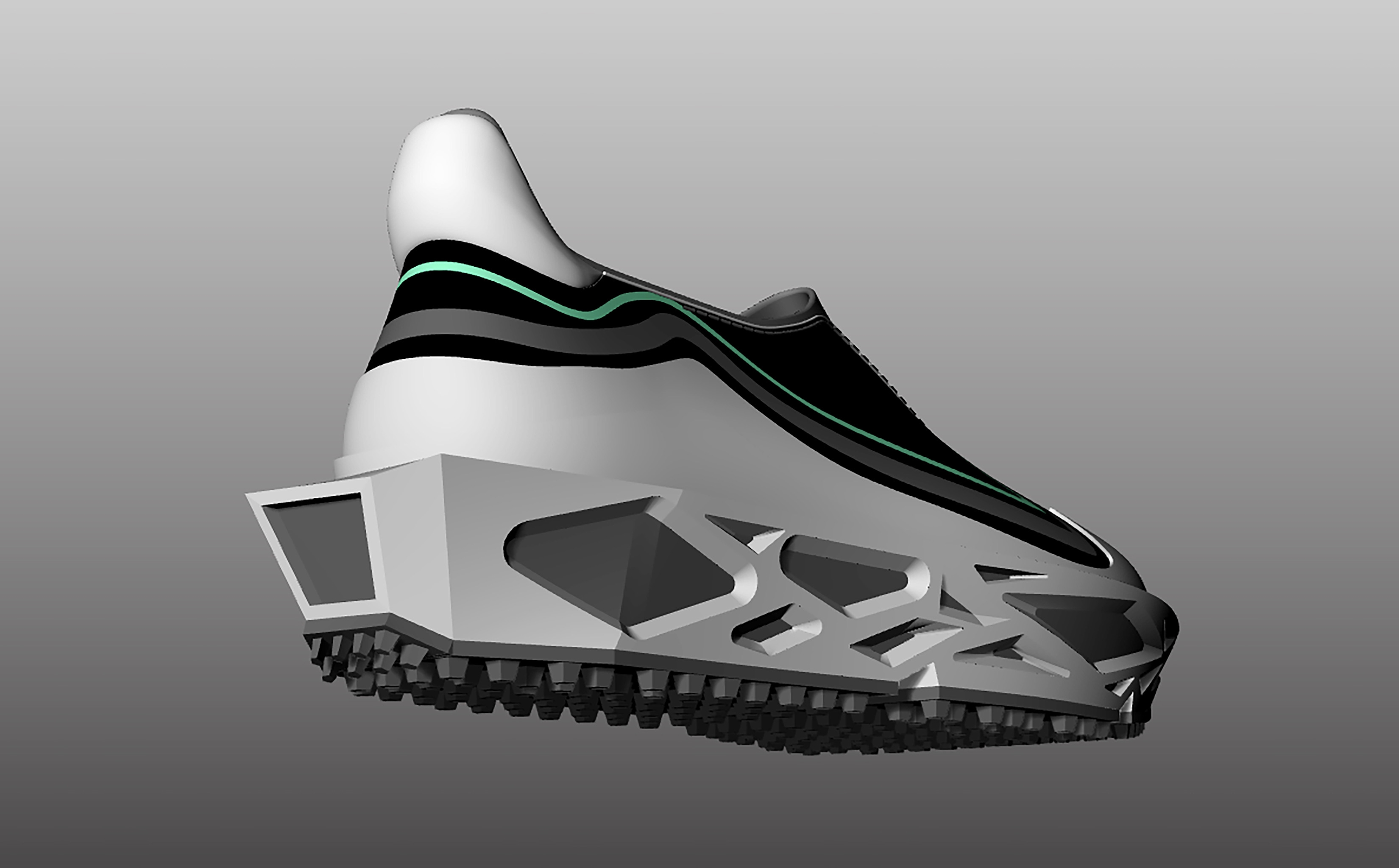 Upper Design: The smooth, minimalist upper contrasts sharply with the intricate sole. The fluid lines break away from traditional brutalist rigidity, adding a futuristic edge while maintaining a structured aesthetic.