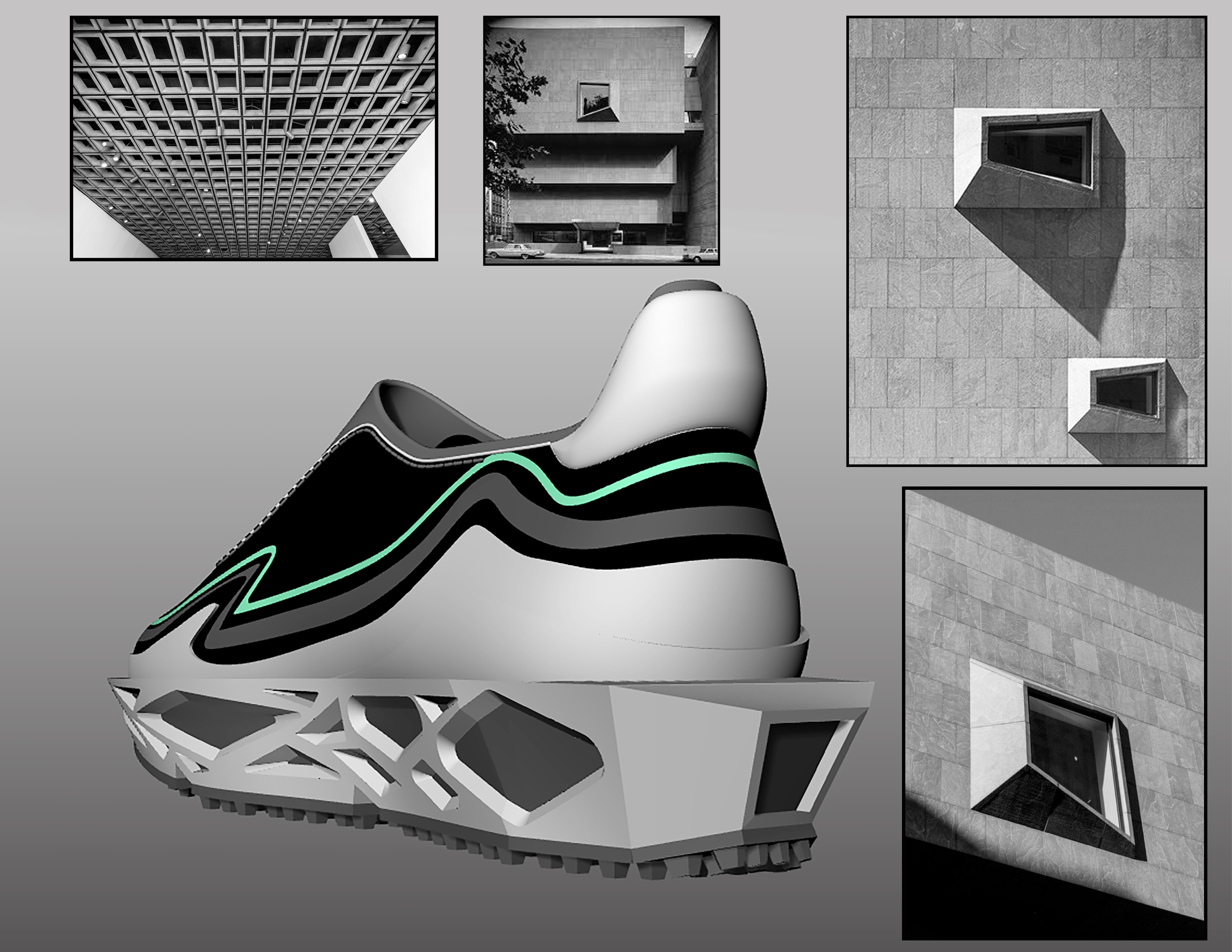 Sole Structure: The midsole and outsole resemble a geometric lattice, evoking the skeletal, exposed structure often seen in brutalist architecture. It looks inspired by cantilevered and modular concrete forms, similar to the Whitney Museum’s inverted facade.